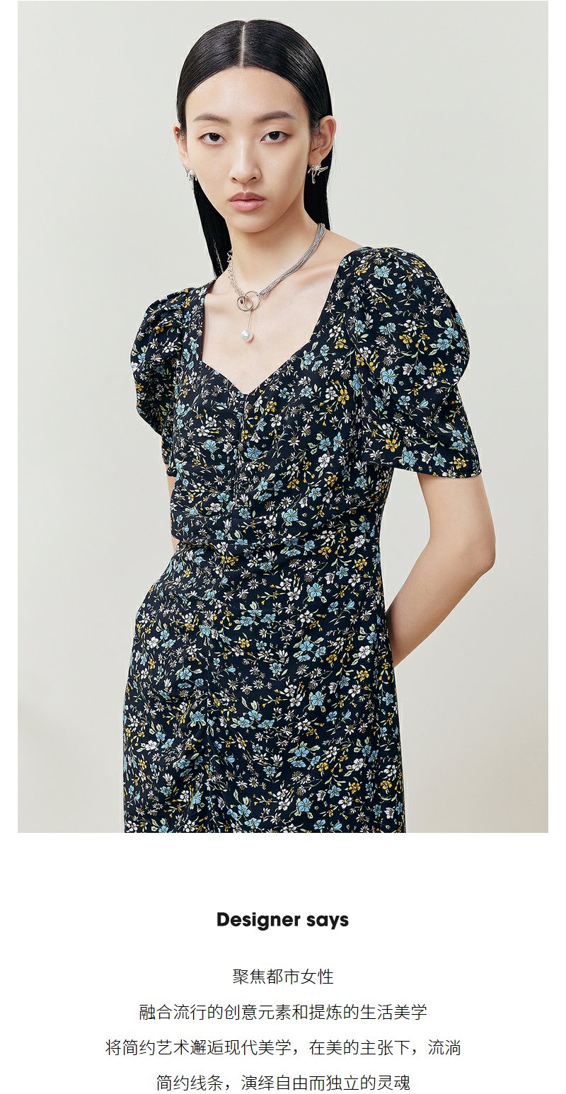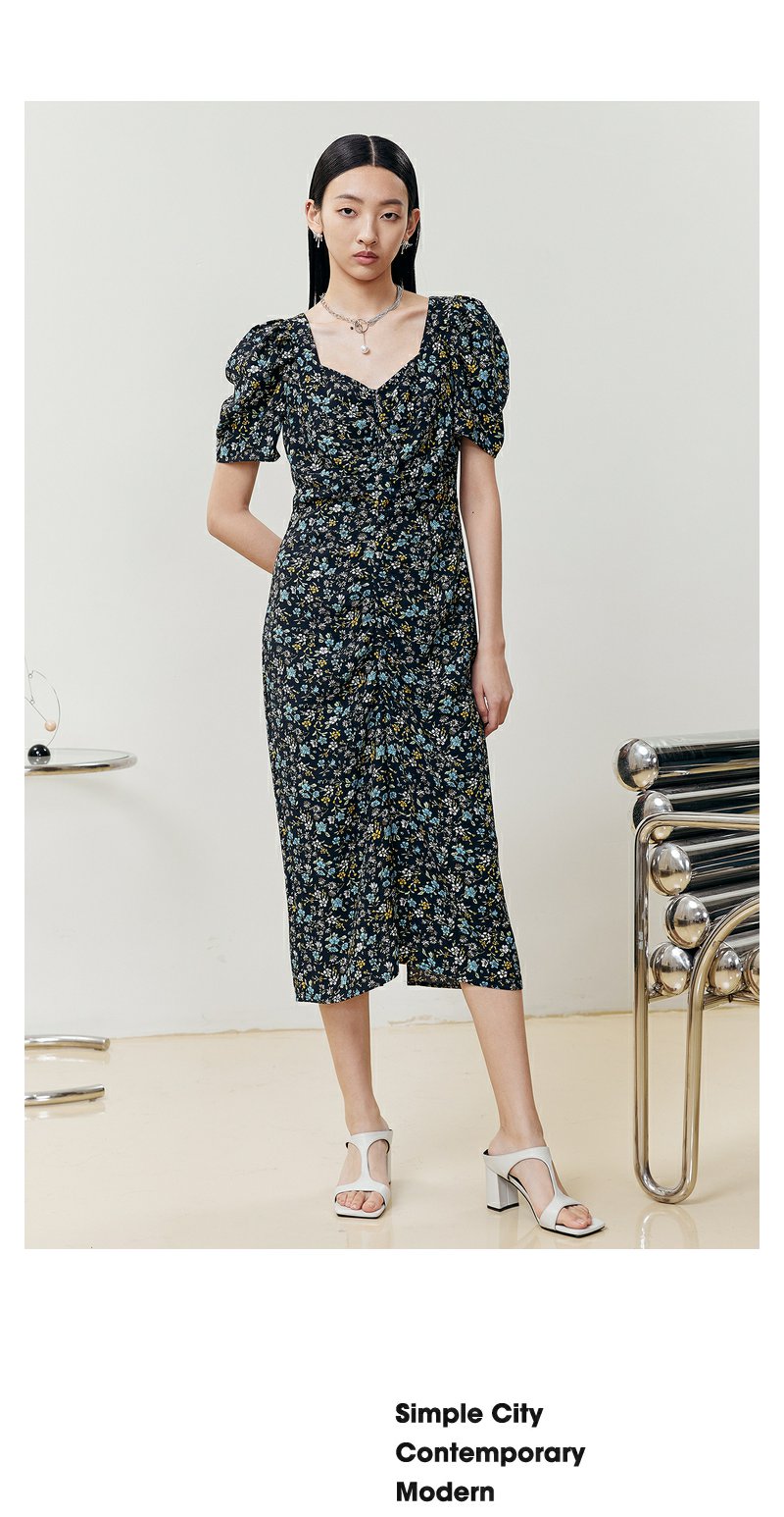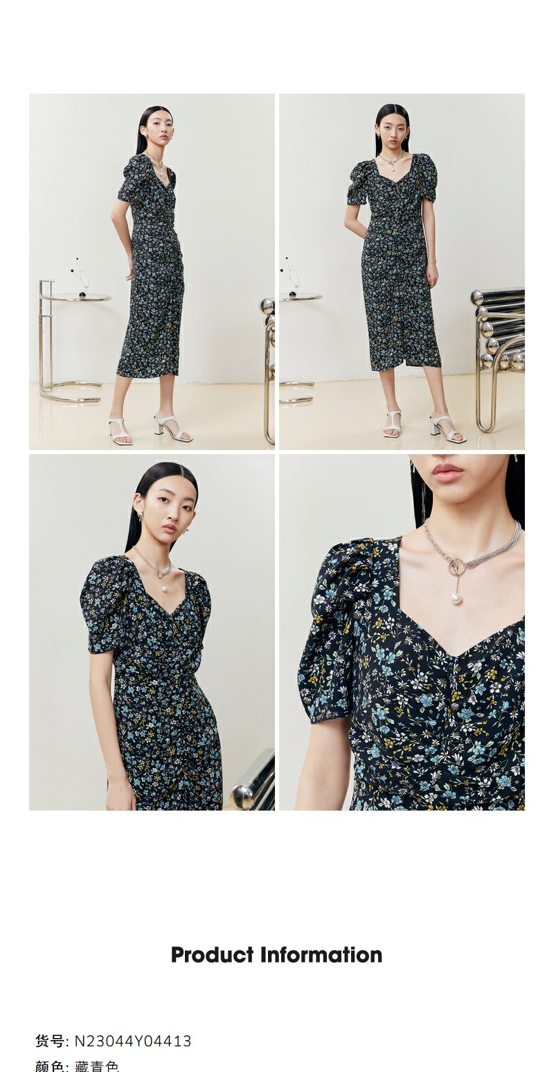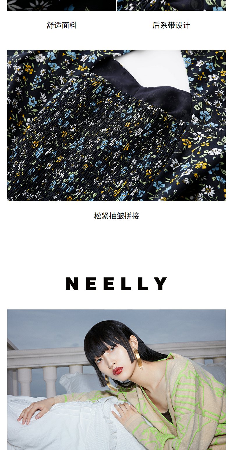 NEELLY纳俪商场同款碎花连衣裙女中长款抽褶拼接泡泡袖A字茶歇裙N23044Y04413