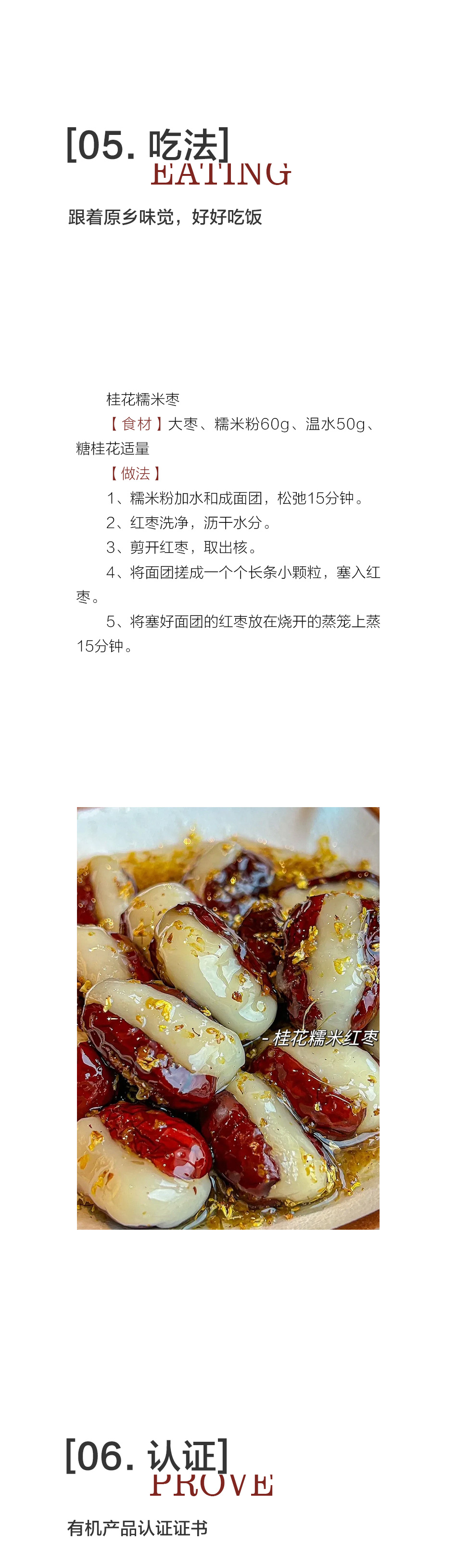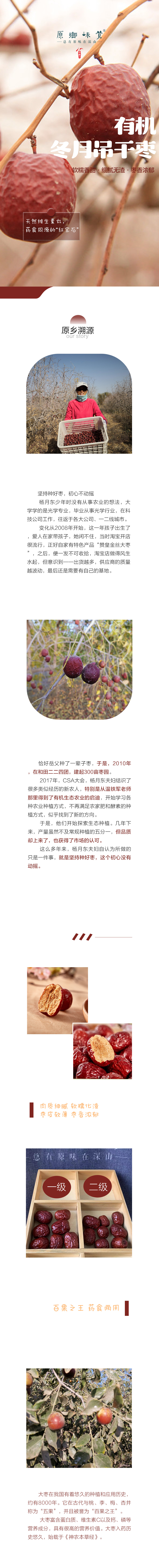 【新农人】:张彦敏、杨月东 【规格】:一级275g/袋、二级300g/袋 【配料】:红枣 【生产地址】:新疆维吾尔自治区和田市昆玉市 【生产方式】:选育河北的“赞皇金丝大枣”品种,2017年开始遵循自然农法种植,除草保墒,羊粪堆肥,坚持天然授粉自然坐果,树上吊干,连续六年通过CSA联盟农残检测,并取得有机认证 【贮存方式】:阴凉干燥处,夏季冰箱冷藏 【保质期】:12个月 【购买须知】: 1、 红枣有核,食用时请勿吞食果核,儿童请在成人监护下食用。 2、受天气或库存等原因影响快递可能偶有耽误,急单请发货前咨询客服。 3、已发货后不接受没有沟通的退款申请。 4、快递抵达后请尽快取件。