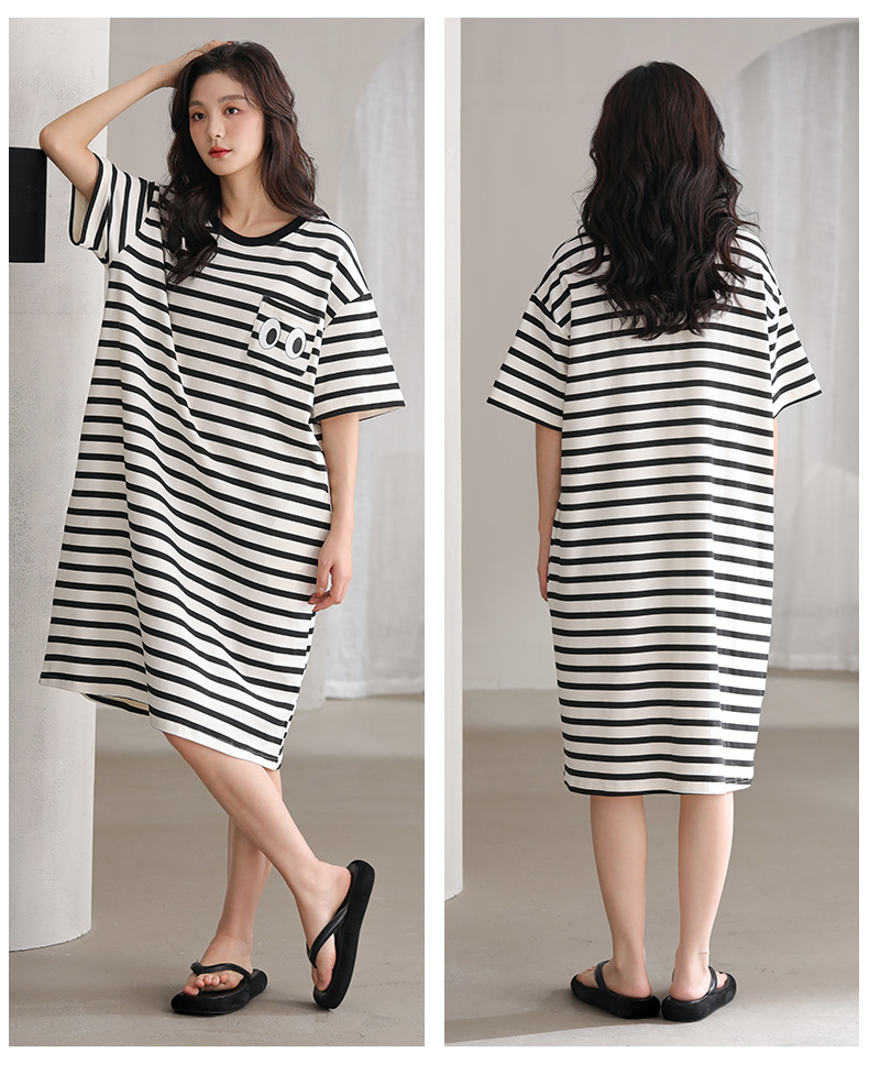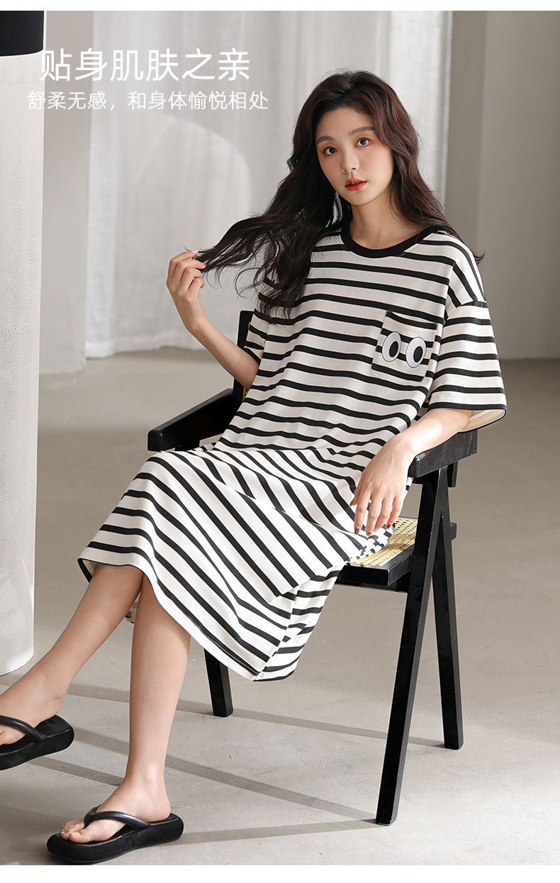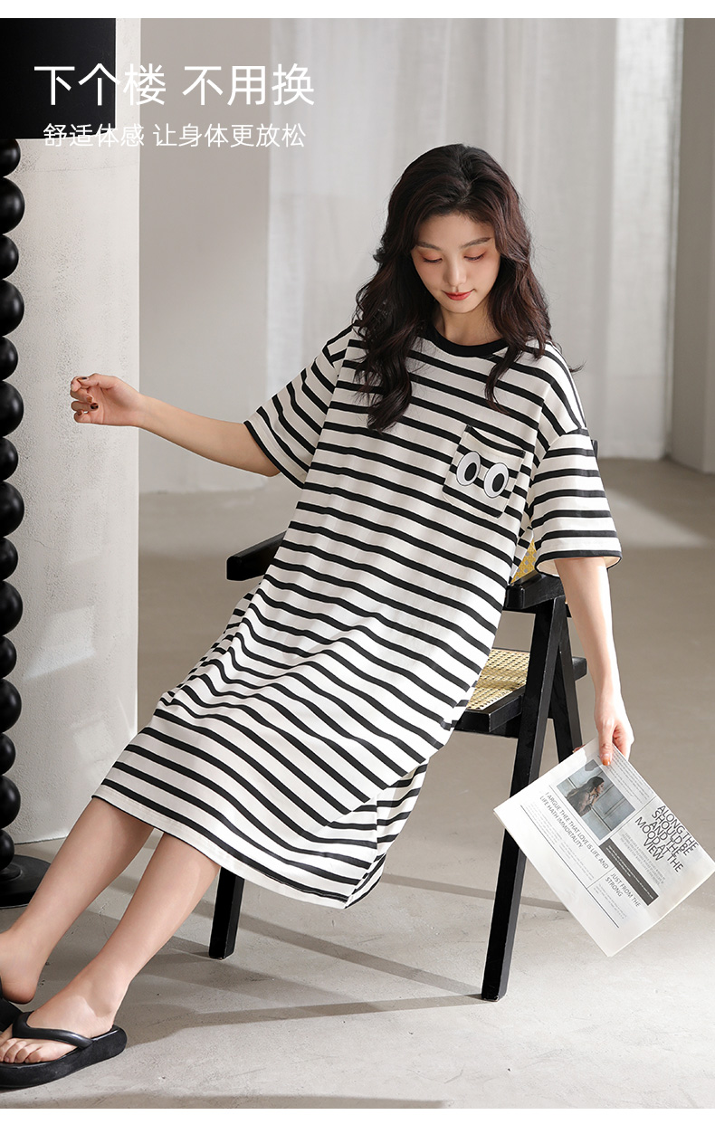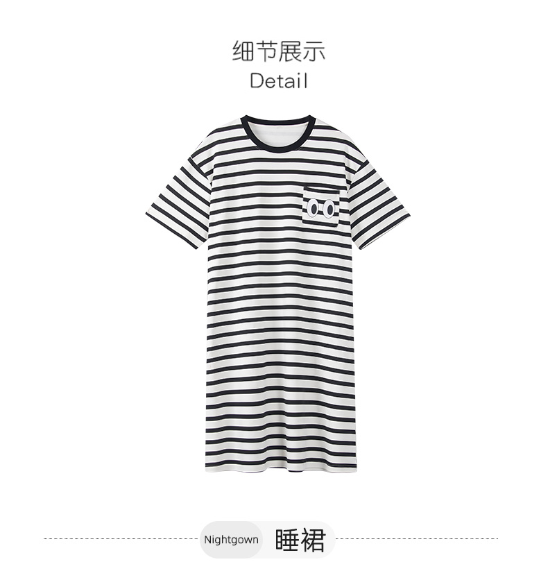 洁丽雅新款短袖睡衣条纹睡裙夏季夏天大码宽松中长款薄款外穿睡裙