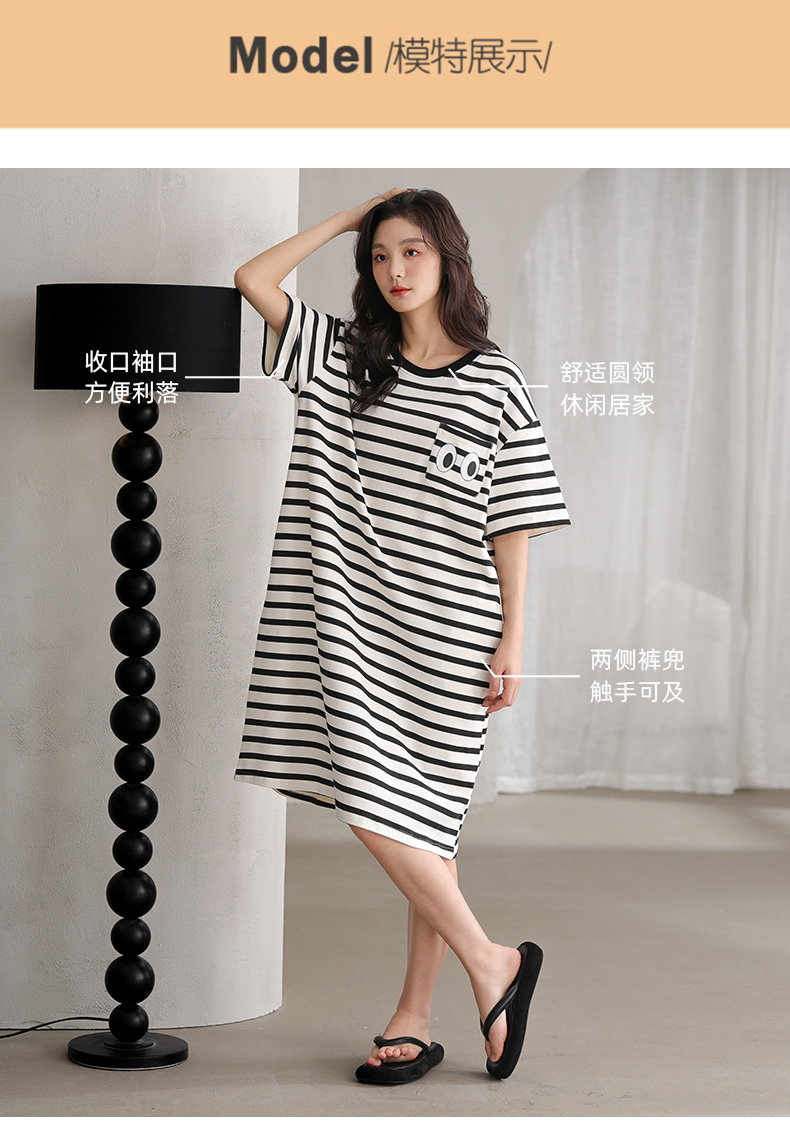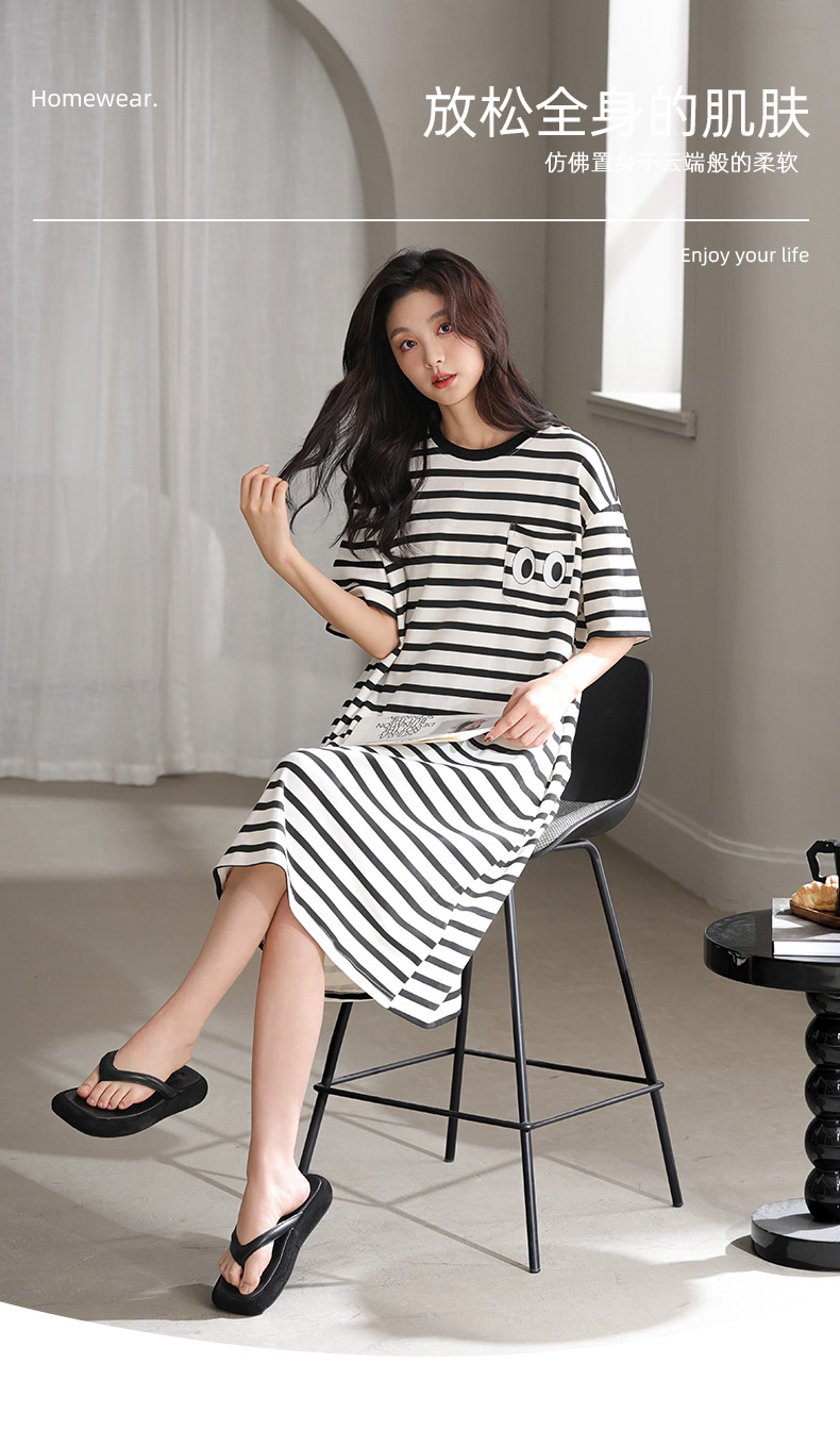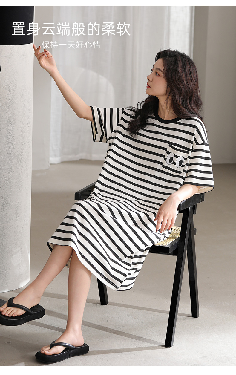 洁丽雅新款短袖睡衣条纹睡裙夏季夏天大码宽松中长款薄款外穿睡裙