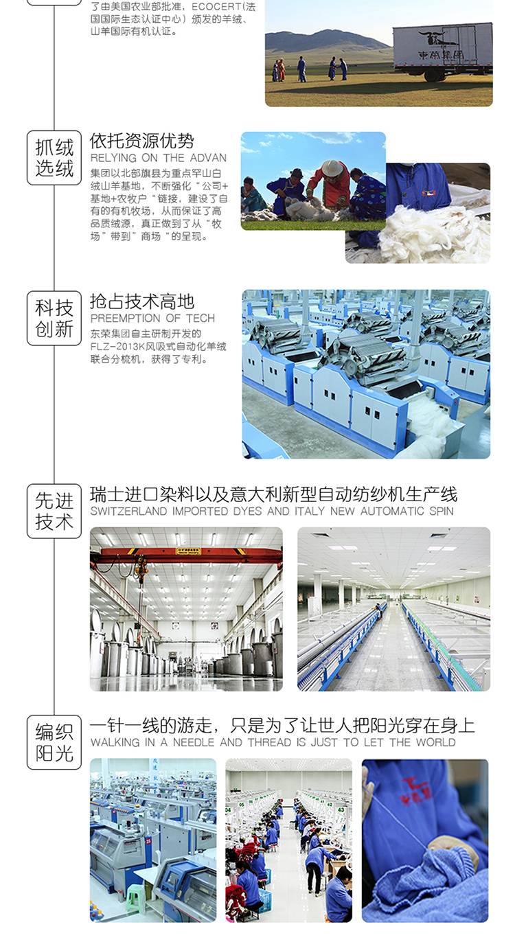 东黎羊绒是赤峰东荣集团自主品牌,自有牧场/羊绒制品全产业链优势,实现了羊绒从“牧场”到“商场”的华丽转变。