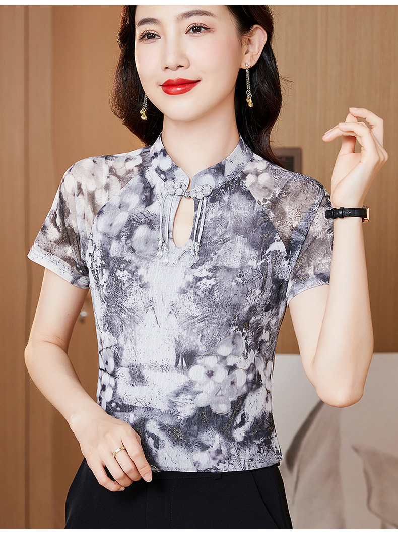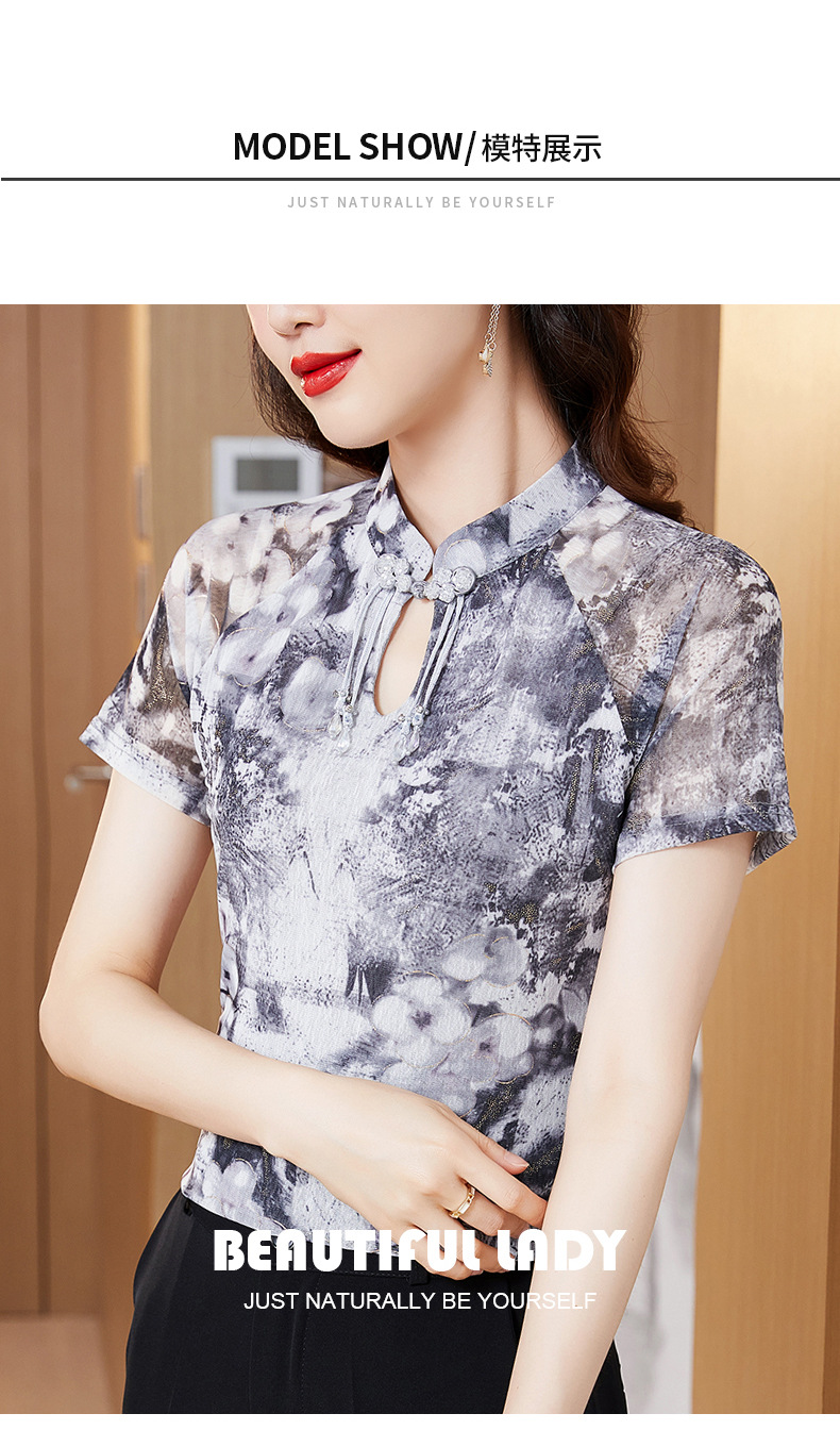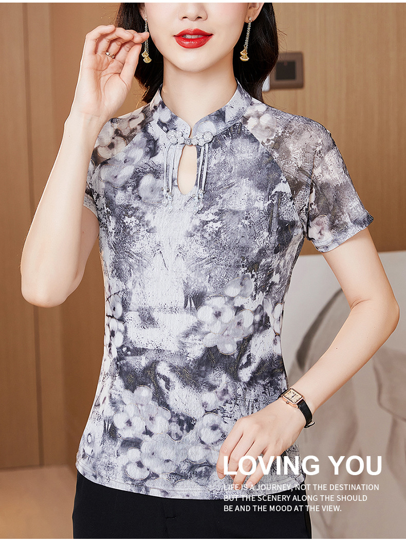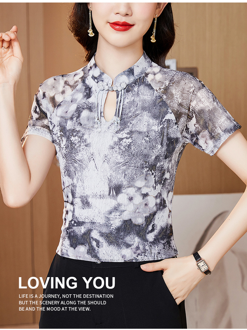 复古盘扣短袖T恤女上衣,夏季新款烫金麻纱印花洋气网纱小衫LA36725