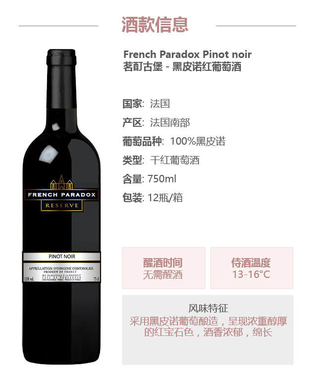 【双支特惠装】茗酊古堡-黑皮诺红葡萄酒 French Paradox - Pinot Noir 750ml*2