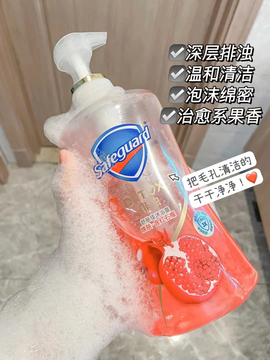 这款舒肤佳红石榴沐浴露,它的味道就很像会爆浆的石榴加橙子,甜而不腻的清新果香,用的时候挤一丢丢拿起泡网能打出很绵密的泡沫,涂在身上甜甜的,很好冲洗,洗完后身上皮肤不会干燥,反而还很嫩滑香软。👄👄👄👄