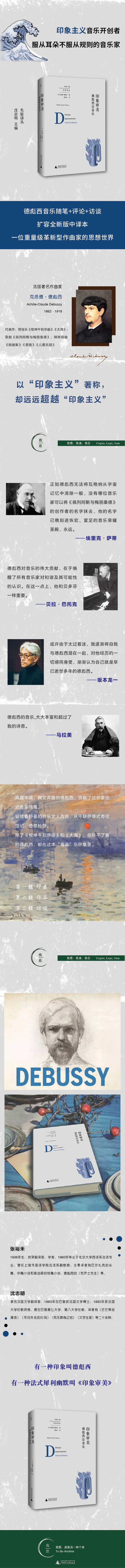本书是法国著名作曲家德彪西的音乐评论文集,收录了他从1901年起为报纸杂志写的音乐评论专栏文章。德彪西以歌剧《佩列阿斯与梅丽桑德》成为西方乐坛的耀眼新星,钢琴组曲《版画集》和交响诗《牧神午后序曲》《大海》等作品更是为他赢得了印象主义音乐开创者的世界性声誉。本书中的文章都是在此背景下写作的,在当时具有相当大的影响力。读者通过这些文章,既可以了解德彪西的音乐思想和审美观点,也可以回顾法国音乐史以及西方现代音乐史上这一重要转折时期。