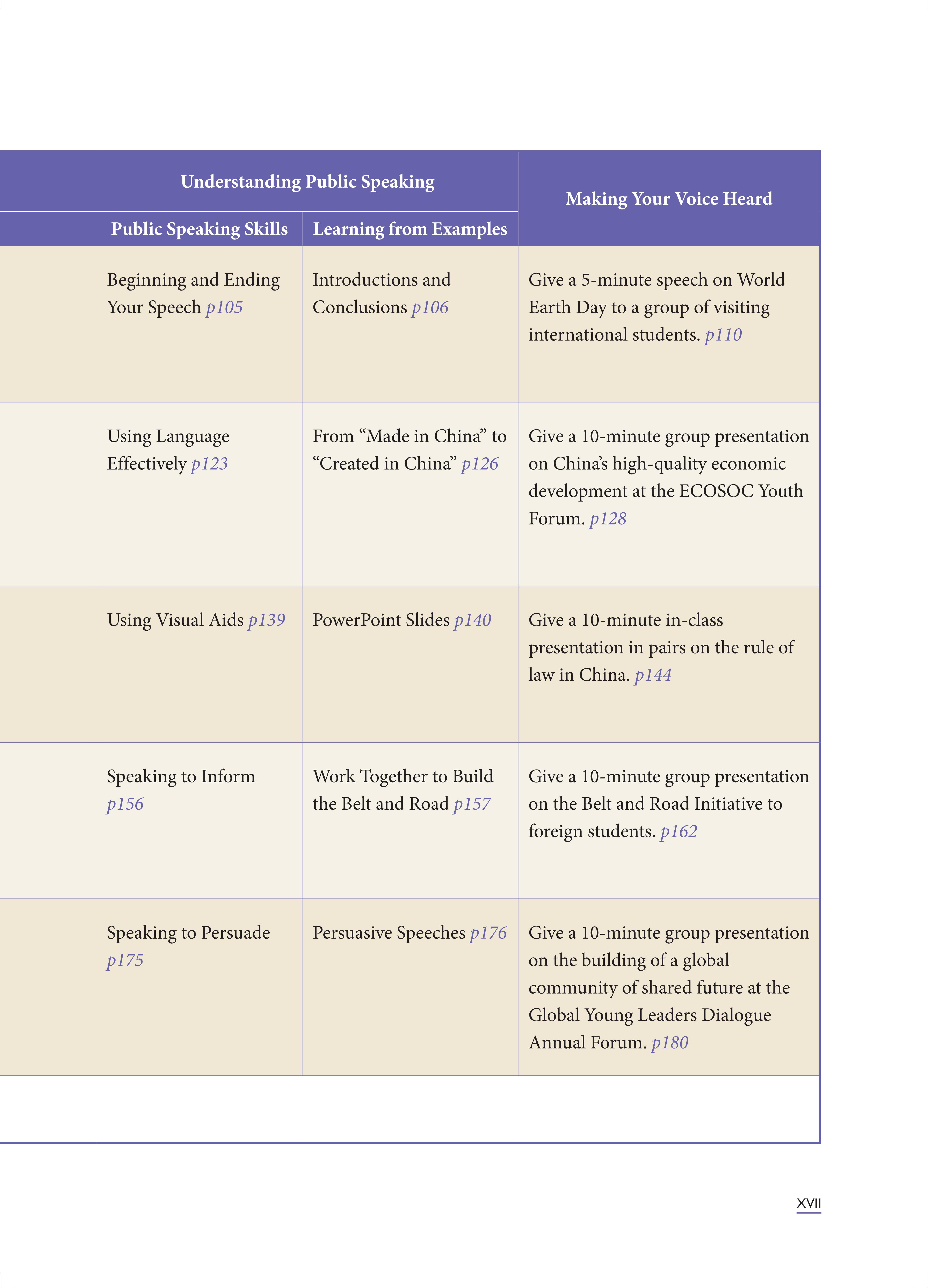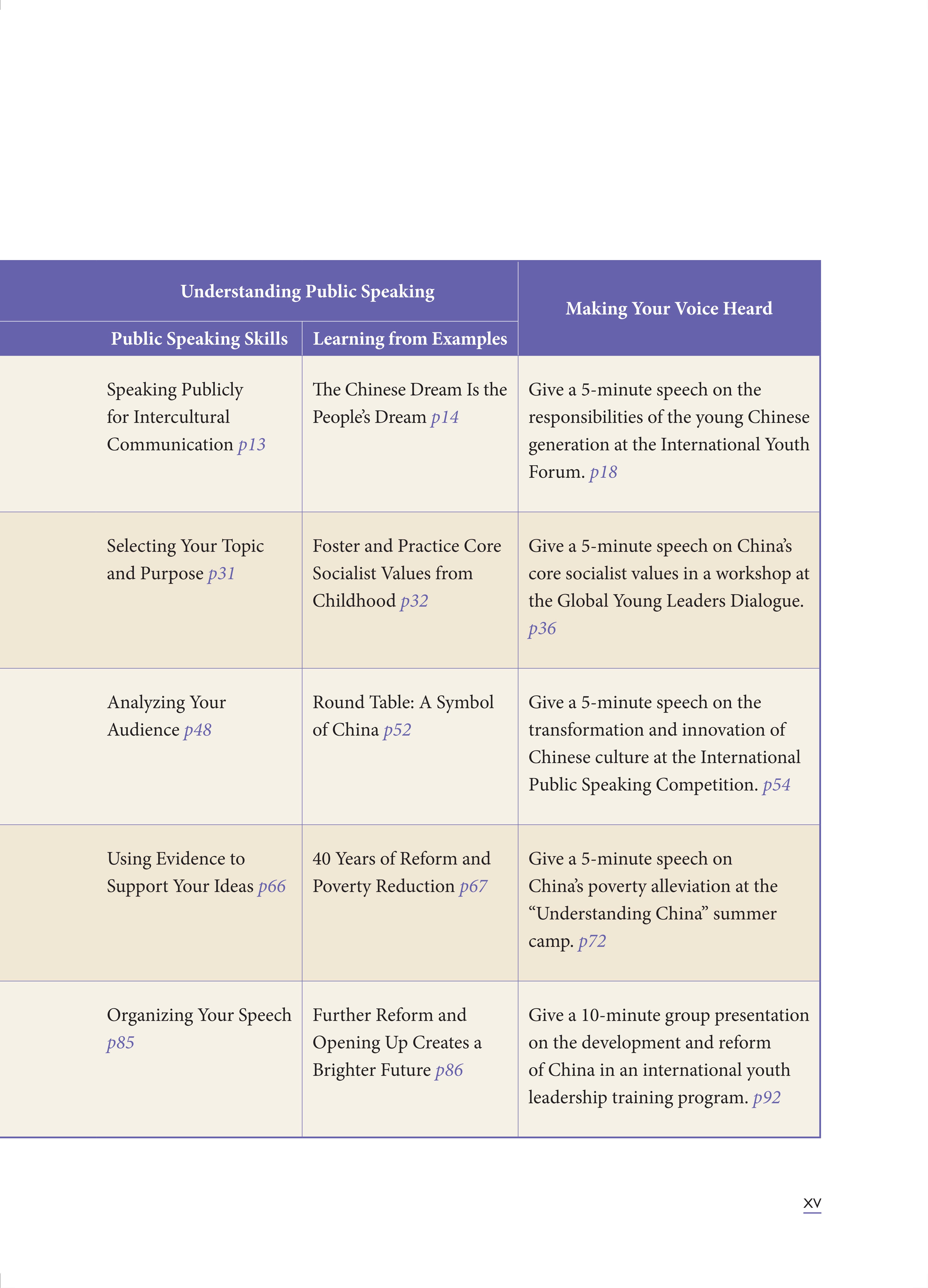 《英语演讲教程》属于“高等学校外国语言文学类专业‘理解当代中国’系列教材”,可供高校英语类专业本科4—7学期开设的高级口语或演讲课程使用。本教材将习近平新时代中国特色社会主义思想的学习与演讲能力的训练相结合,通过“理解当代中国”“传播中国声音”两个主要板块和演讲策略的讲解与演练,从分项输入到融合输出,达成理解中国、讲述中国的教学目标。