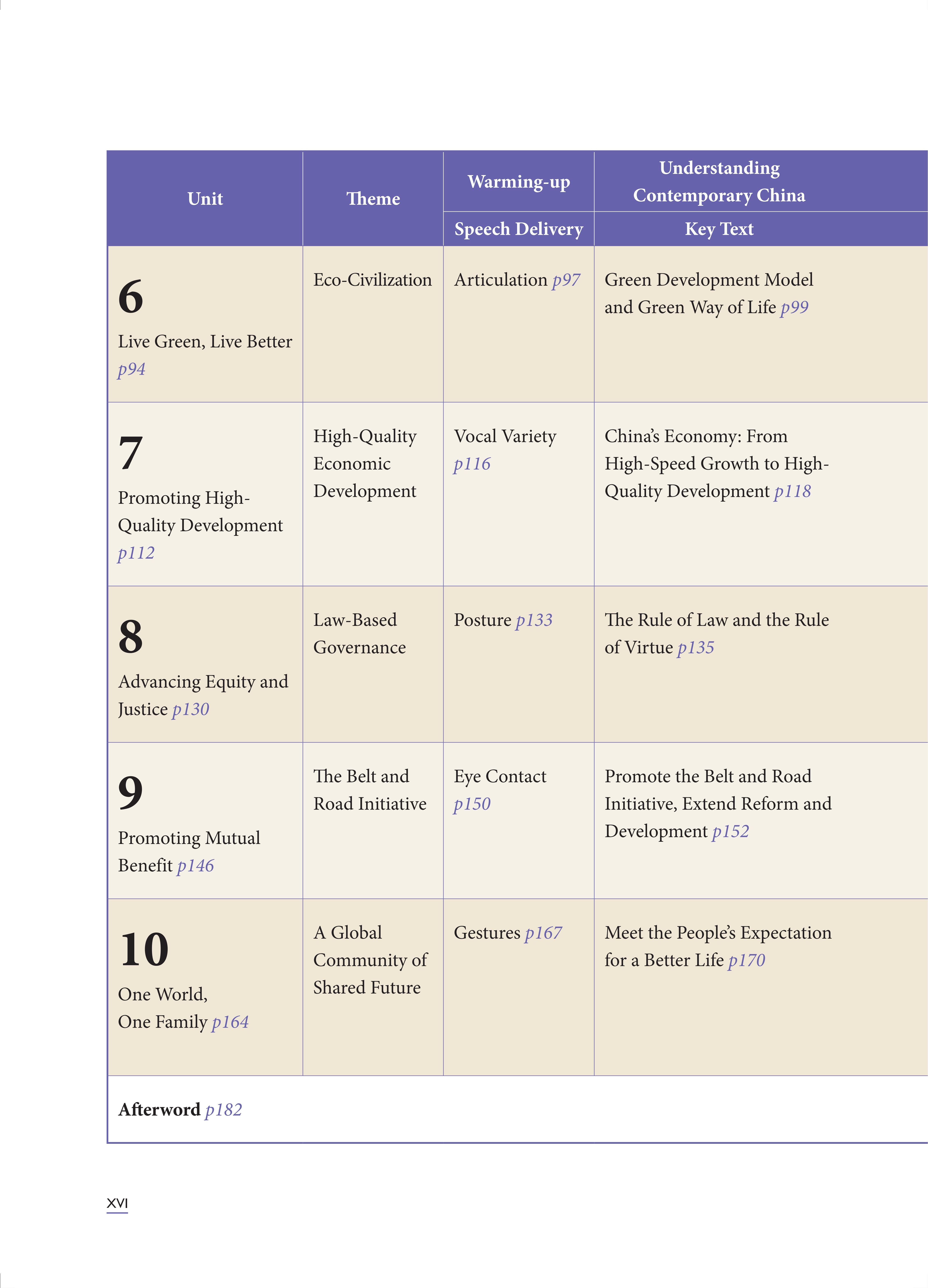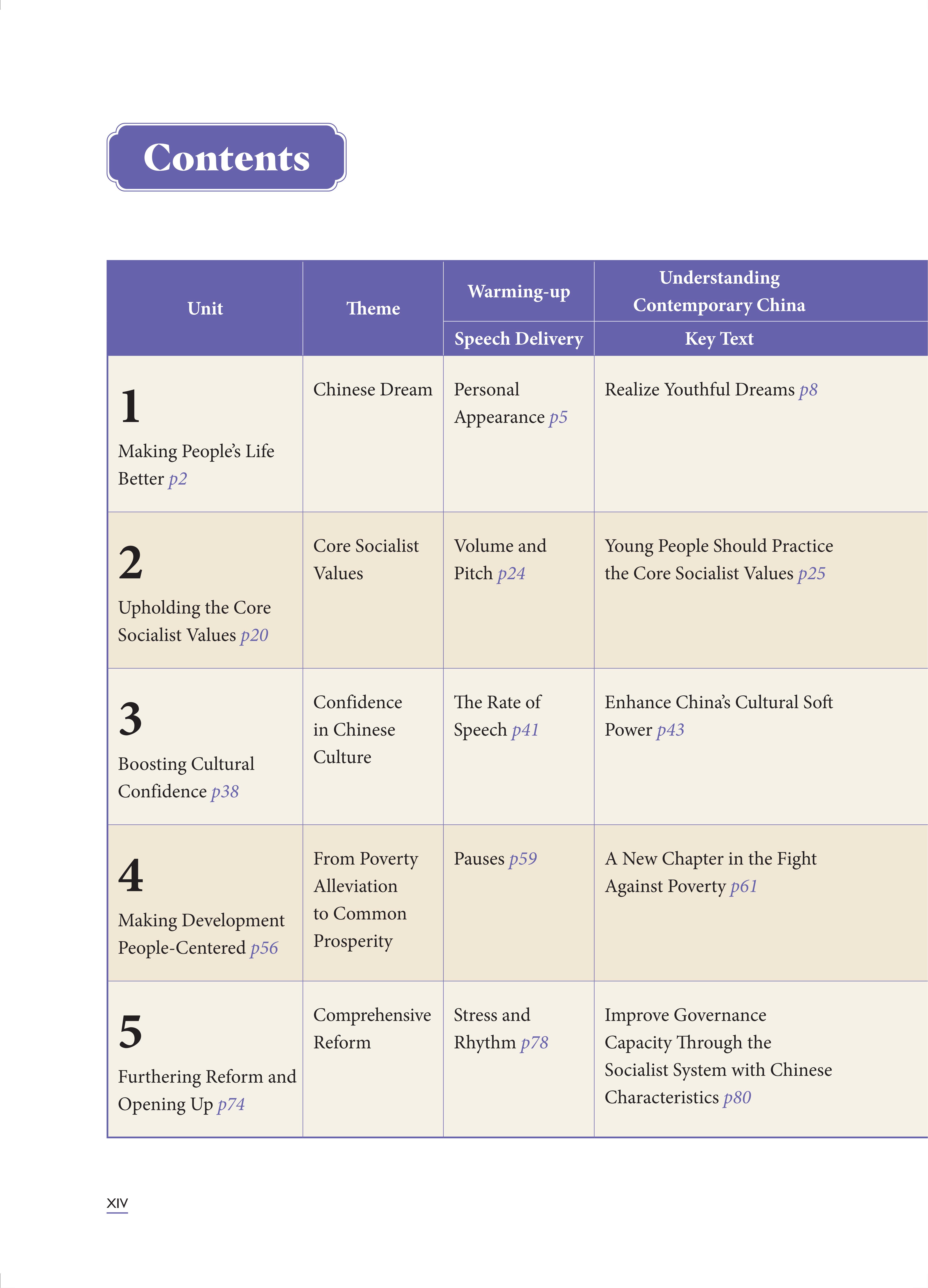 书稿共10个单元。各单元主要课文选自《习近平谈治国理政》第一卷、第二卷、第三卷,包括10个主题:中国梦、社会主义核心价值观、从扶贫与共同富裕、全面深化改革、生态文明建设、经济高质量发展、依法治国、“一带一路”倡议和人类命运共同体。
