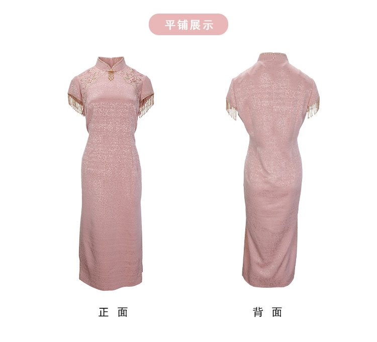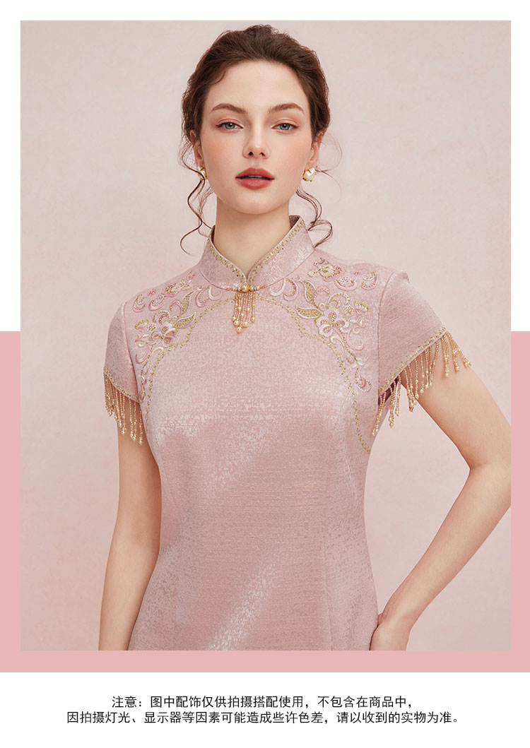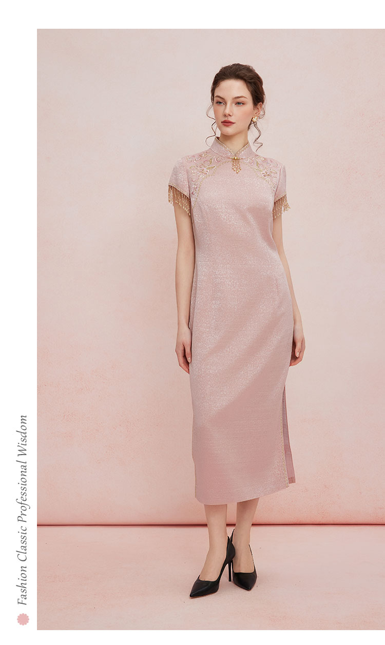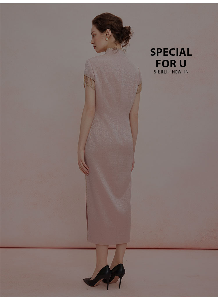 QB810斯尔丽25新款提花精致绣花改良旗袍领口袖口流苏钉珠礼服连衣裙