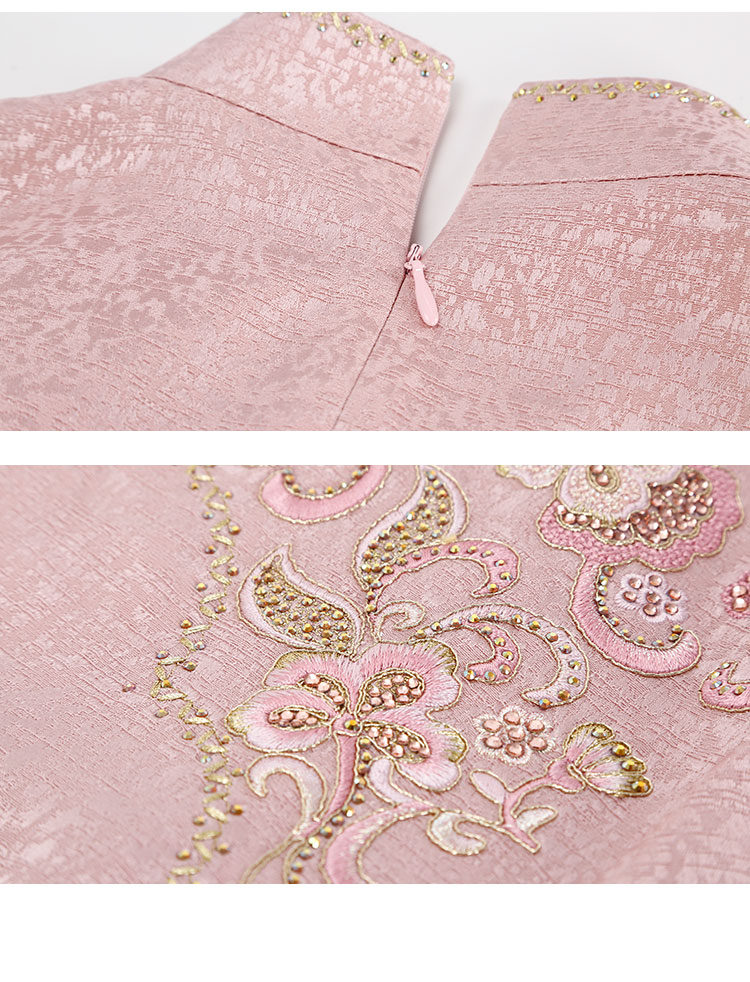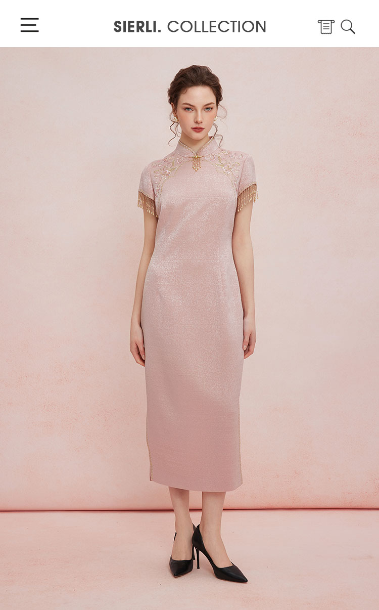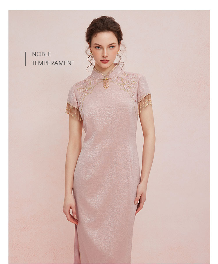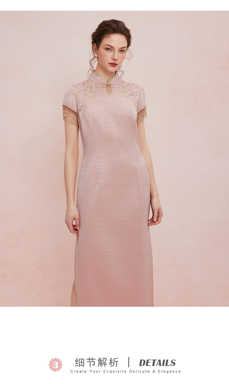QB810斯尔丽25新款提花精致绣花改良旗袍领口袖口流苏钉珠礼服连衣裙