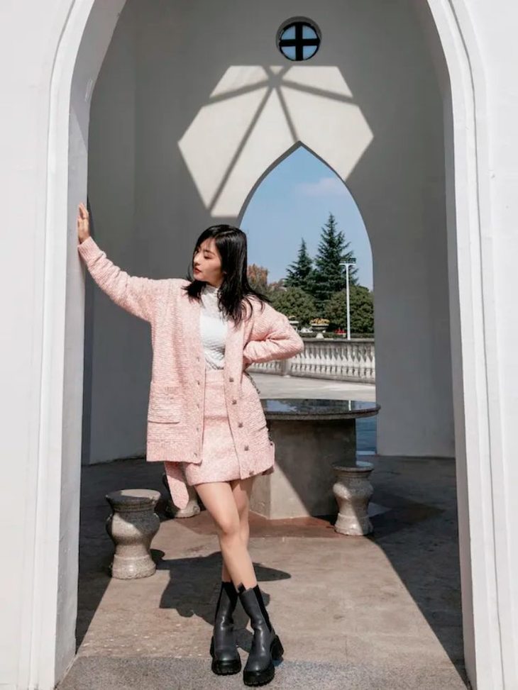 选择下装同色系的方式来增加下半身的面积,这样腿看起来就会更长更细。
