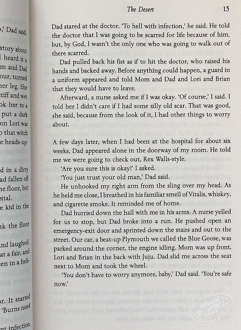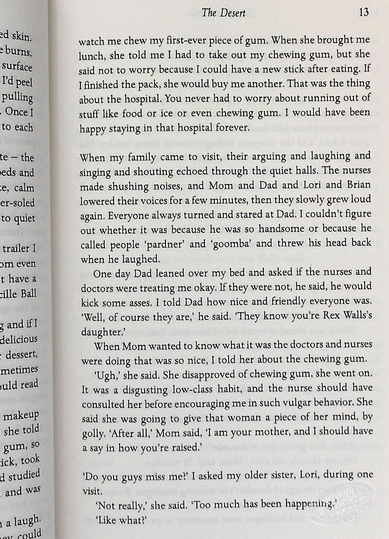 This is a startling memoir of a successful journalist's journey from the deserted and dusty mining towns of the American Southwest, to an antique filled apartment on Park Avenue. Jeanette Walls narrates her nomadic and adventurous childhood with her dreaming, 'brilliant' but alcoholic parents. At the age of seventeen she escapes on a Greyhound bus to New York with her older sister; her younger siblings follow later. After pursuing the education and civilisation her parents sought to escape, Jeanette eventually succeeds in her quest for the 'mundane, middle class existence' she had always craved. In her apartment, overlooked by 'a portrait of someone else's ancestor' she recounts poignant remembered images of star watching with her father, juxtaposed with recollections of irregular meals, accidents and police-car chases and reveals her complex feelings of shame, guilt, pity and pride toward her parents.