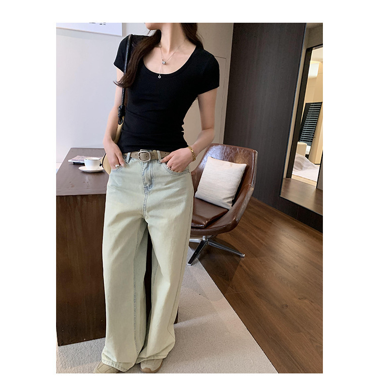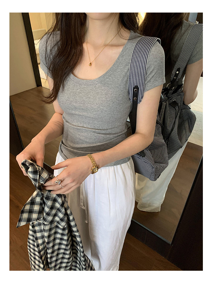 【显身材!透气舒适】辣妹正肩U领短袖T恤女春夏南油新款韩系修身小心机女装打底衫。xb