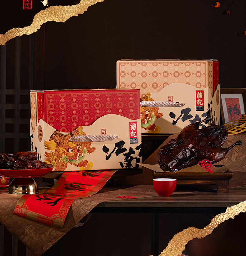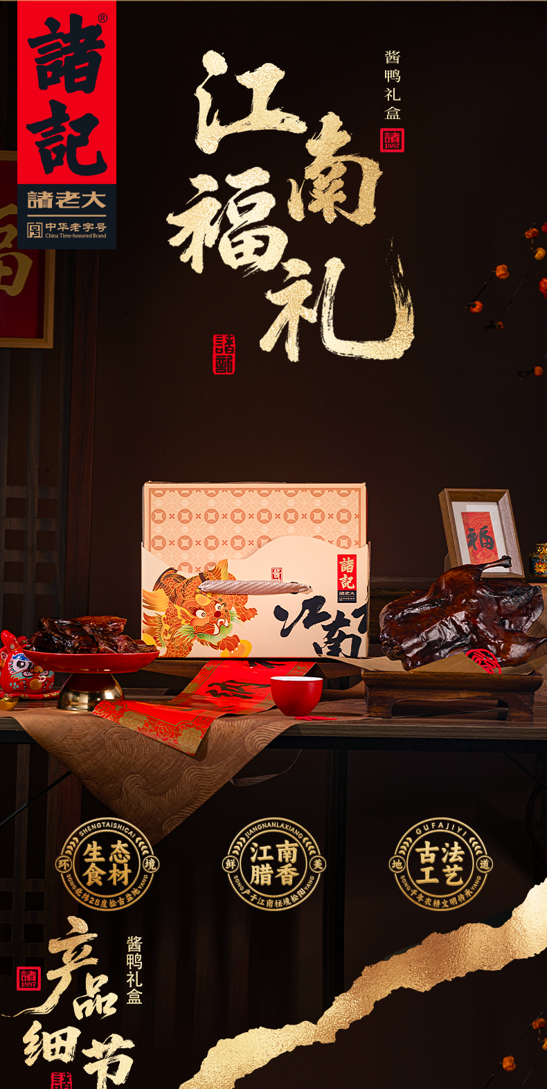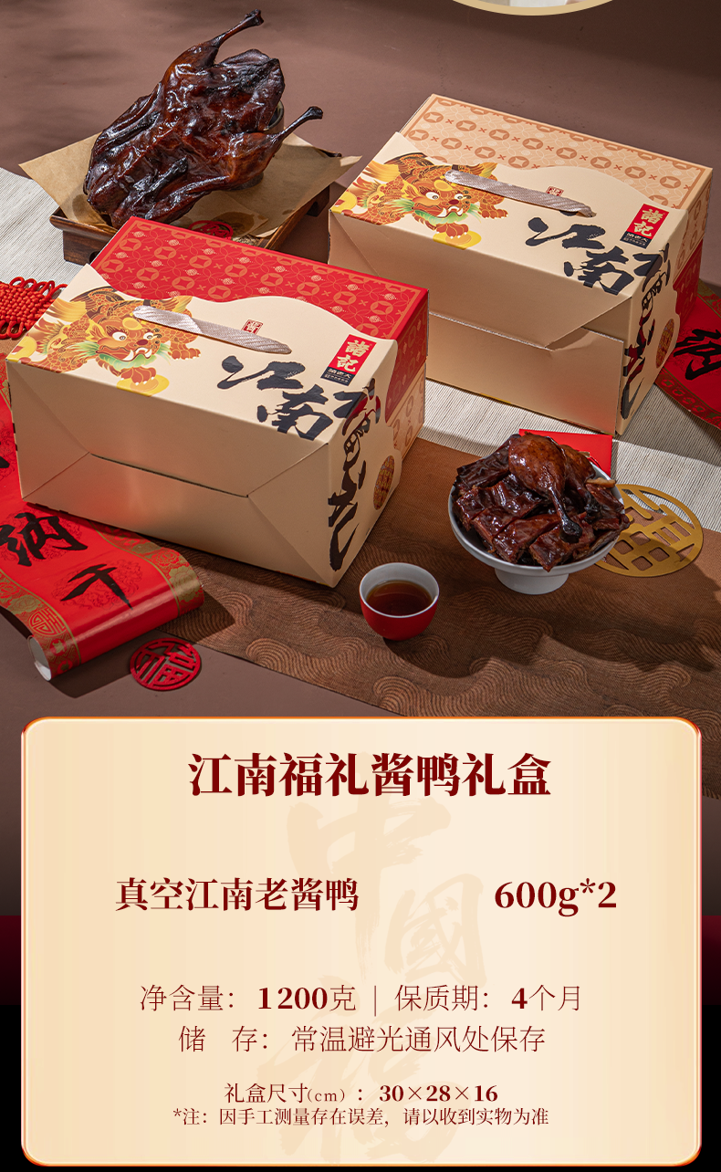 年夜饭---【江南福礼酱鸭礼盒】鸭肉在酱汁中缓慢吸收,呈现出深褐色的光泽,味道则是甜中带咸,香中有辣,层次丰富。鸭皮油亮入味,鸭肉酥烂不柴