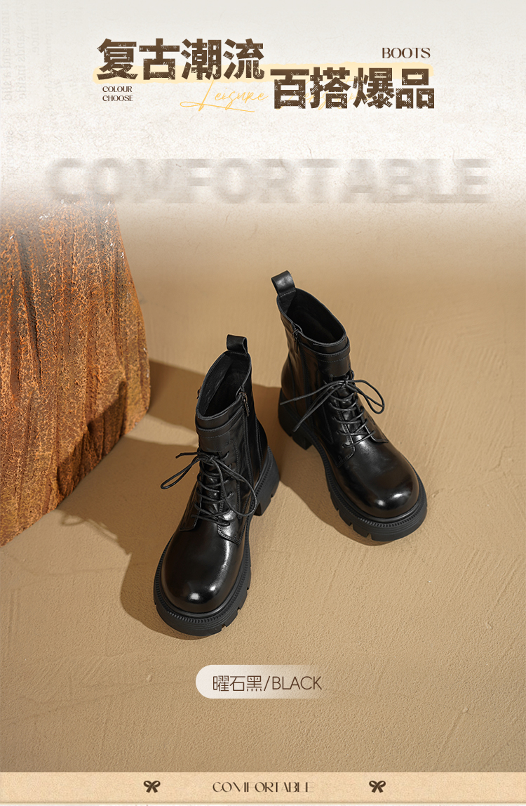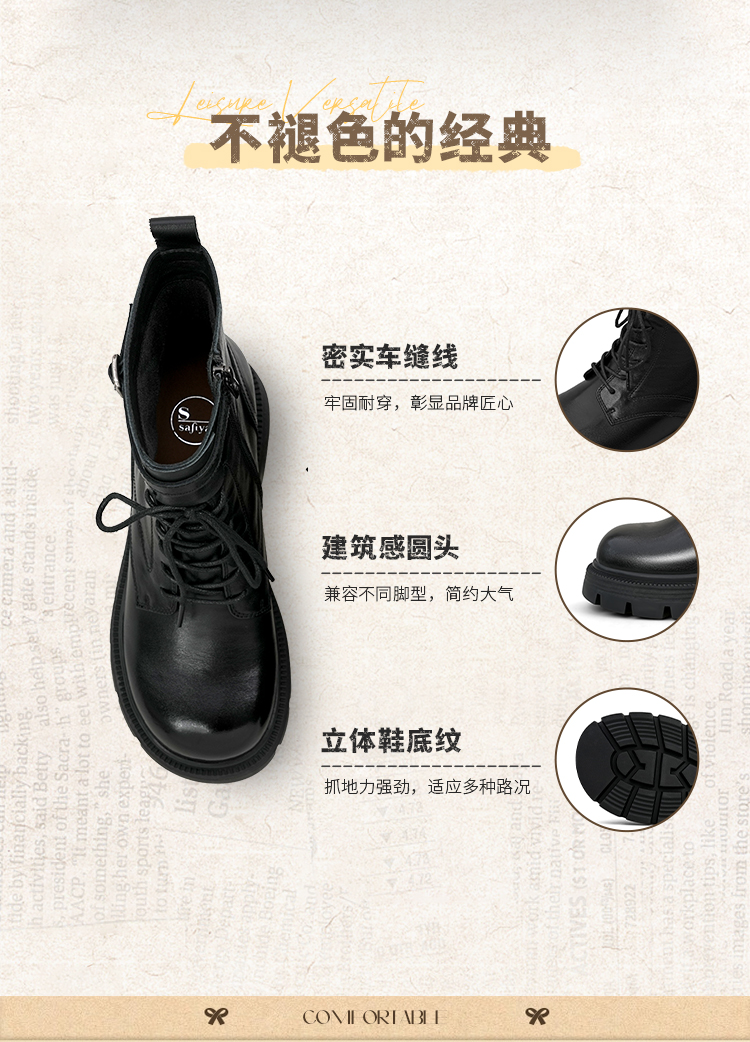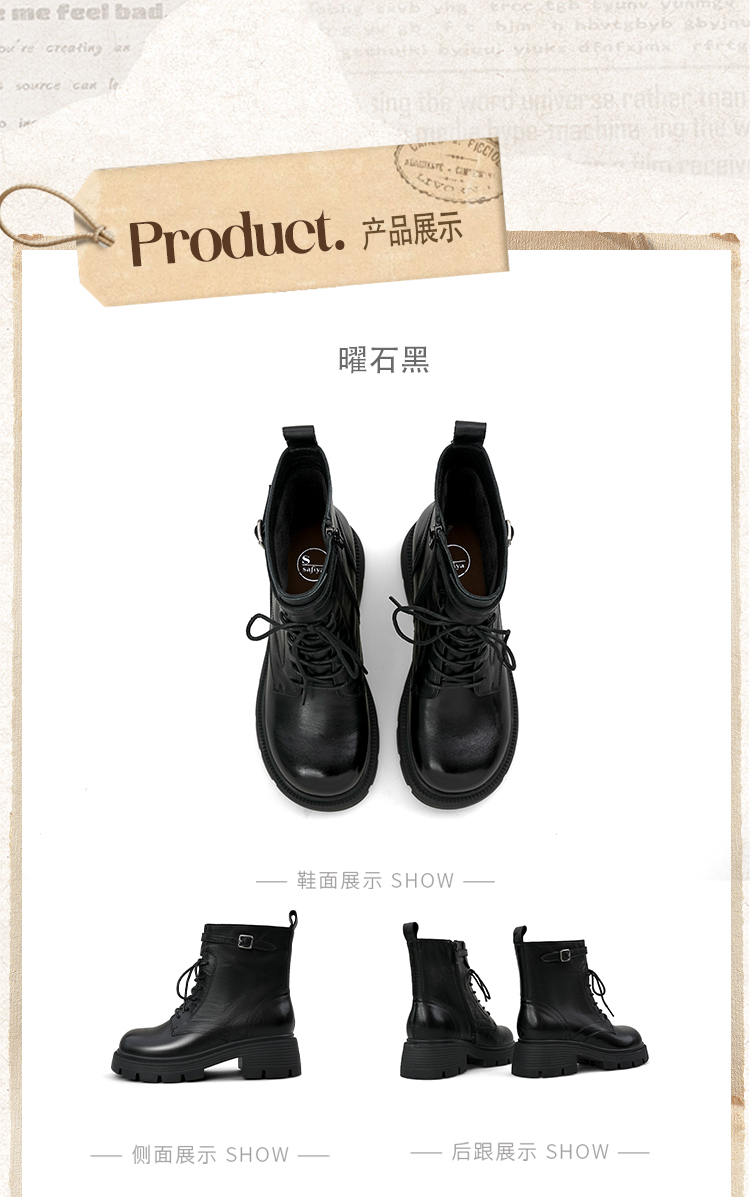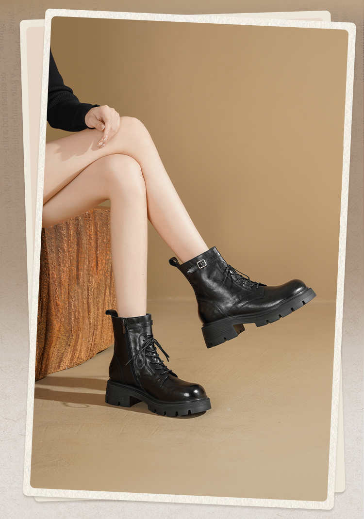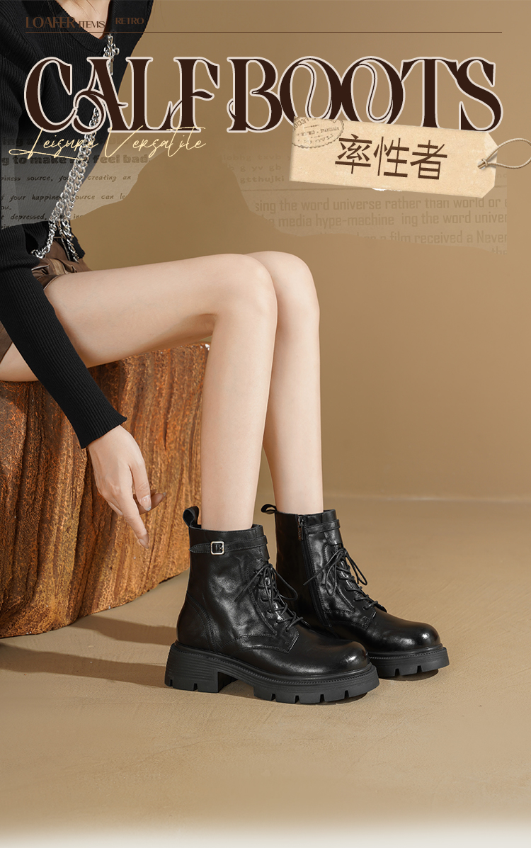 Safiya/索菲娅2025秋冬百搭圆头真皮头层牛皮厚底休闲粗跟显瘦英伦马丁靴SFD4116033