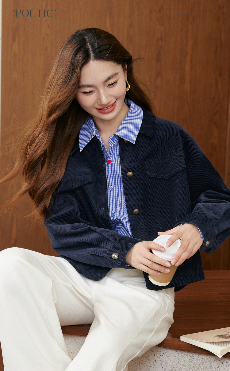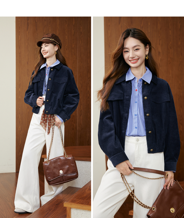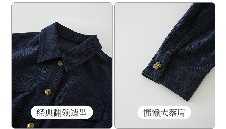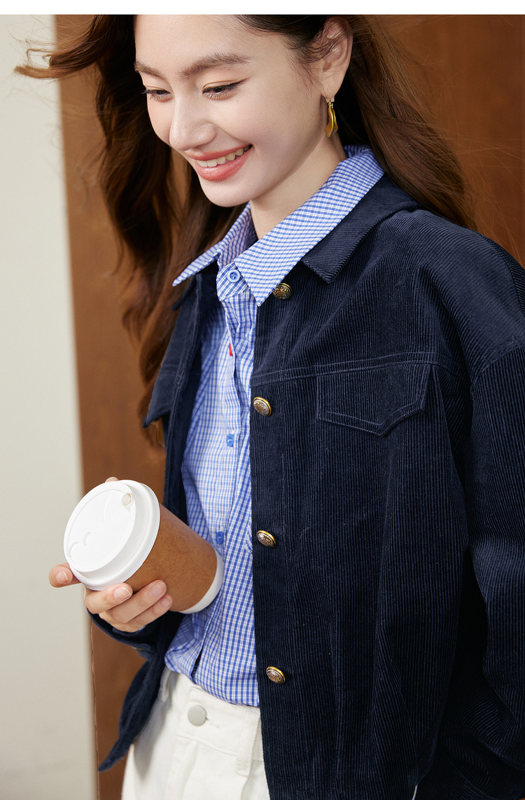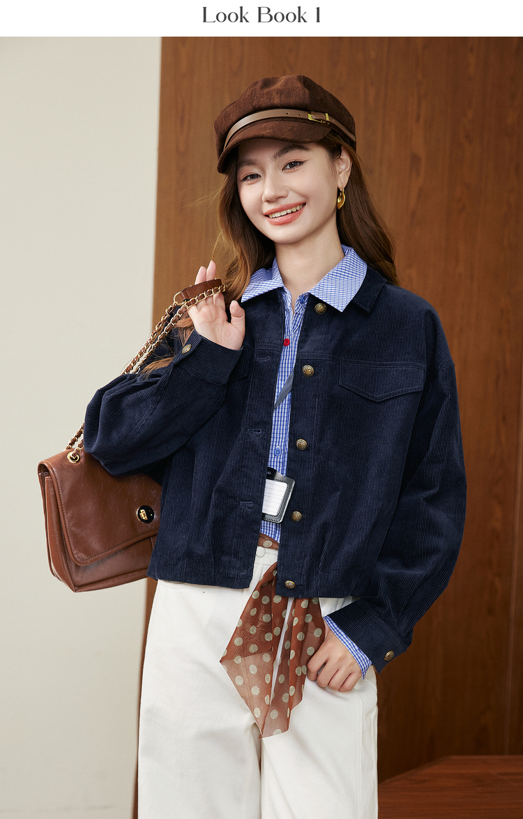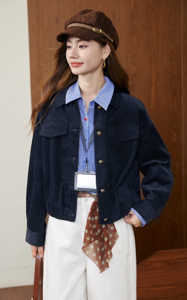 【11/26新品】熙世界藏青色灯芯绒短外套女小个子宽松百搭气质上衣2025秋冬新款