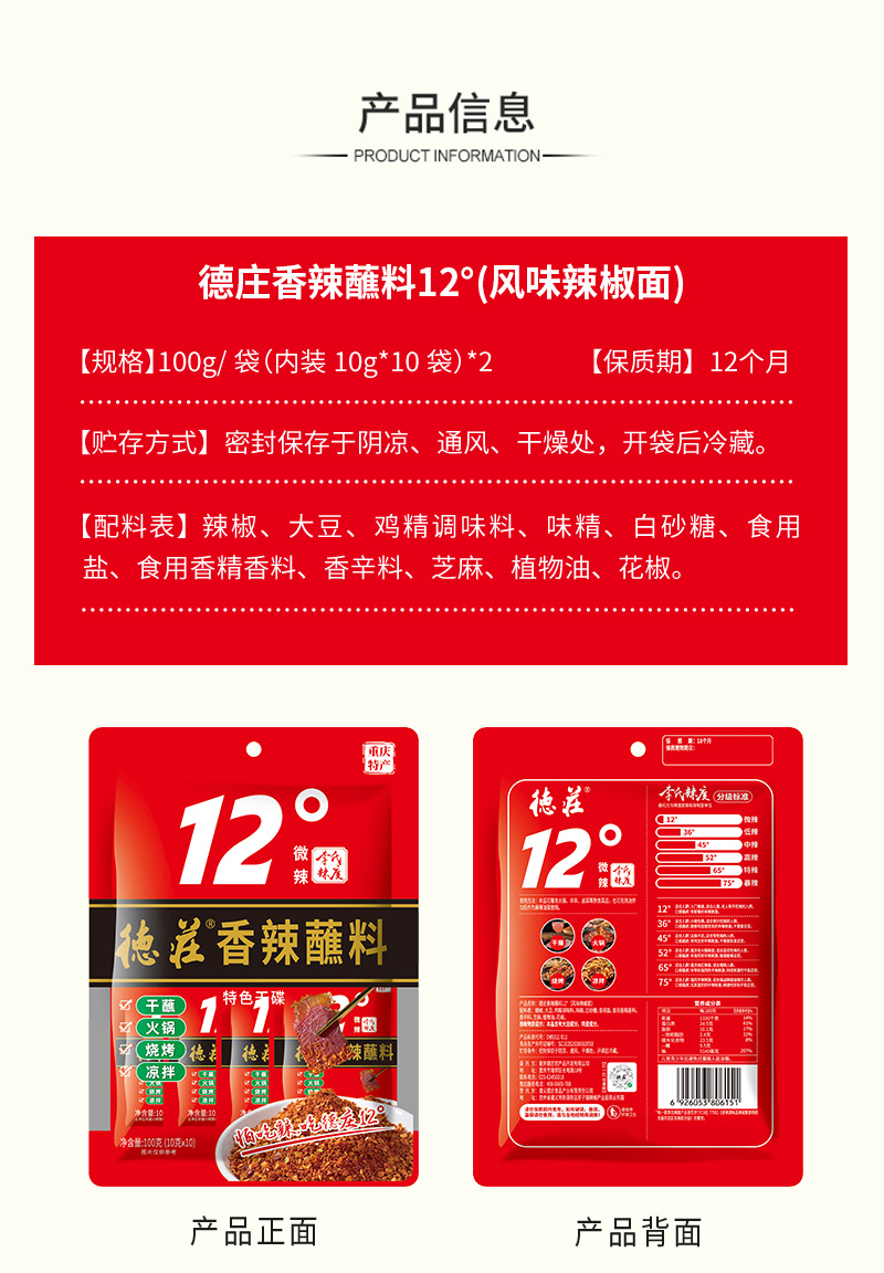 德庄香辣蘸料12° (风味辣椒面)100g/袋(内装10g*10袋)*2