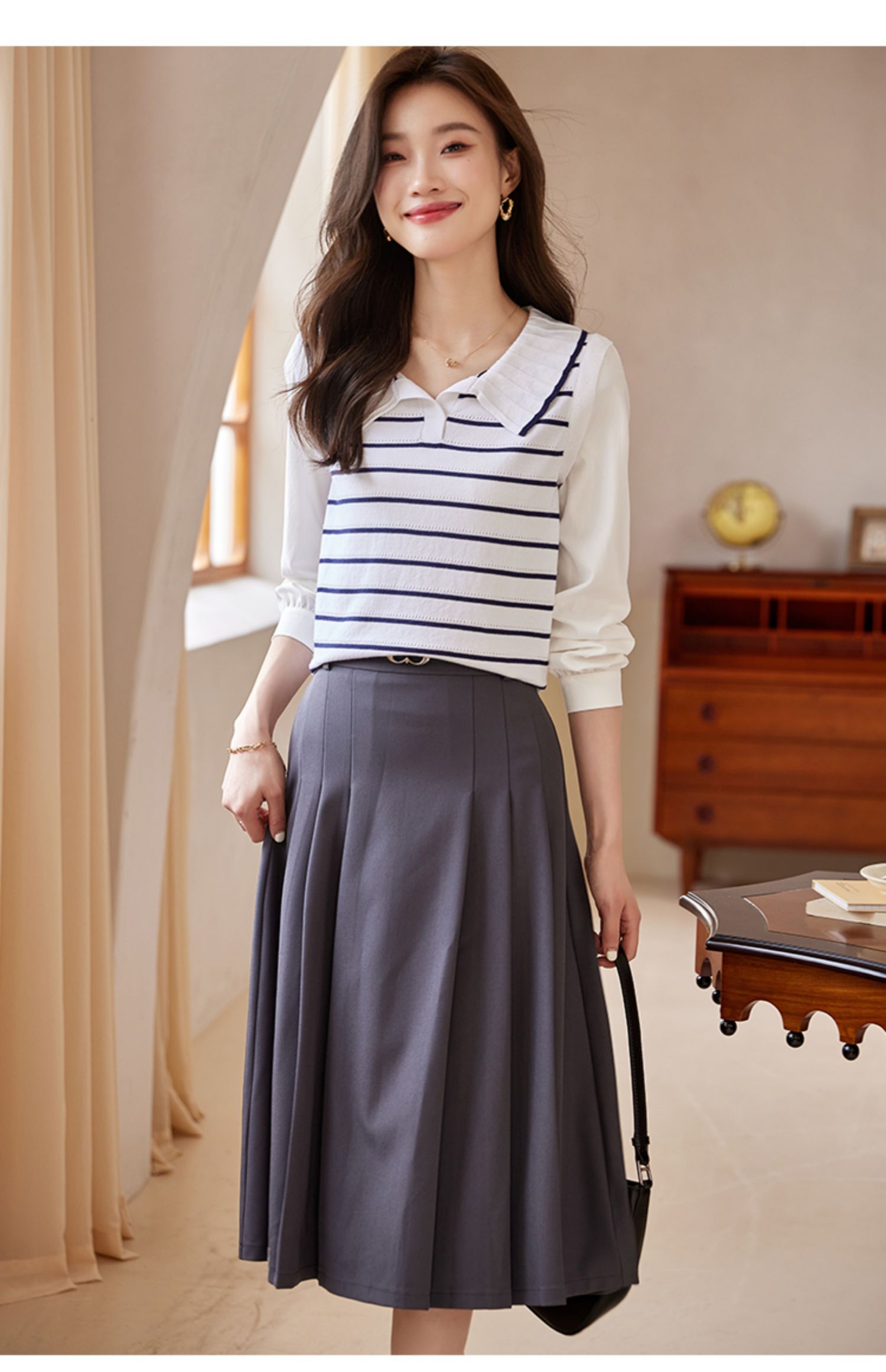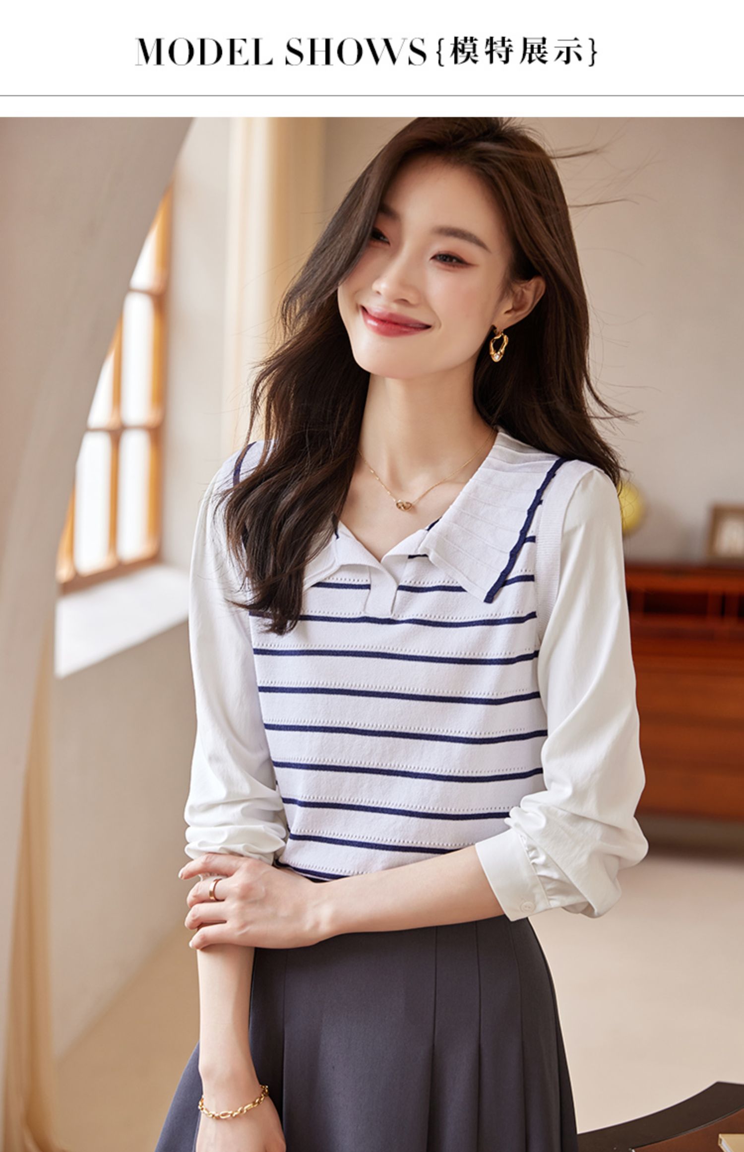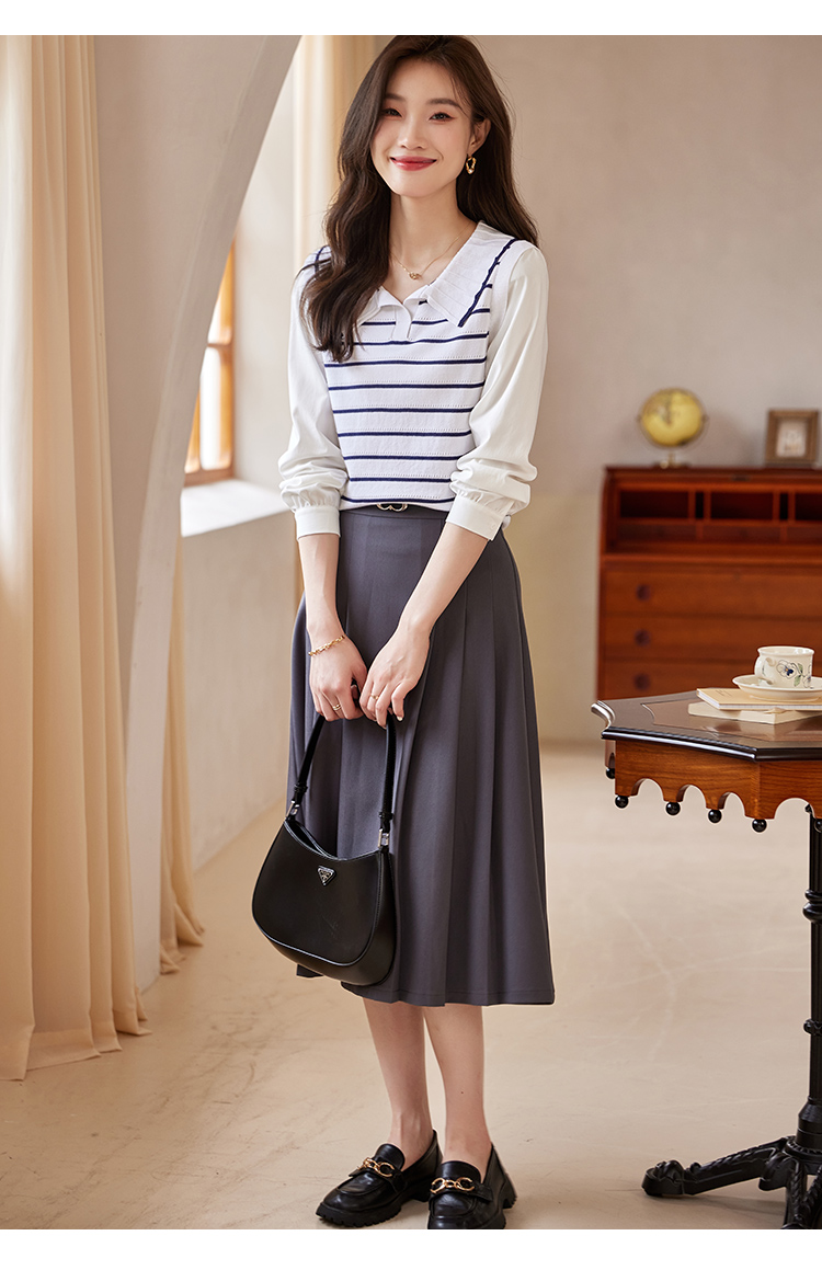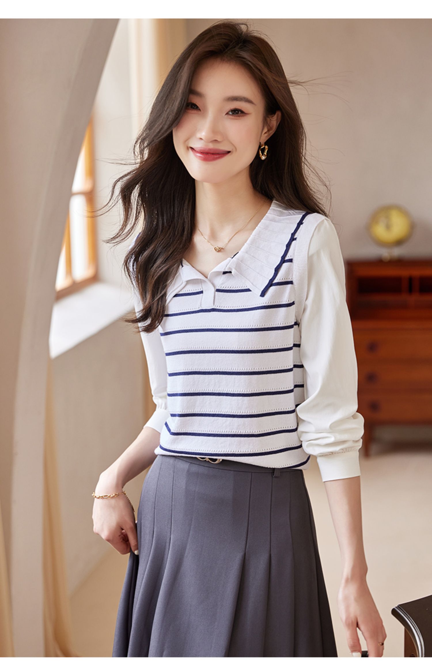 【专属特价】熙世界2025秋新款撞色条纹海军领针织衫女设计感假两件长袖上衣