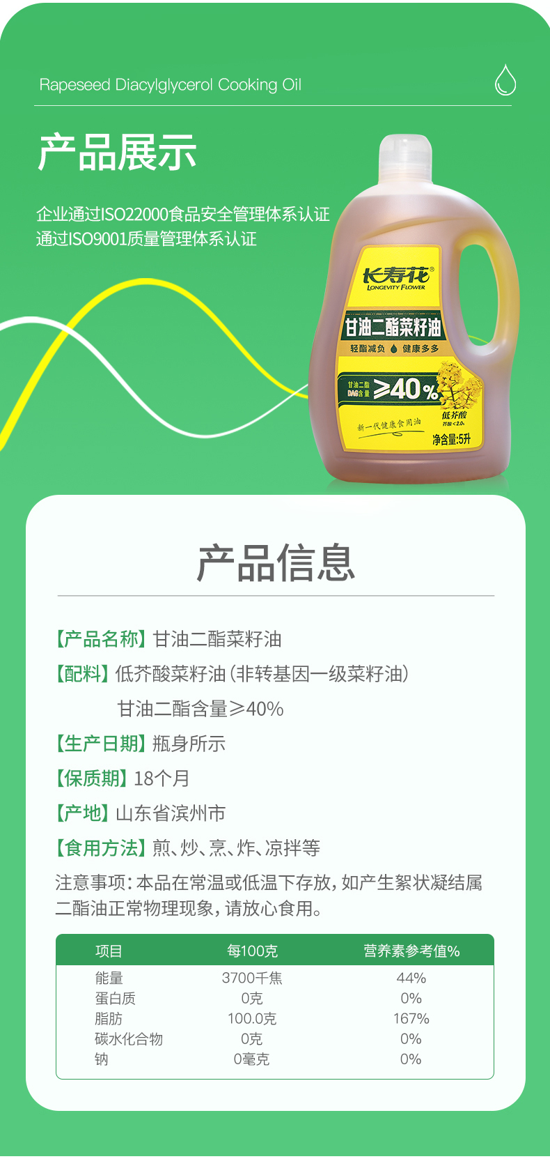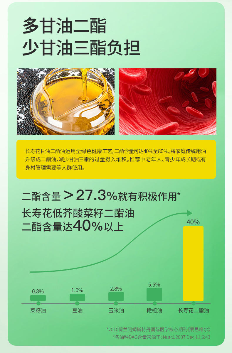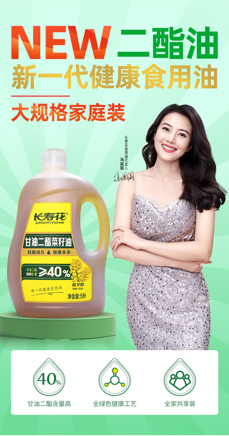 长寿花轻酯甘油二酯食用油40%DAG含量 5L 低芥酸菜籽二酯油家庭装 赠送5斤长粒香大米