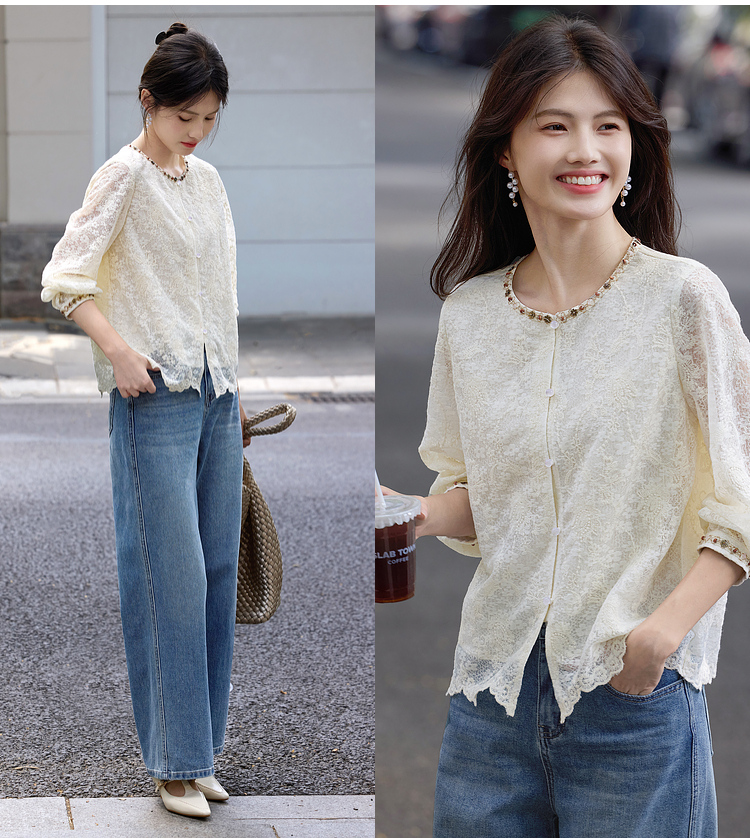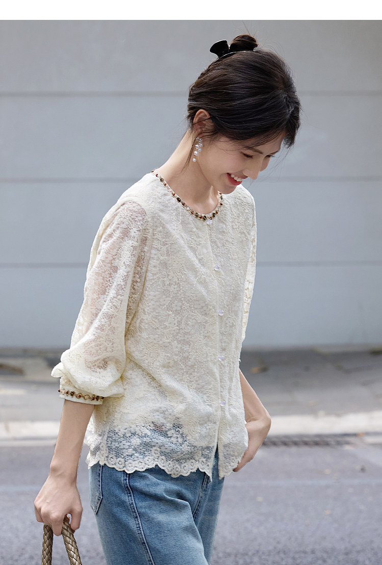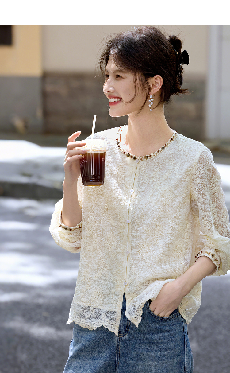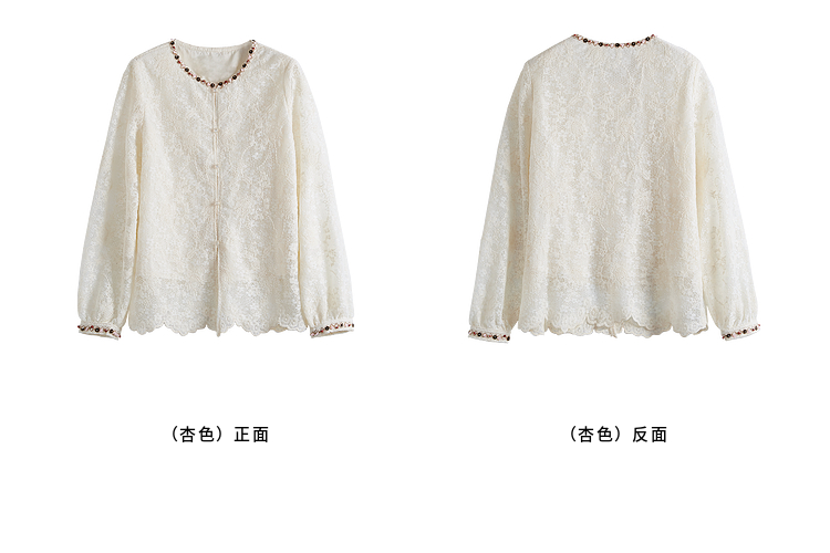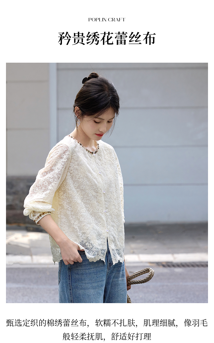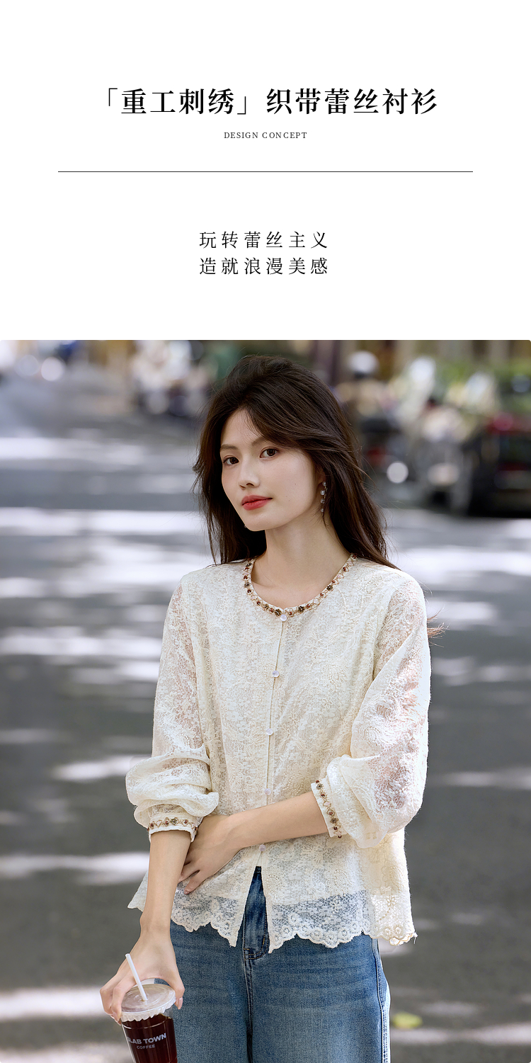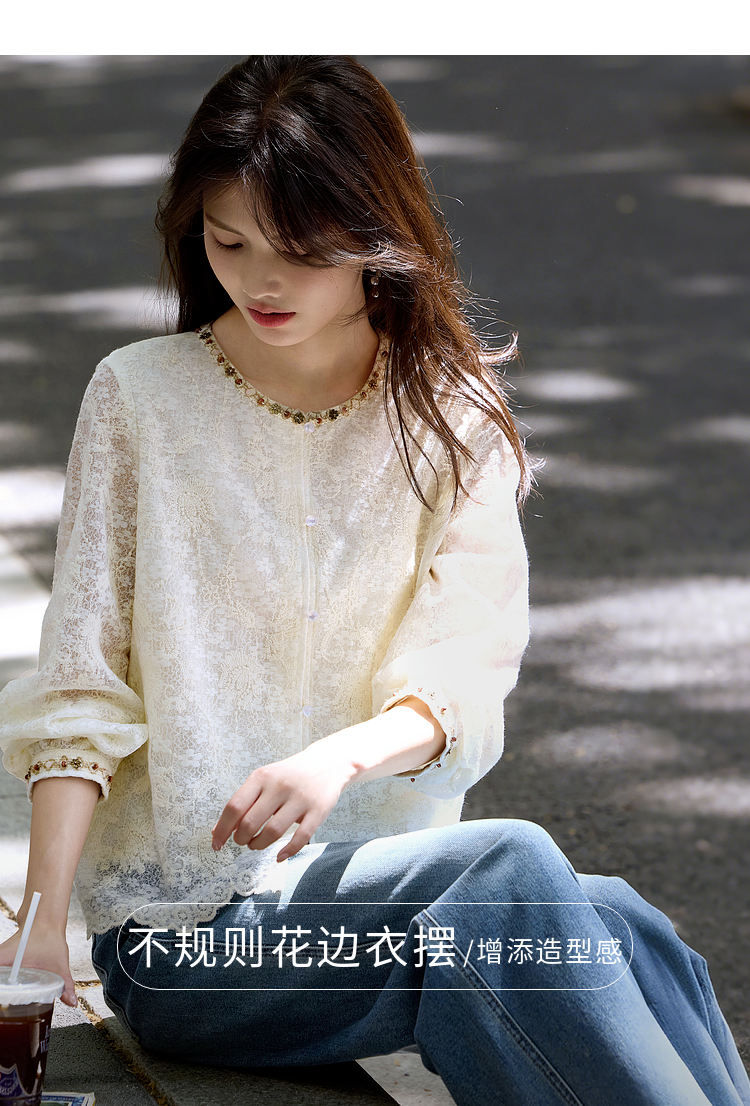 【08/12新品】熙世界法式重工刺绣蕾丝衬衫女2025秋季新款织带圆领长袖小衫上衣