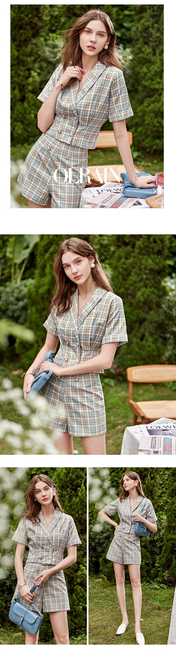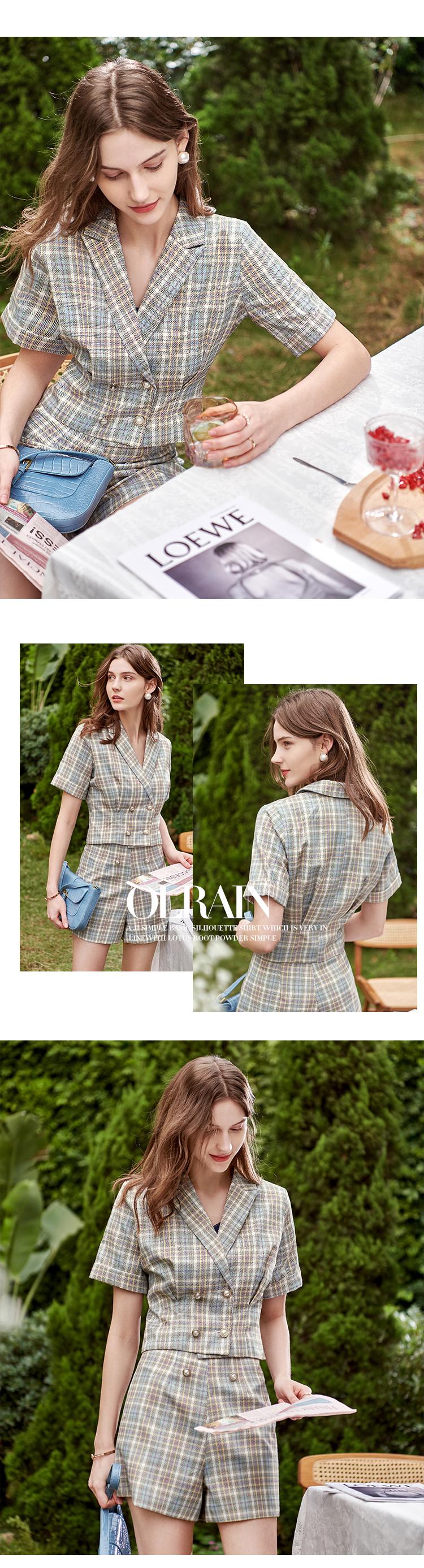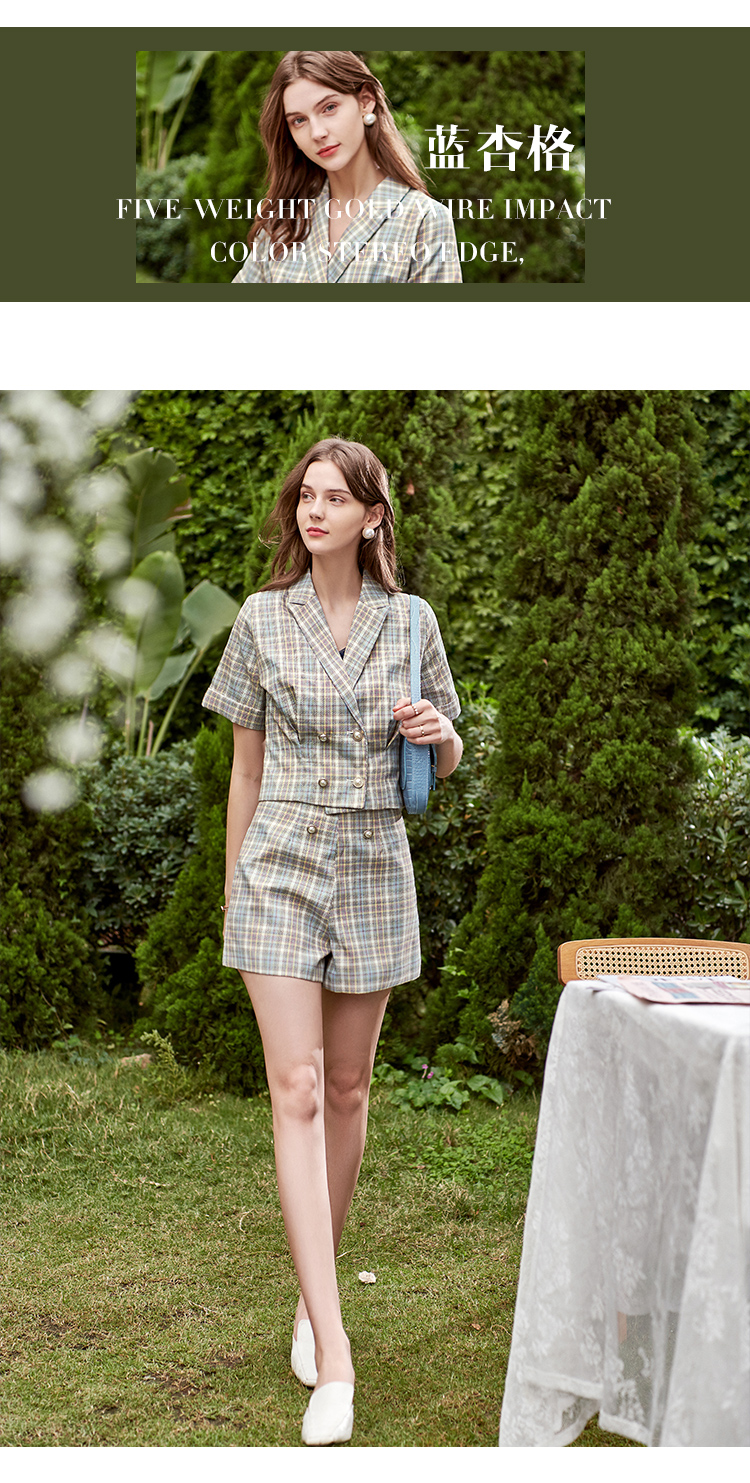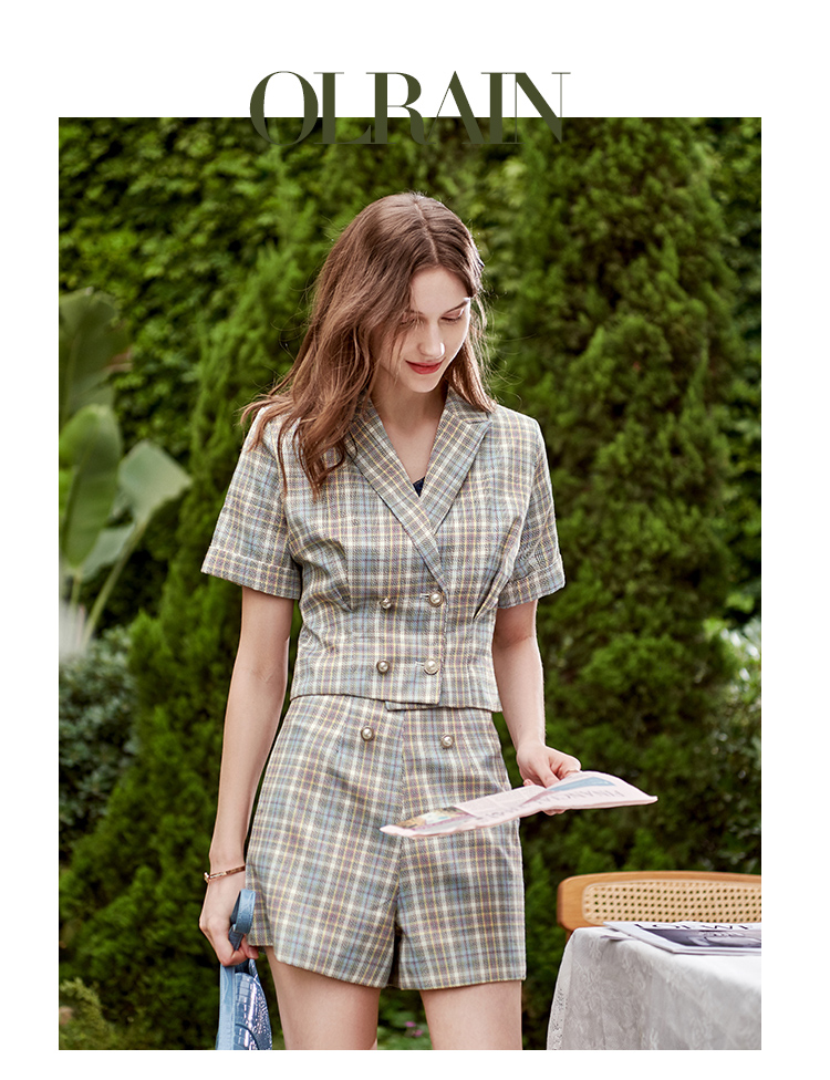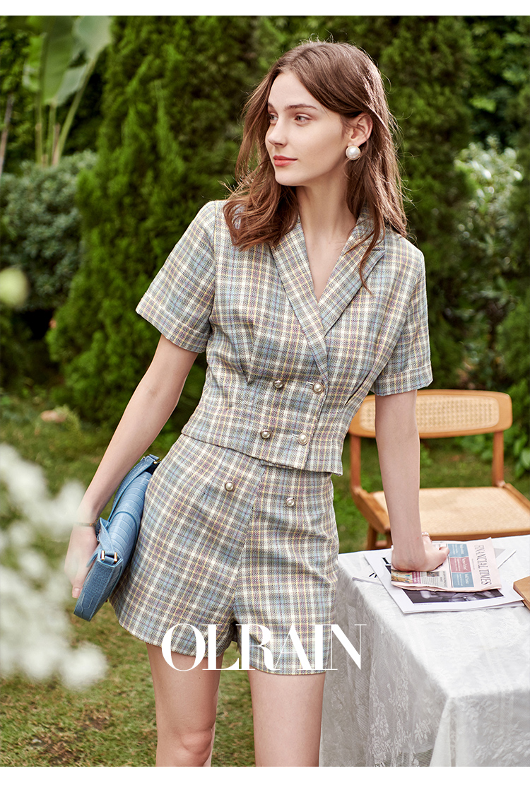 欧芮儿时尚套装秋2021年新款女西装袖织格衬衫+A字时尚短裤两件套