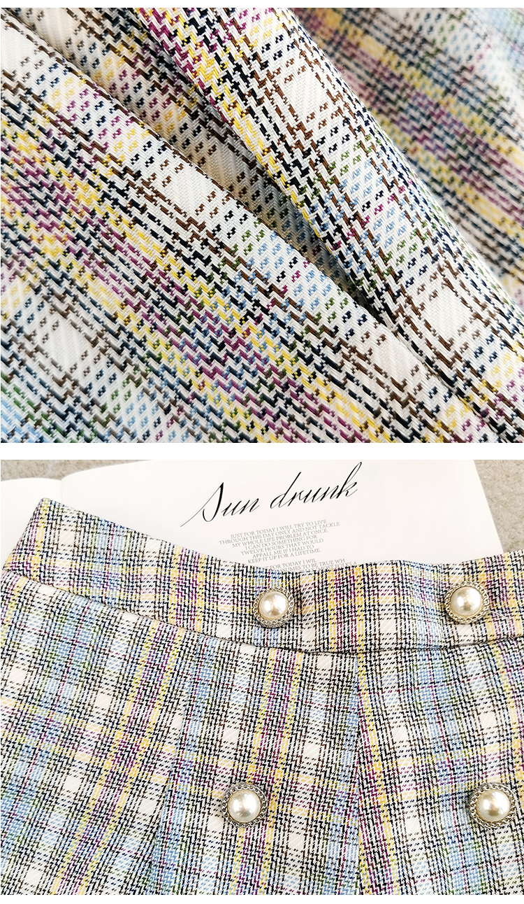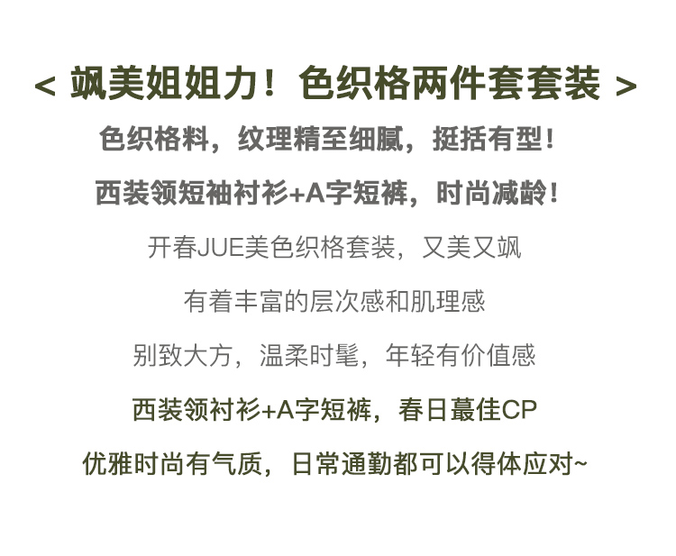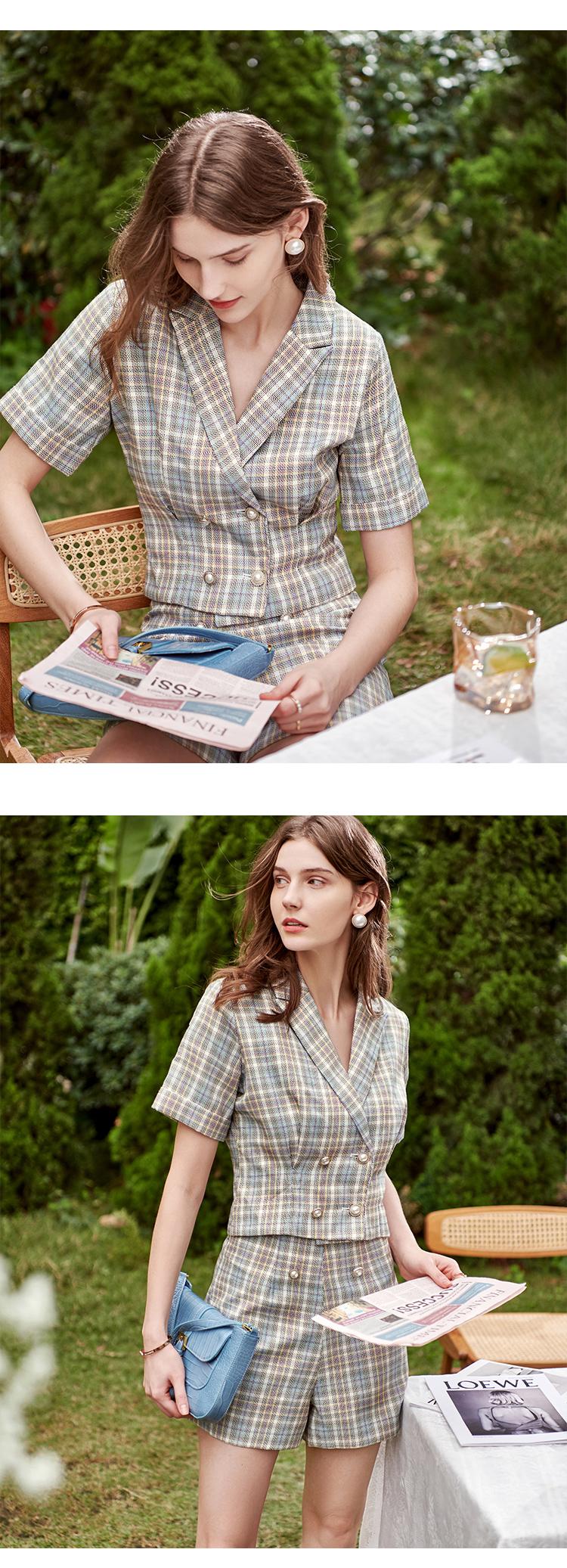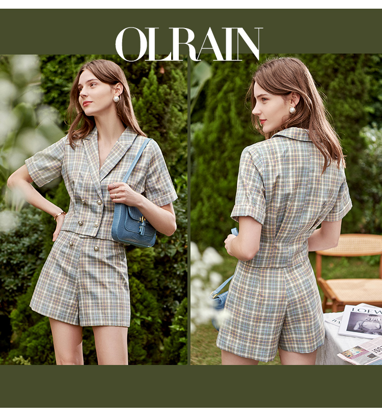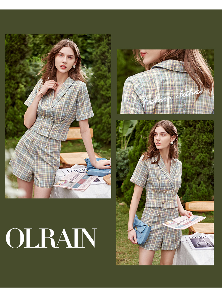 欧芮儿时尚套装秋2021年新款女西装袖织格衬衫+A字时尚短裤两件套