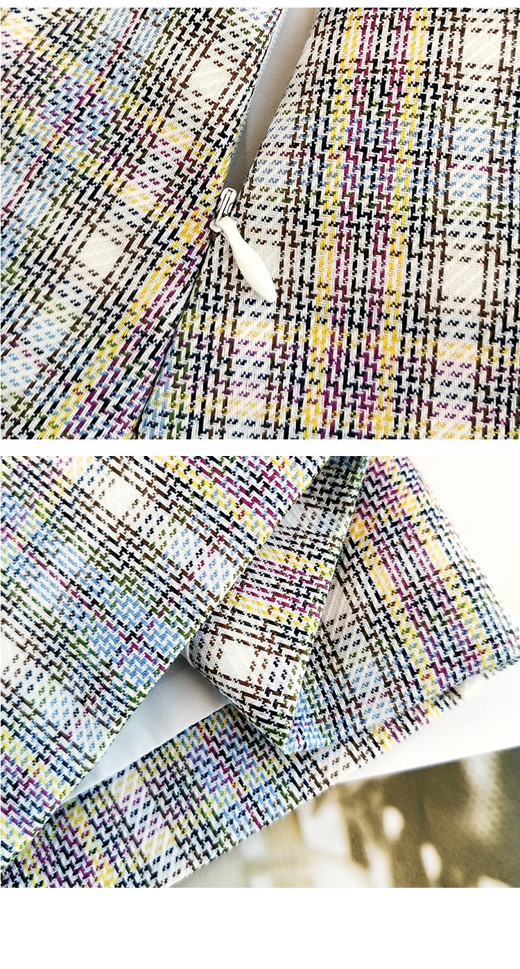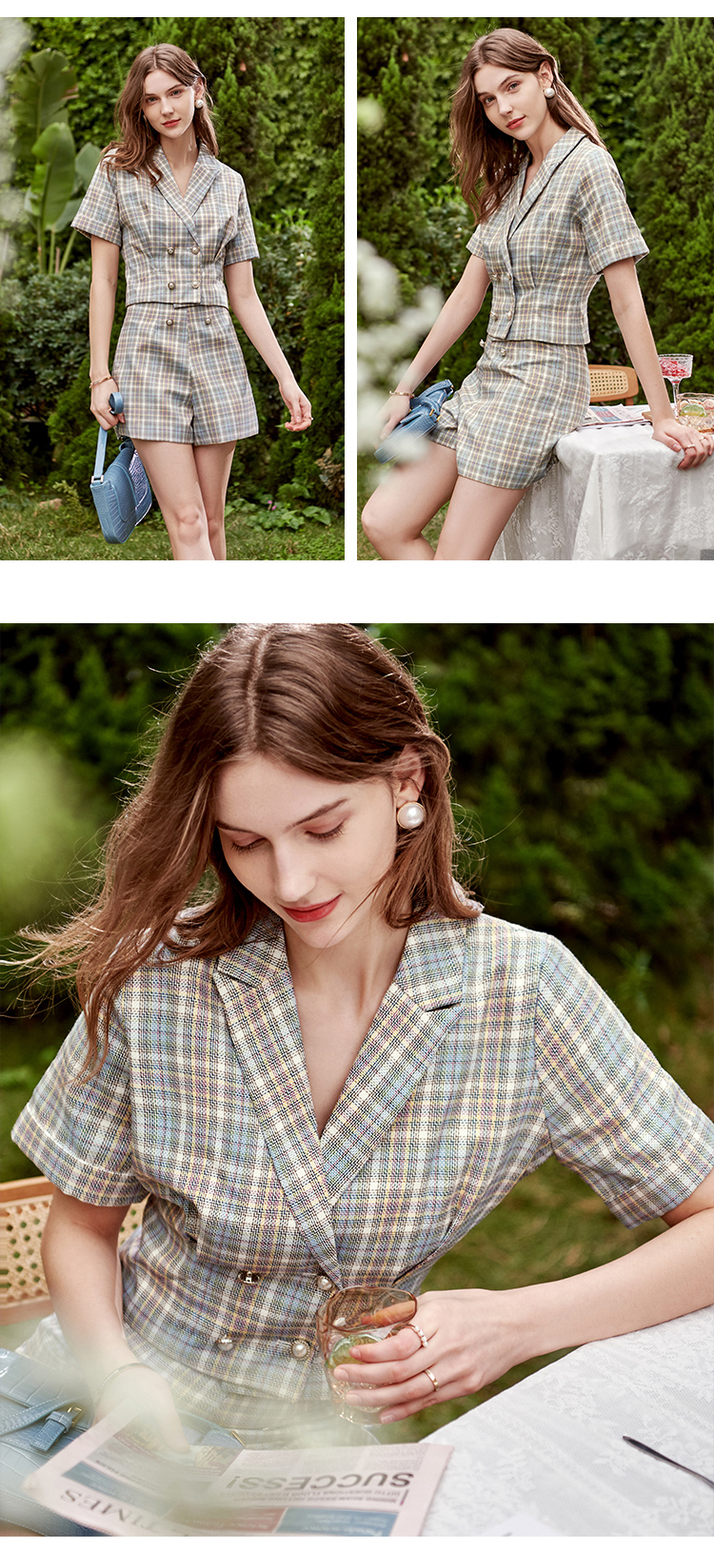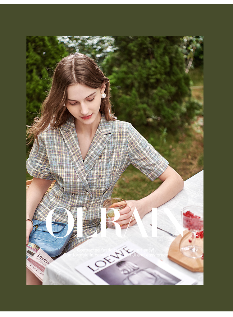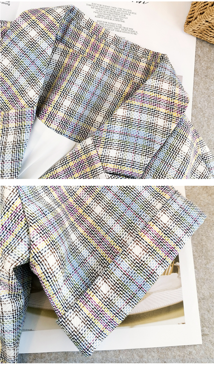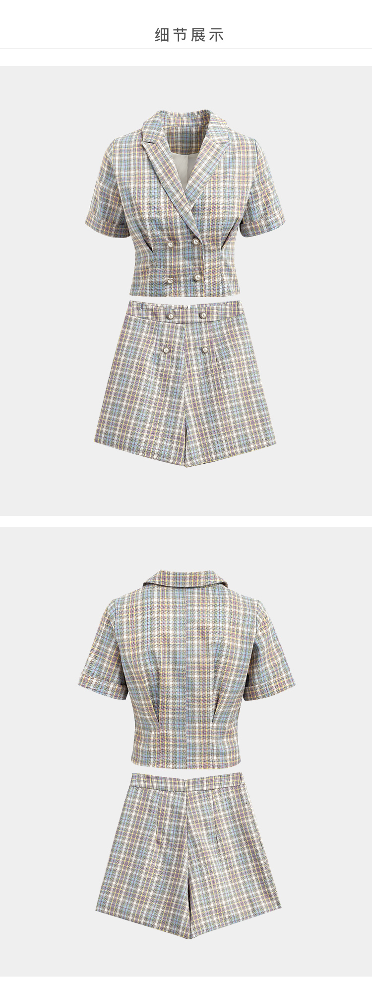 欧芮儿时尚套装秋2021年新款女西装袖织格衬衫+A字时尚短裤两件套