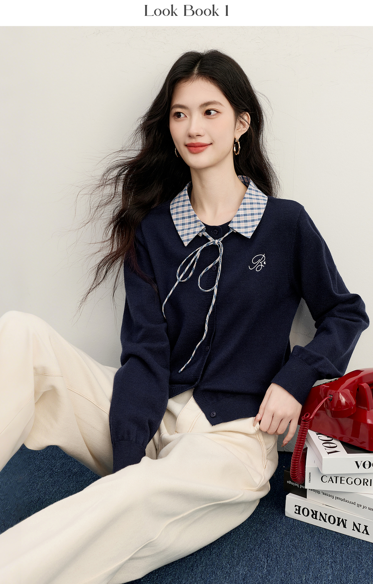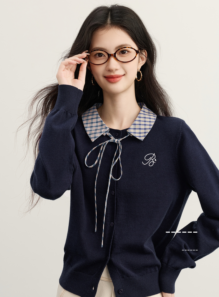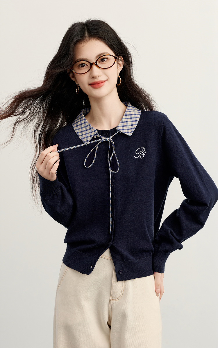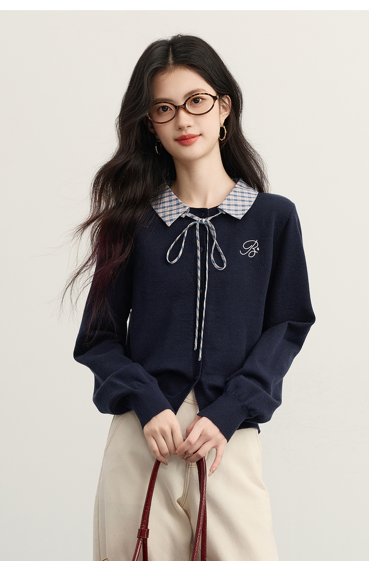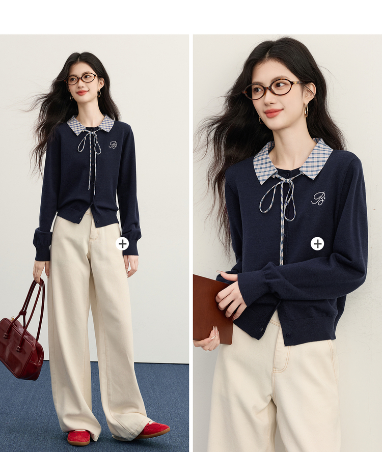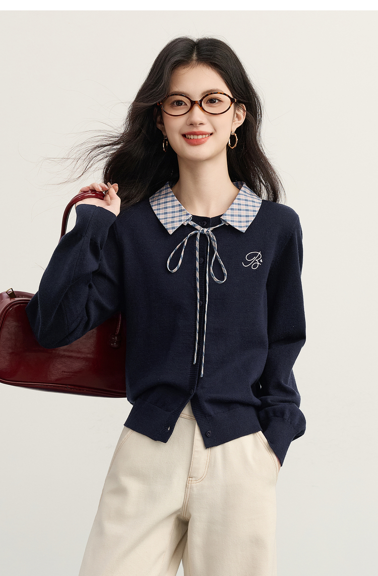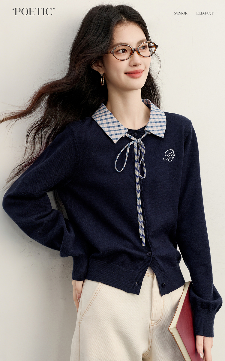 【11/26新品】熙世界可拆卸格纹翻领假两件毛衣开衫女士秋冬高知miu系针织上衣
