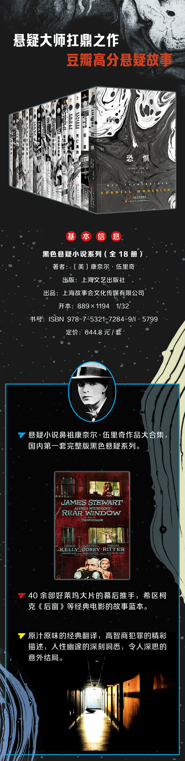 作者康奈尔·伍里奇,西方黑色悬疑小说鼻祖,在西方通俗小说史上有重要地位。著有《黑衣新娘》等16部小说,这些小说多次被搬上电影电视屏幕,并被译成几十种文字,畅销世界各地。