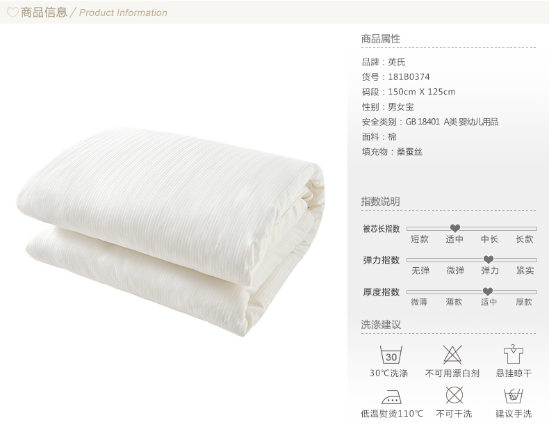 英氏婴儿保暖100%桑蚕丝被芯儿童被芯新生儿被子150cm 181B0374