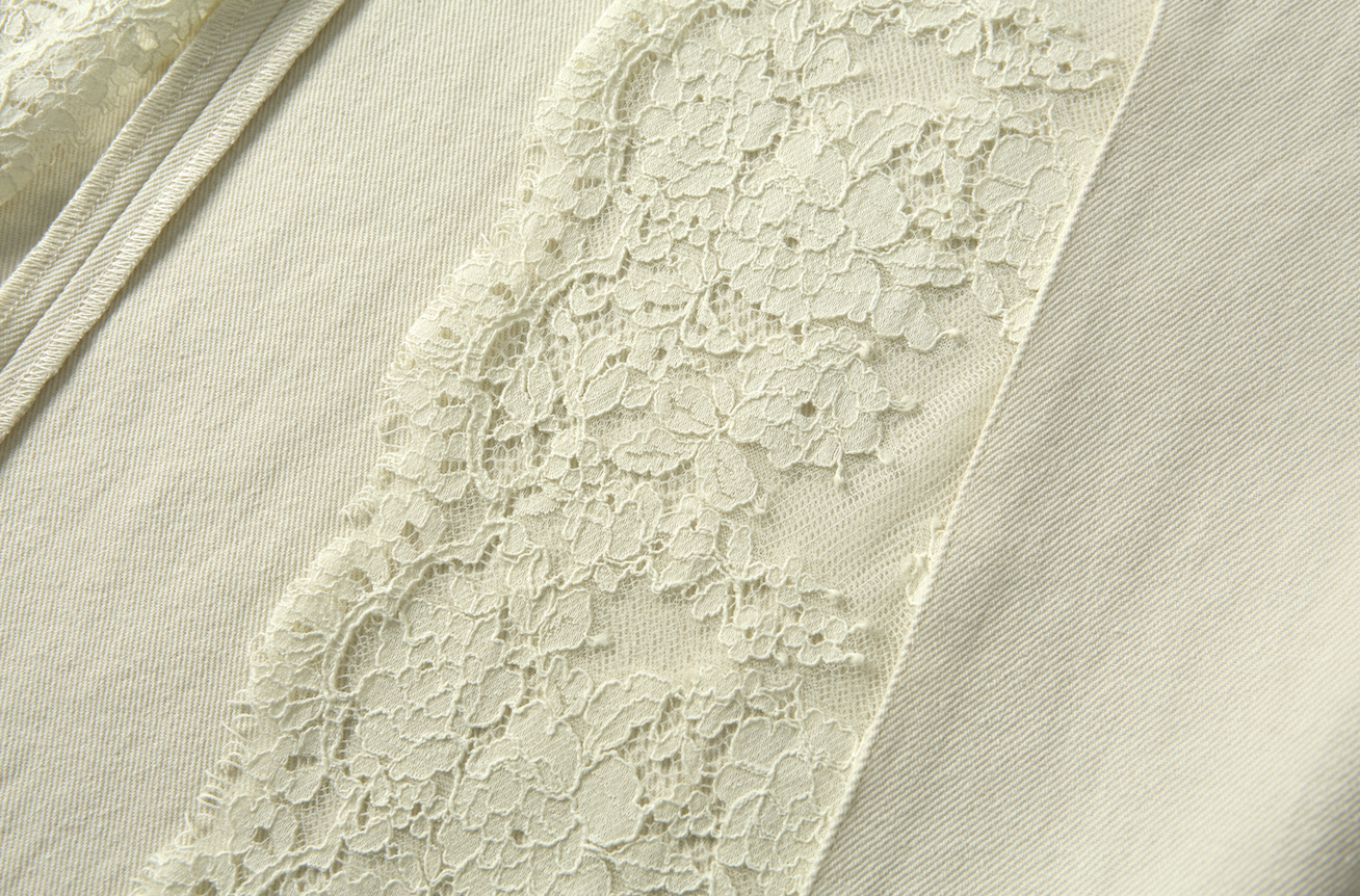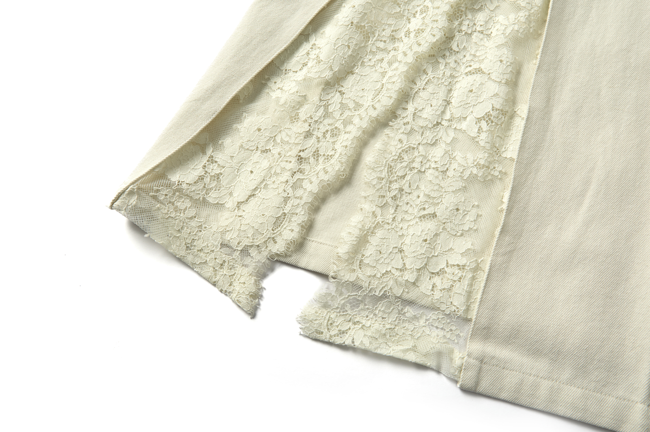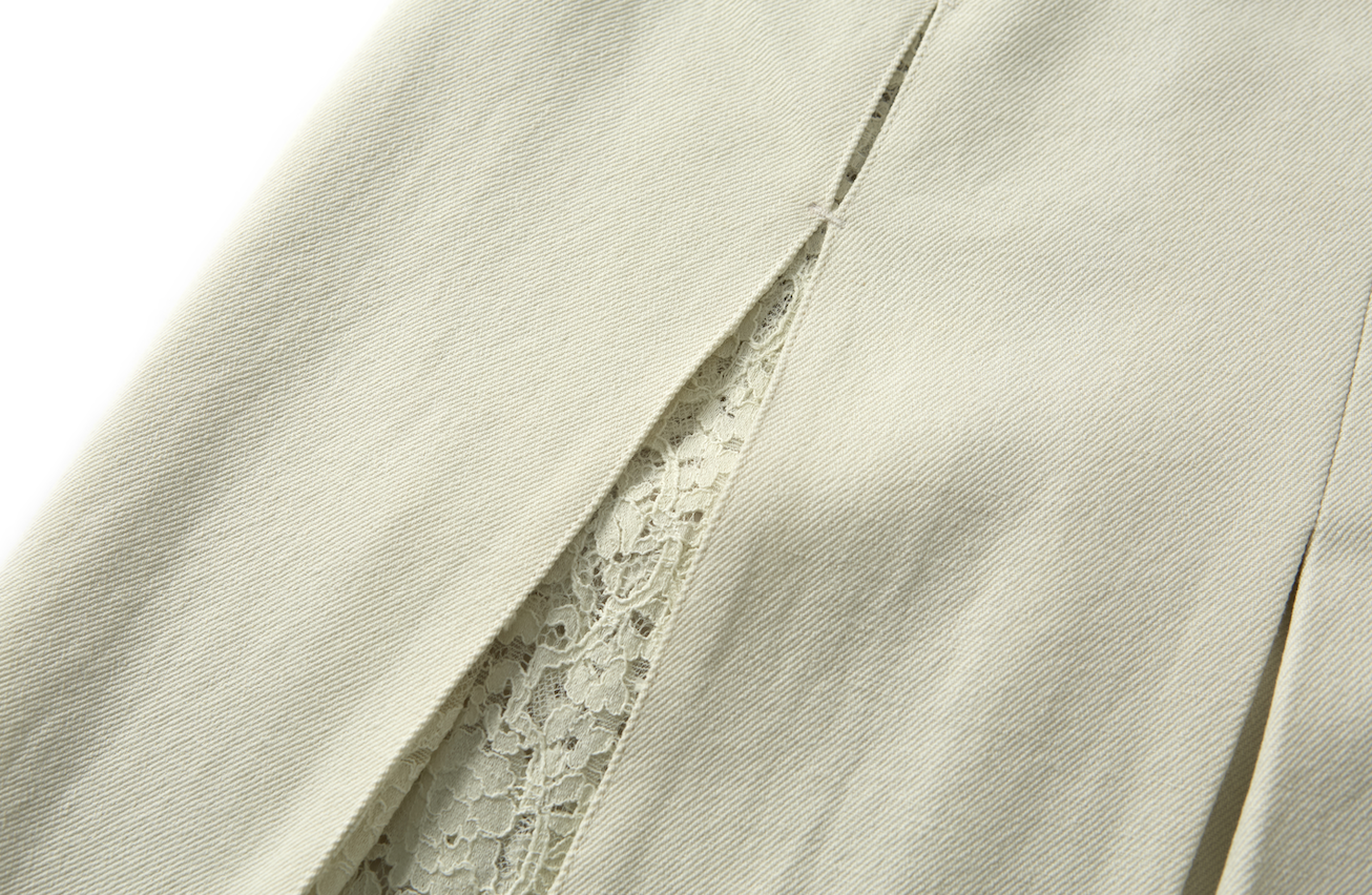 腰部采用针织材质,更贴合身体曲线,带来舒适与包容度,提升日常穿着的灵活性。白色牛仔面料与蕾丝构成轻柔与挺括的对比。