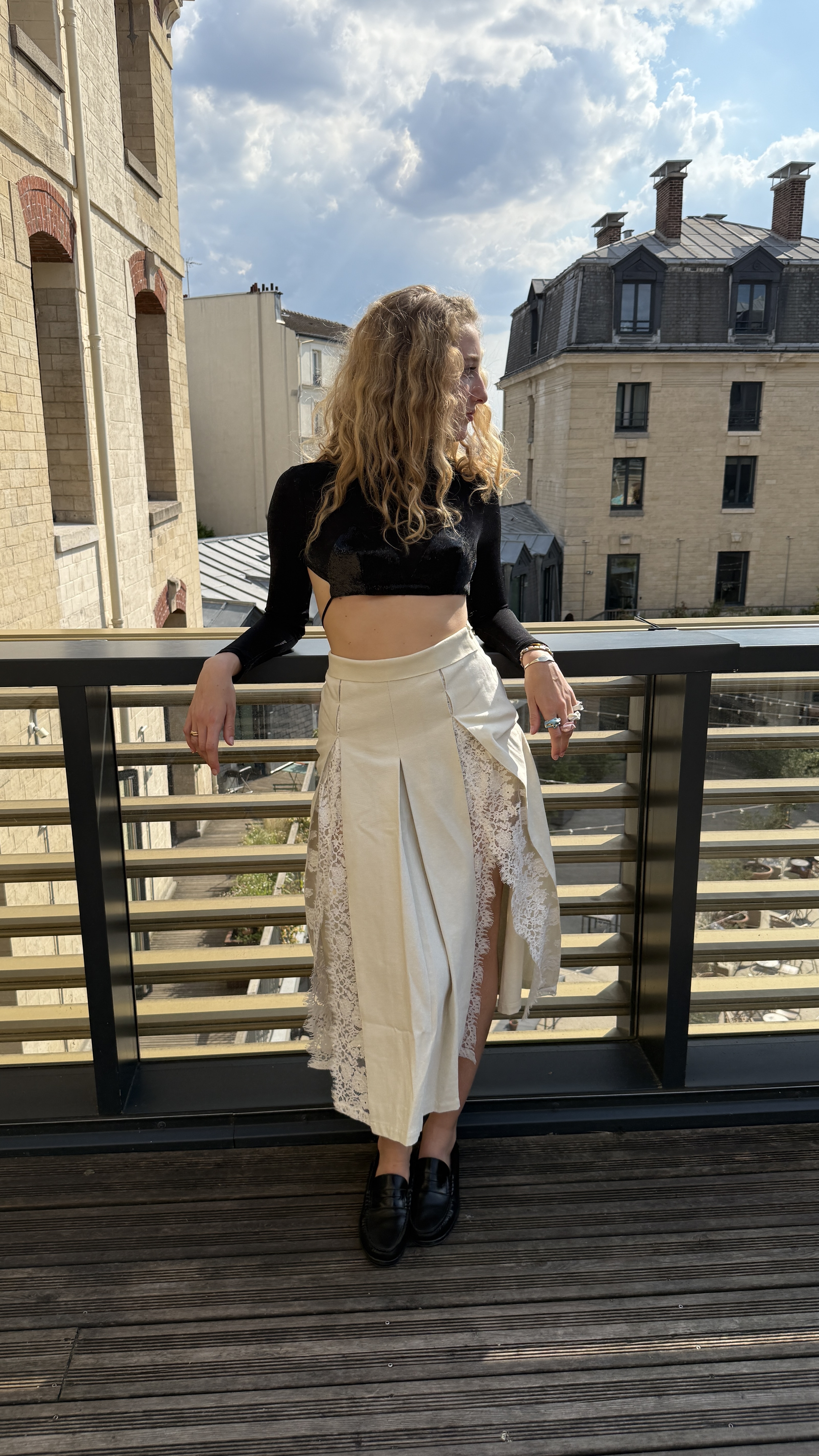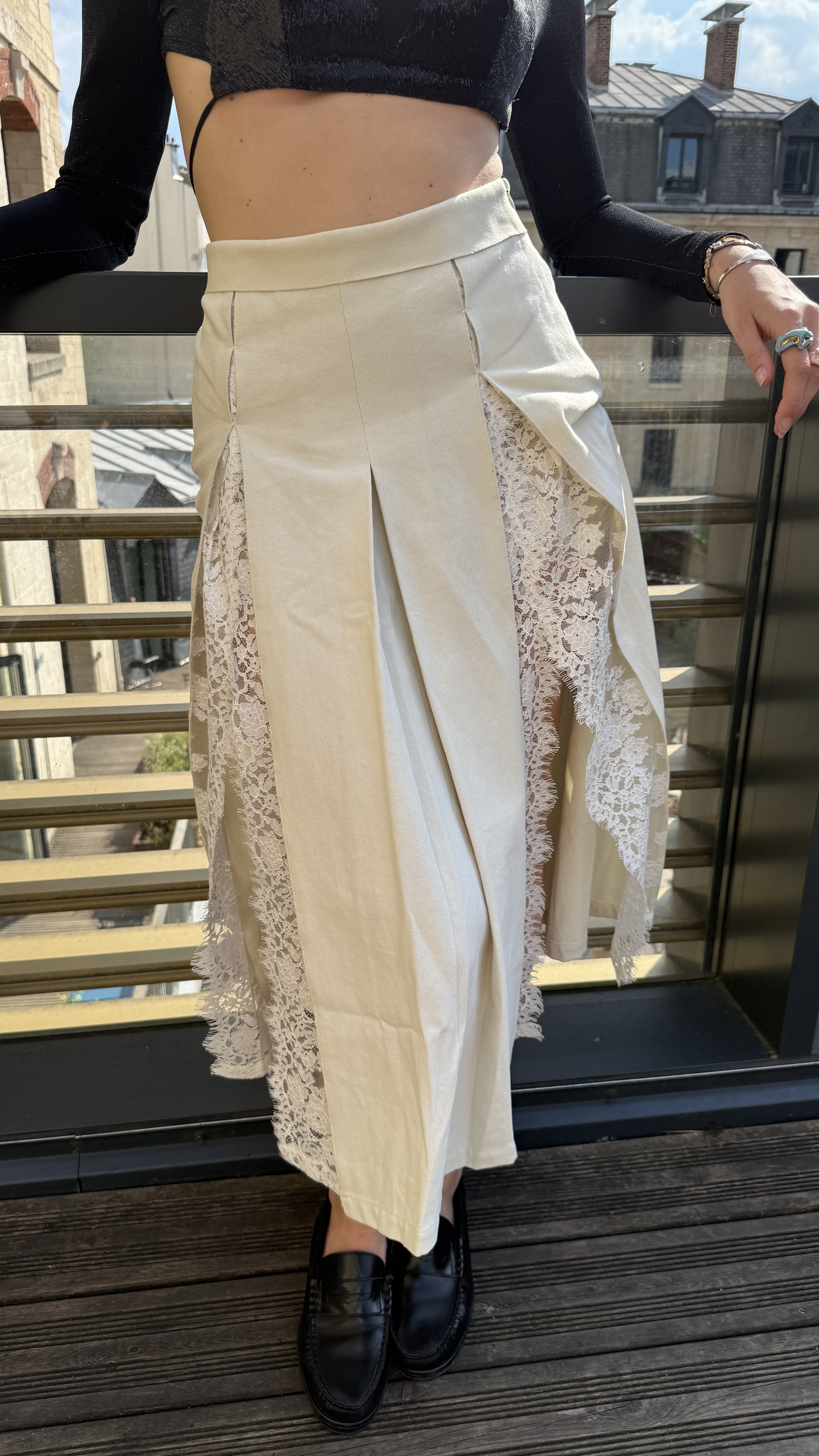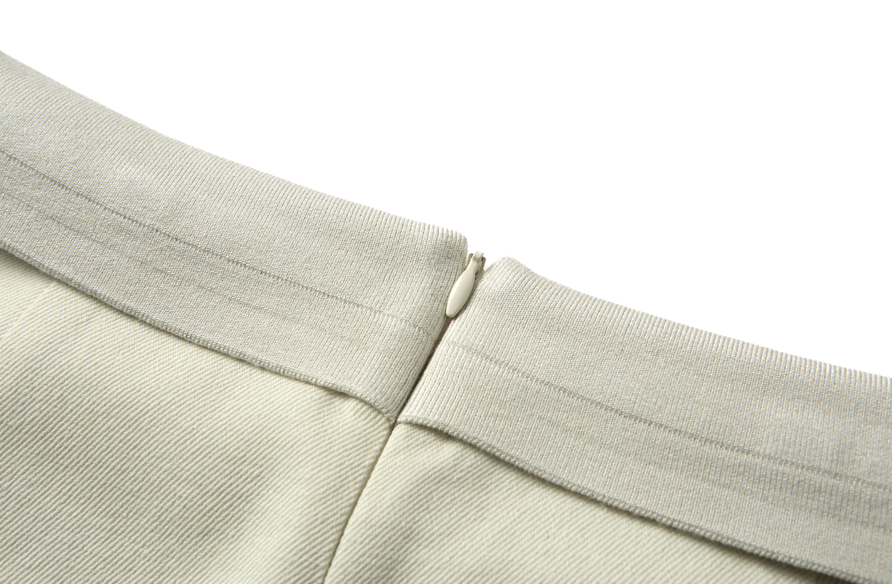 这款半裙以极简结构为基调,正面褶裥线条顺着身体自然垂落,呈现出干净利落的轮廓感。裙身两侧隐藏式拼接大片花朵蕾丝,轻盈通透,行走间若隐若现,为极简造型注入细节层次与轻松性感。