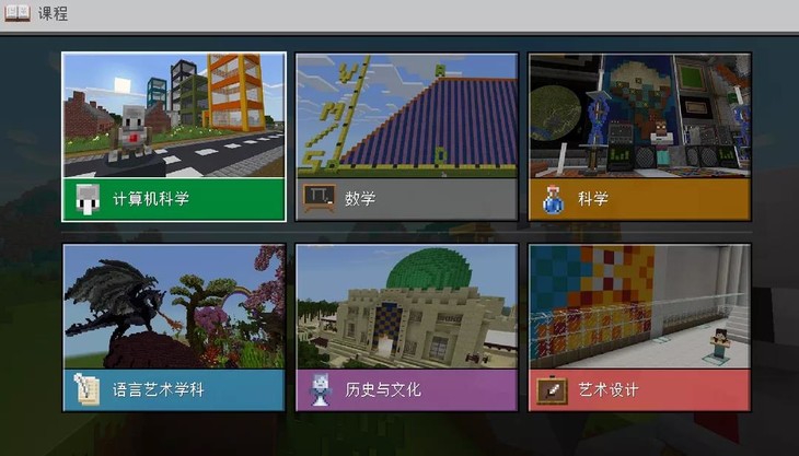 登录Minecraft我的世界教育版后,点击资源库中的课程你会发现有各种包罗万象的跨学科课程,如计算机科学、数学、科学、语言艺术学科、历史文化、艺术设计。每种大类课程下又包含了各种不同小类课程,并且这些课程的内容和数量还在持续更新中。