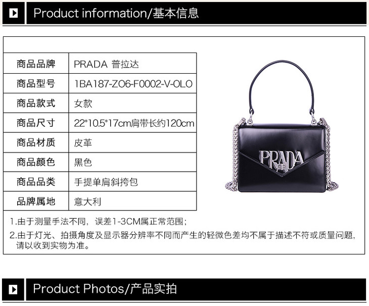 【香港直邮】Prada 普拉达 女士黑色单肩包 1BA187-ZO6-F0002-V-OLO