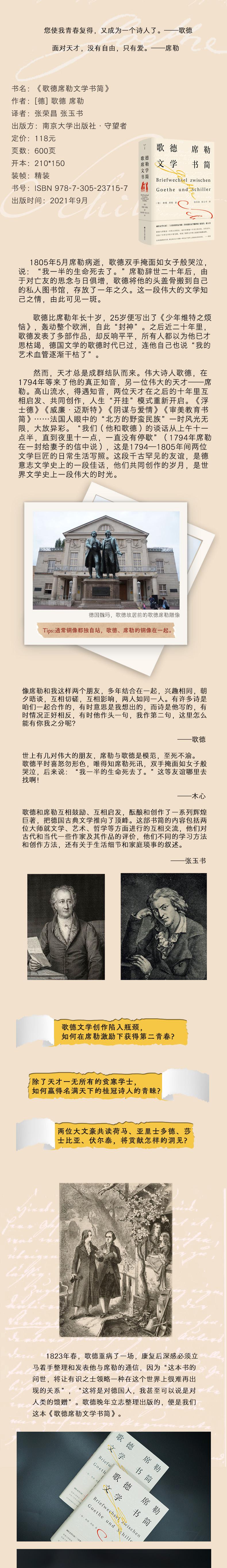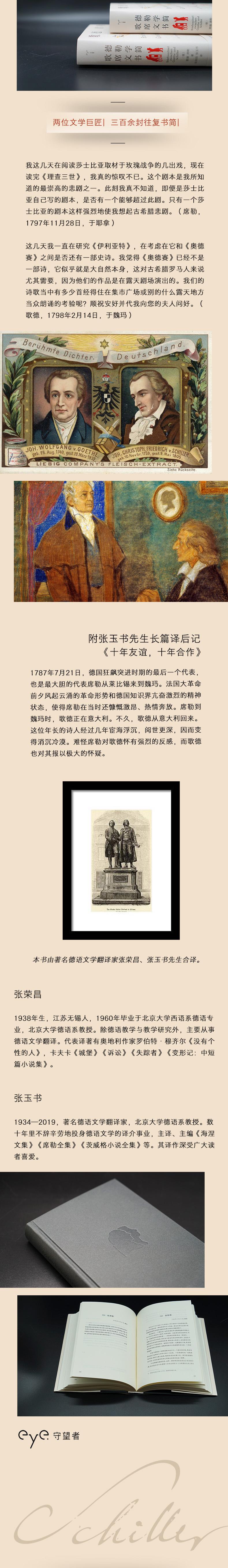 1823年春,歌德重病了一场,康复后深感必须立马着手整理和发表他与席勒的通信,因为“这本书的问世,将让有识之士领略一种在这个世界上很难再出现的关系”,“这将是对德国人,我甚至可以说是对人类的馈赠”。歌德晚年立志整理出版的,便是我们这本《歌德席勒文学书简》。