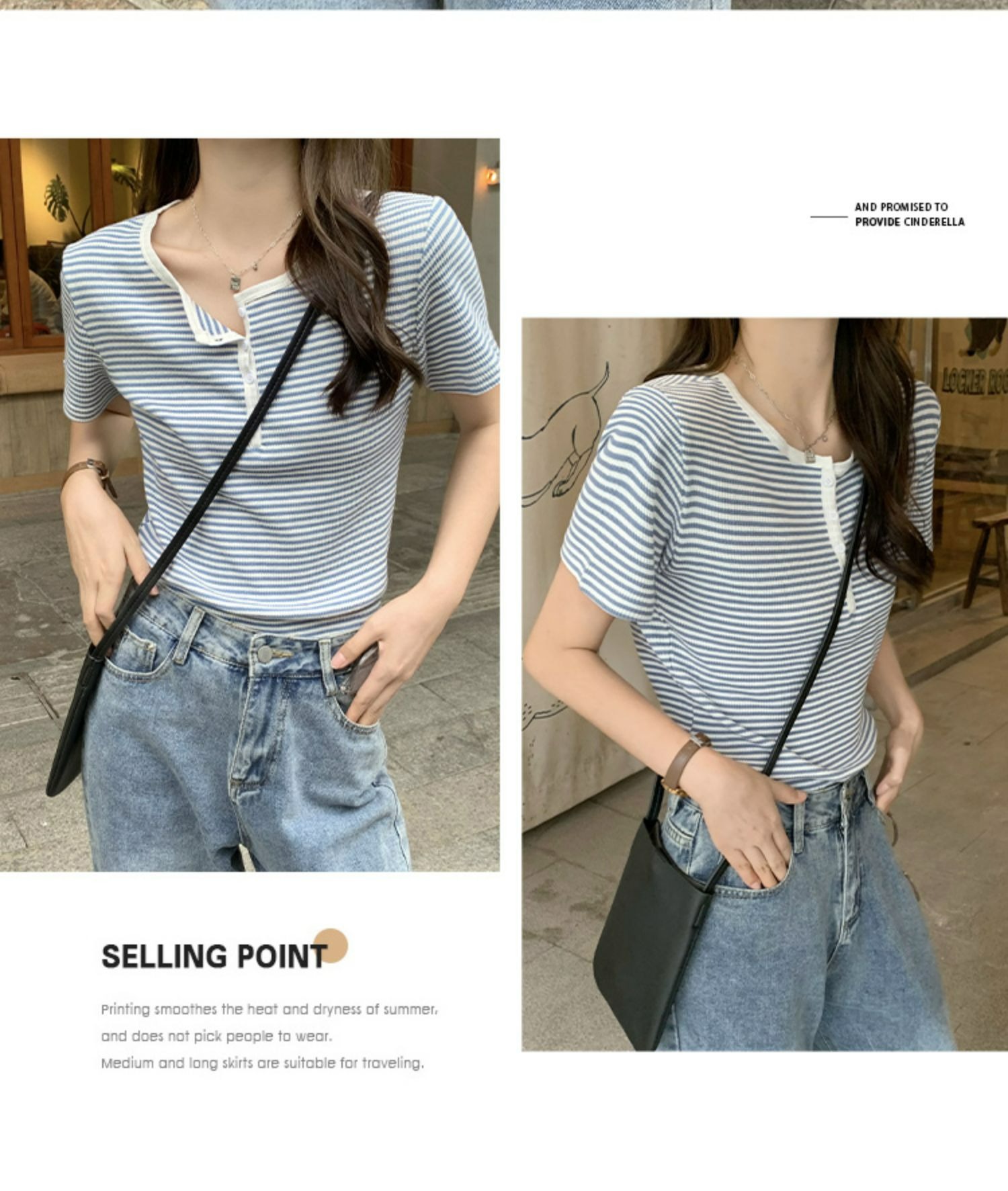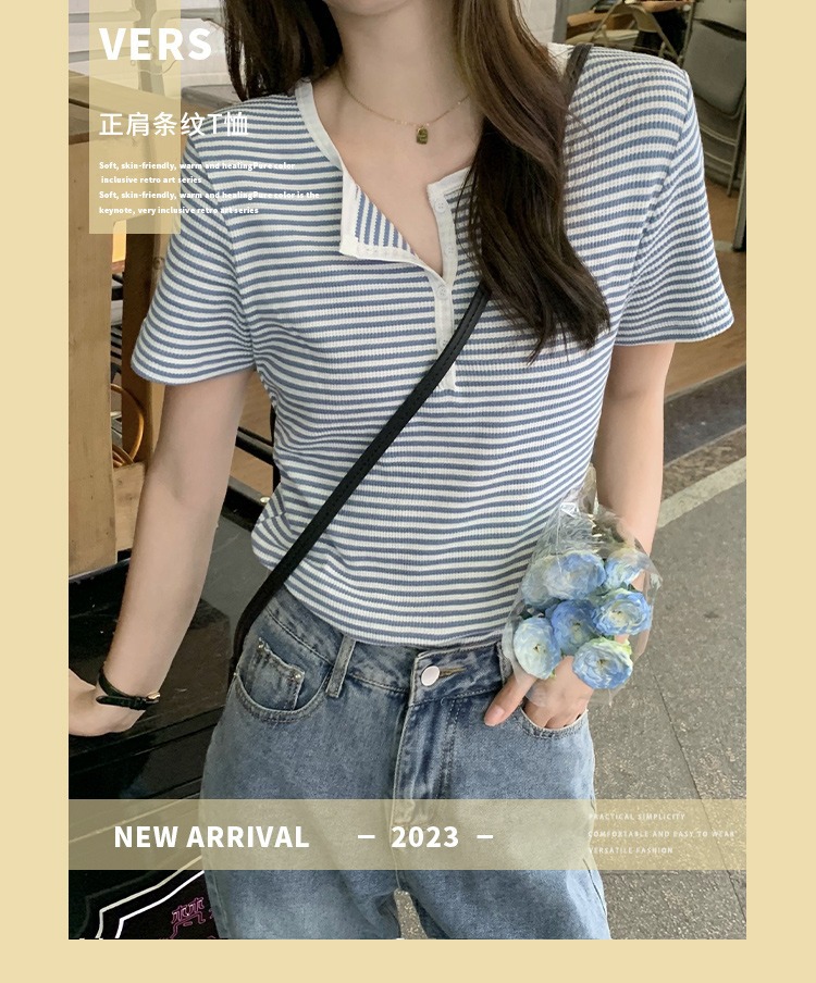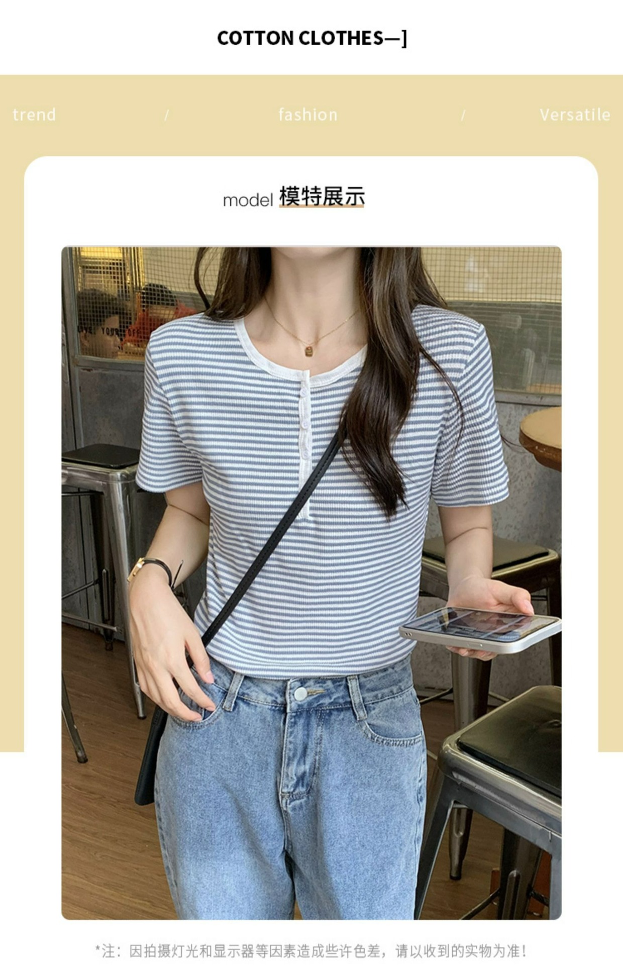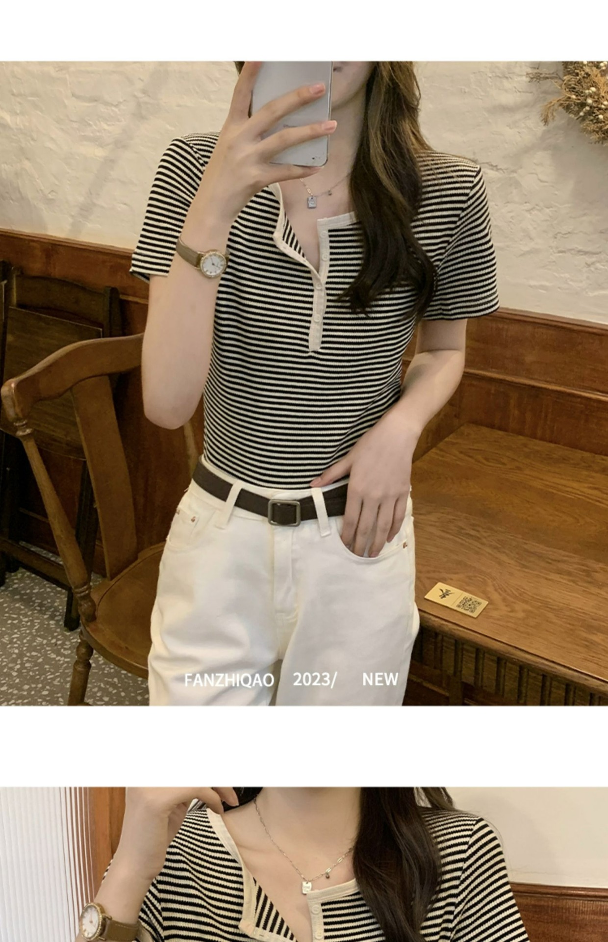 【百搭正肩条纹T恤】港风复古撞色条纹T恤,纽扣半开领设计,时尚百搭。紧身短袖上衣,展现女性迷人身材。夏季必备单品,让你时尚舒适。