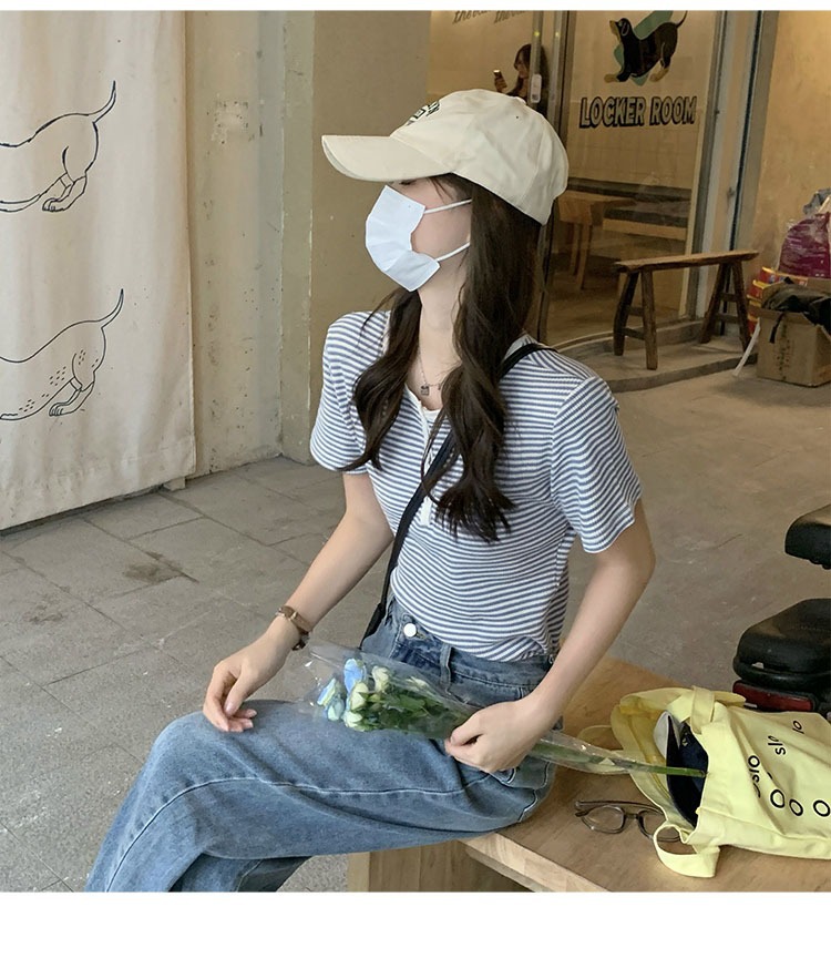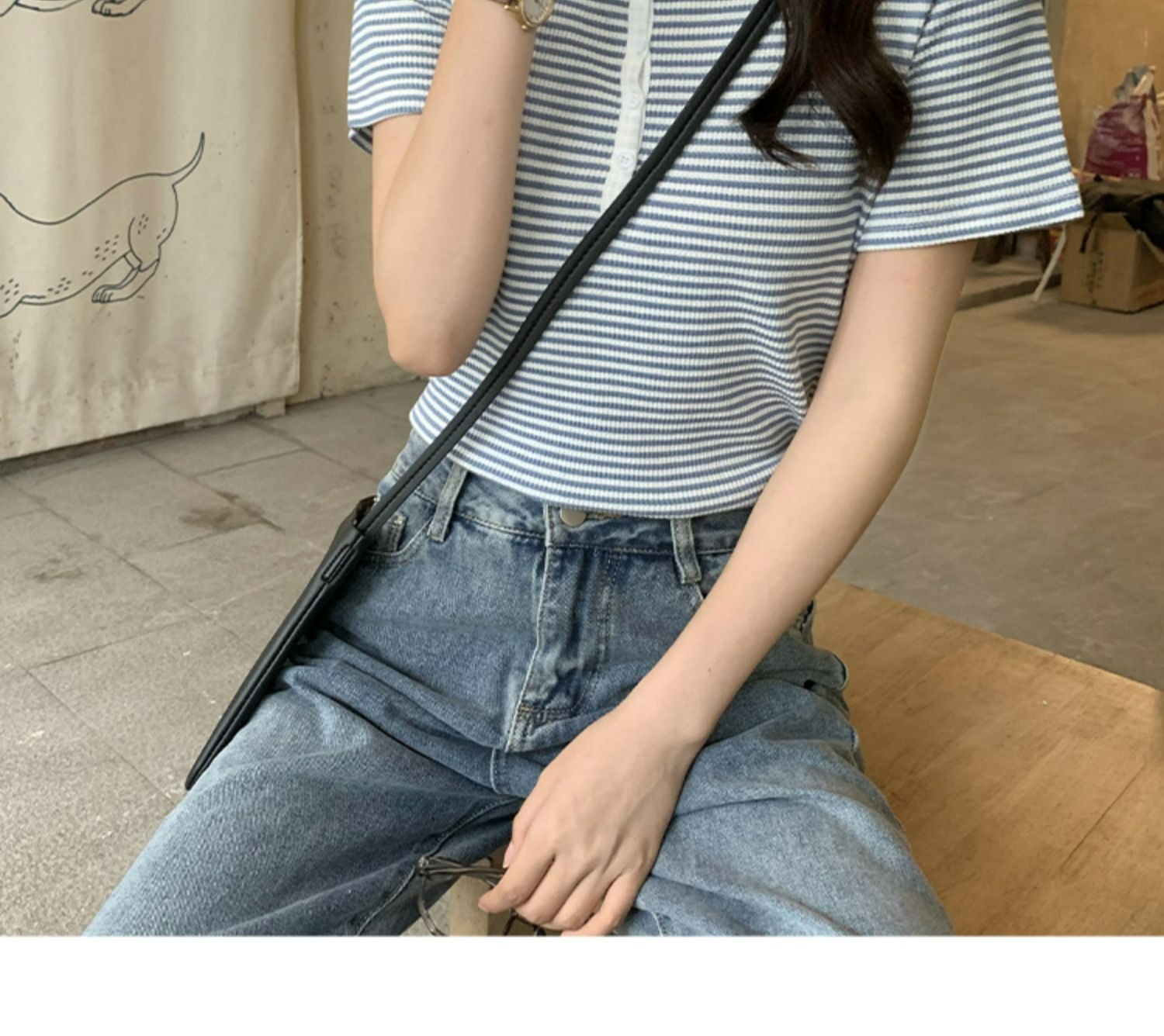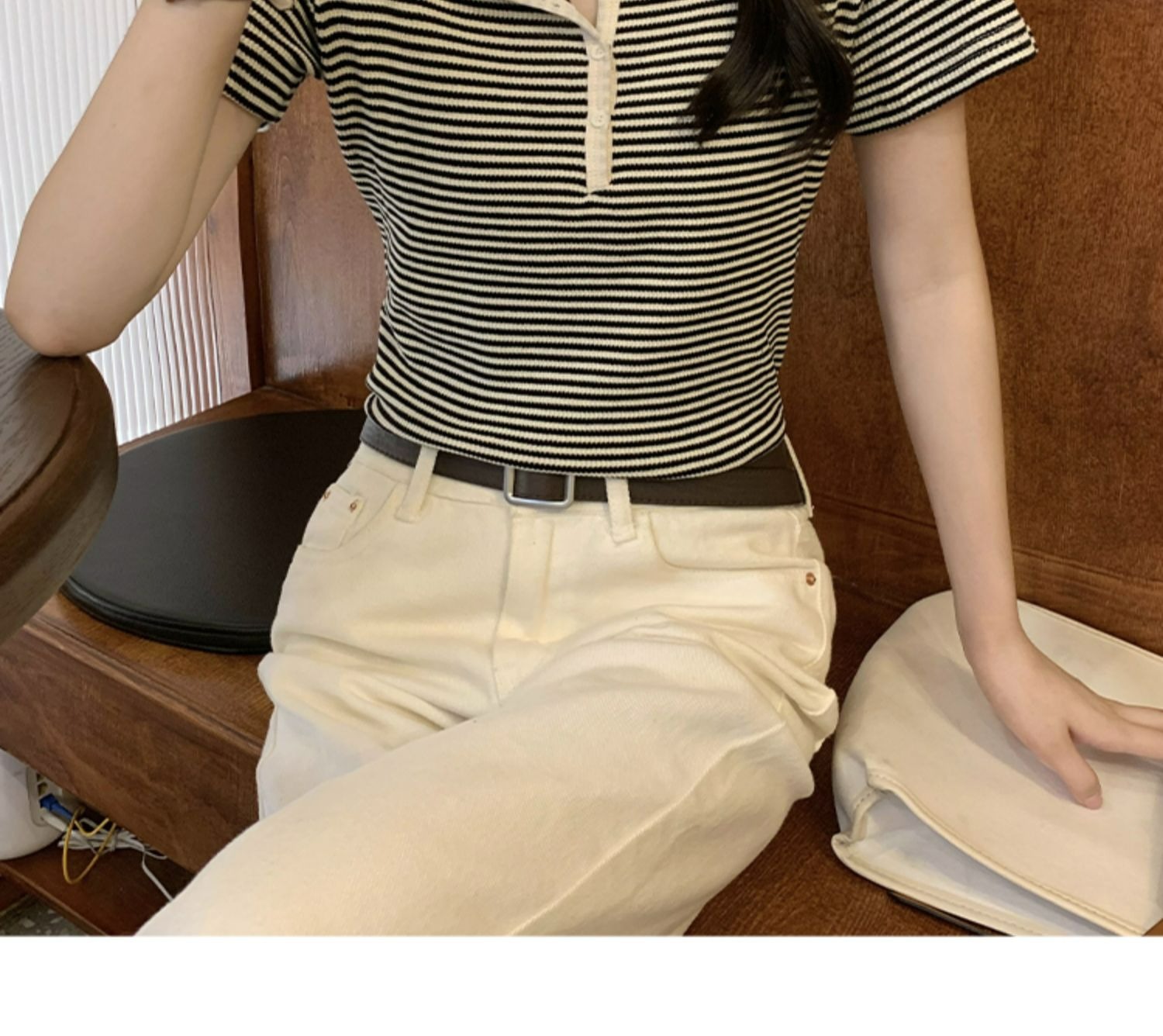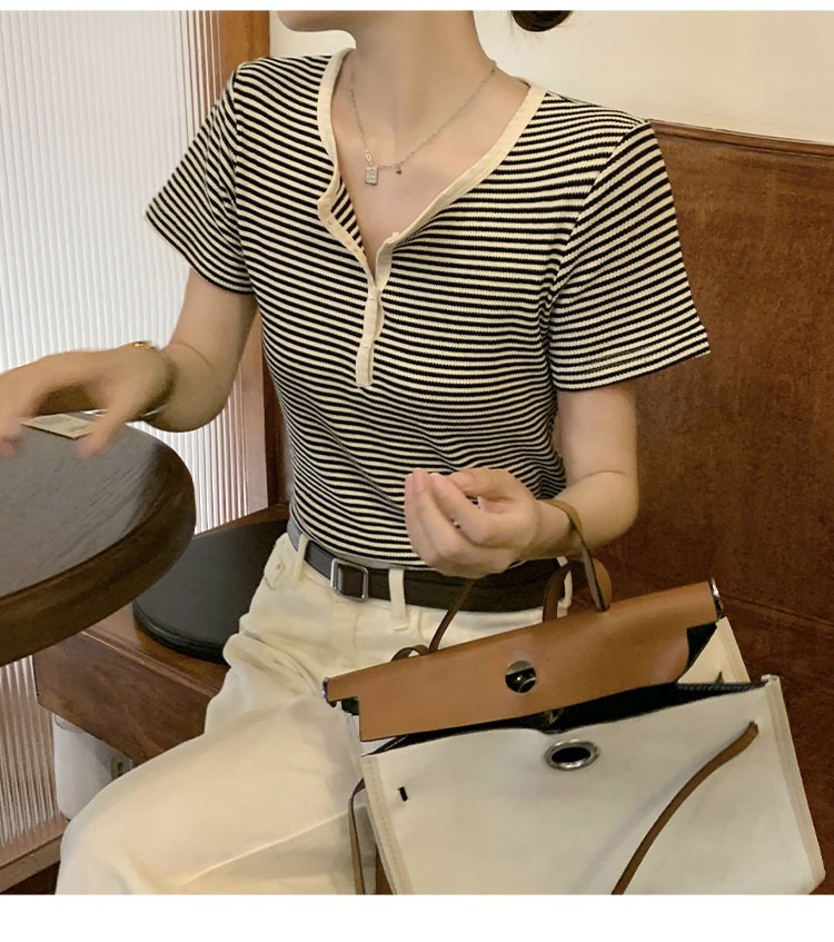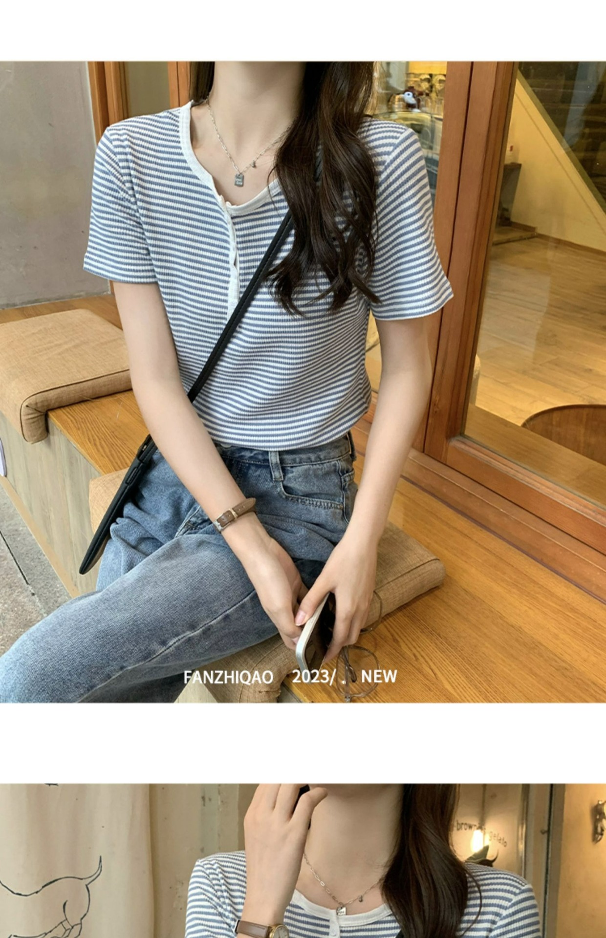 【百搭正肩条纹T恤】港风复古撞色条纹T恤,纽扣半开领设计,时尚百搭。紧身短袖上衣,展现女性迷人身材。夏季必备单品,让你时尚舒适。