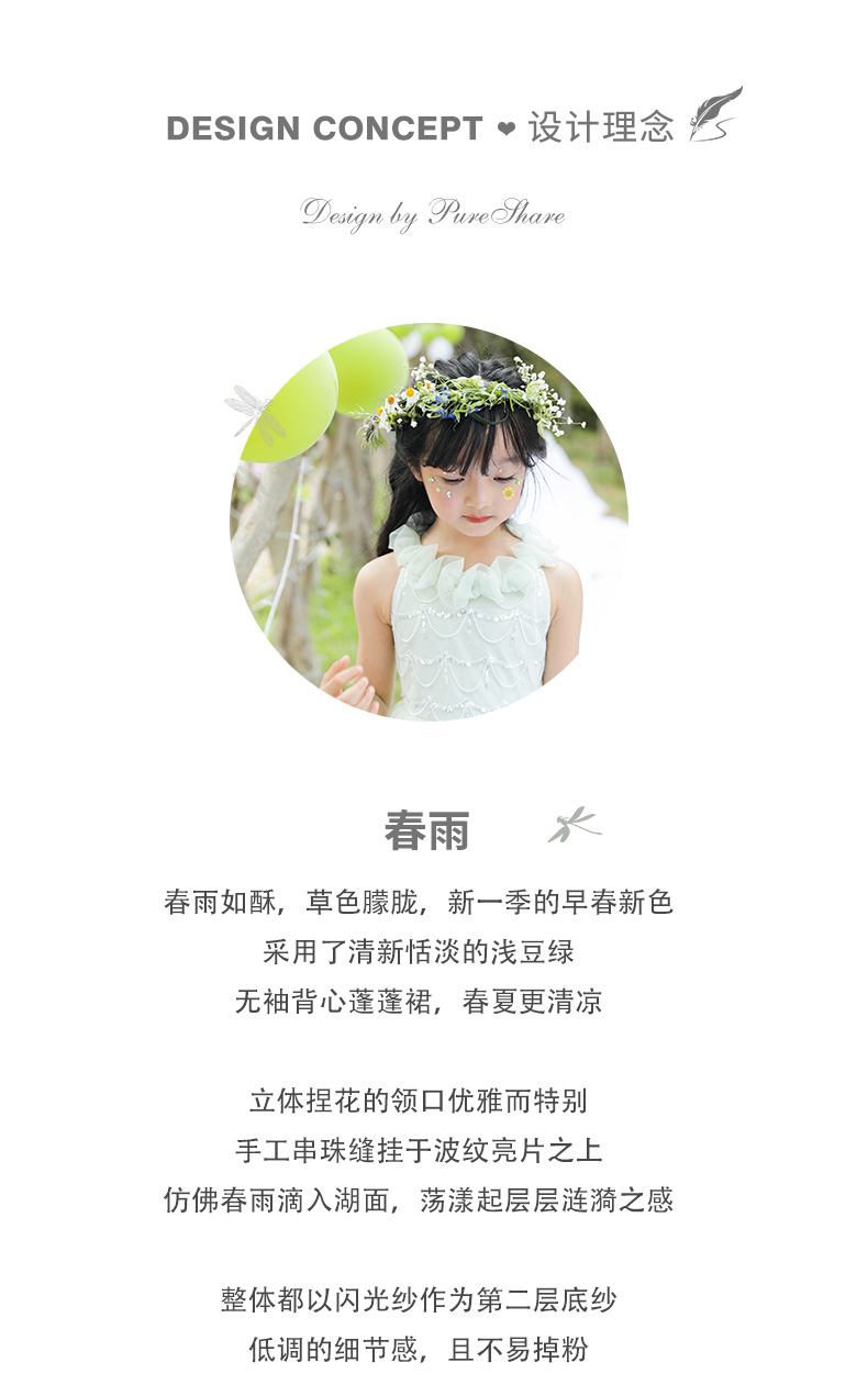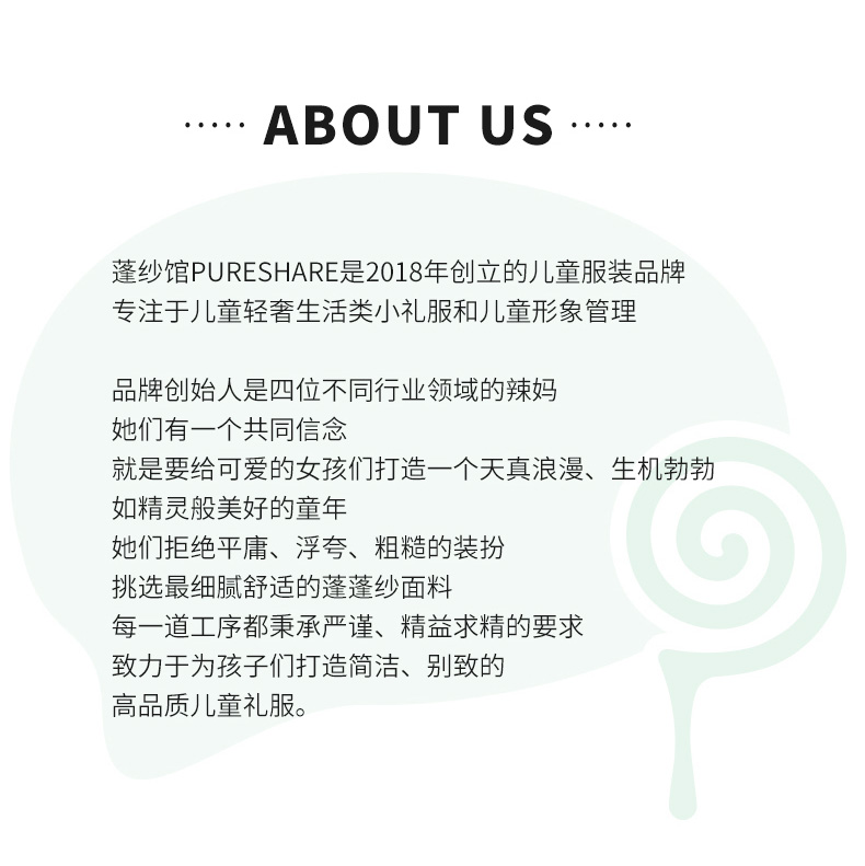 PureShare蓬纱馆,2018年创立的儿童服装品牌,专注于儿童轻奢生活类小礼服,主张“让孩子做最独特的自己”的品牌理念,为孩子们提供时尚简洁、优雅而又不失童真的生活类礼服。
