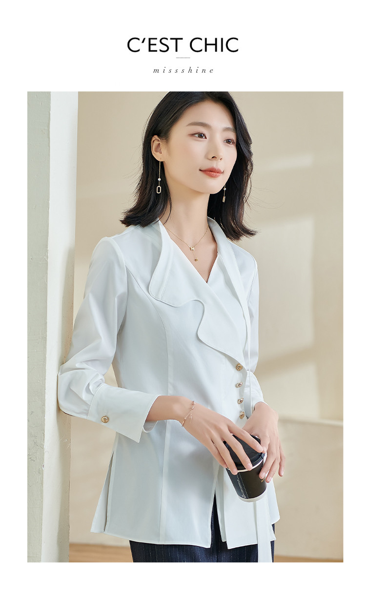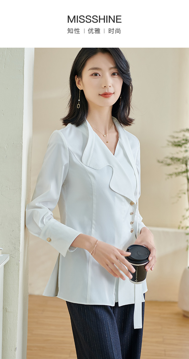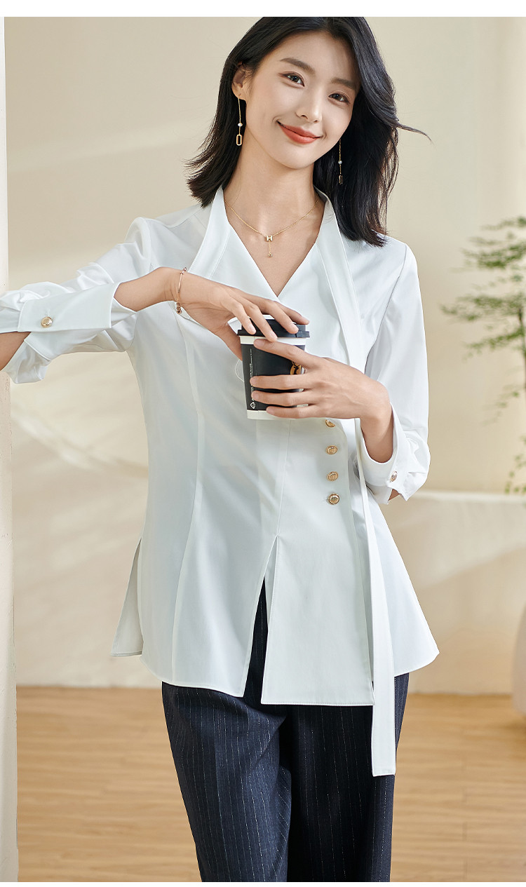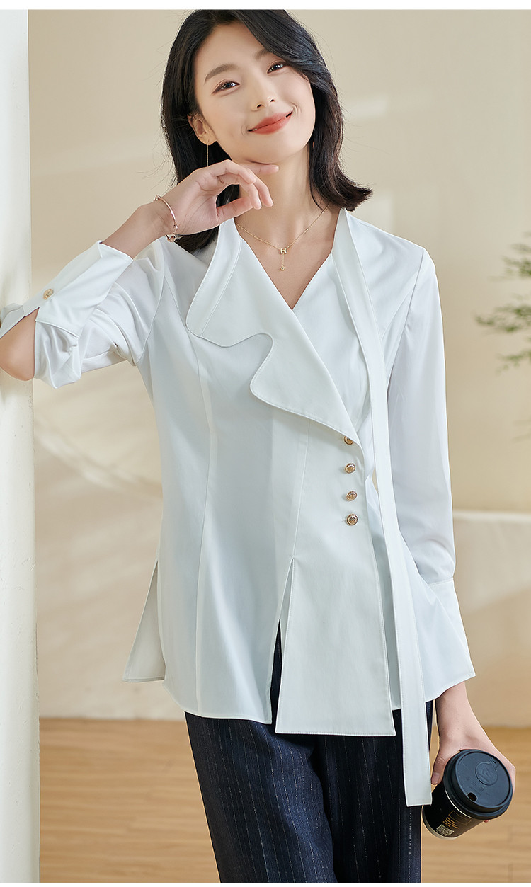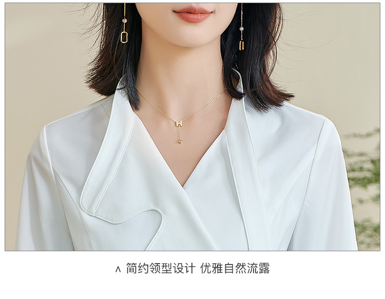 米思阳2024春季新款时尚设计感白色衬衫飘带不规则v领上衣女0240