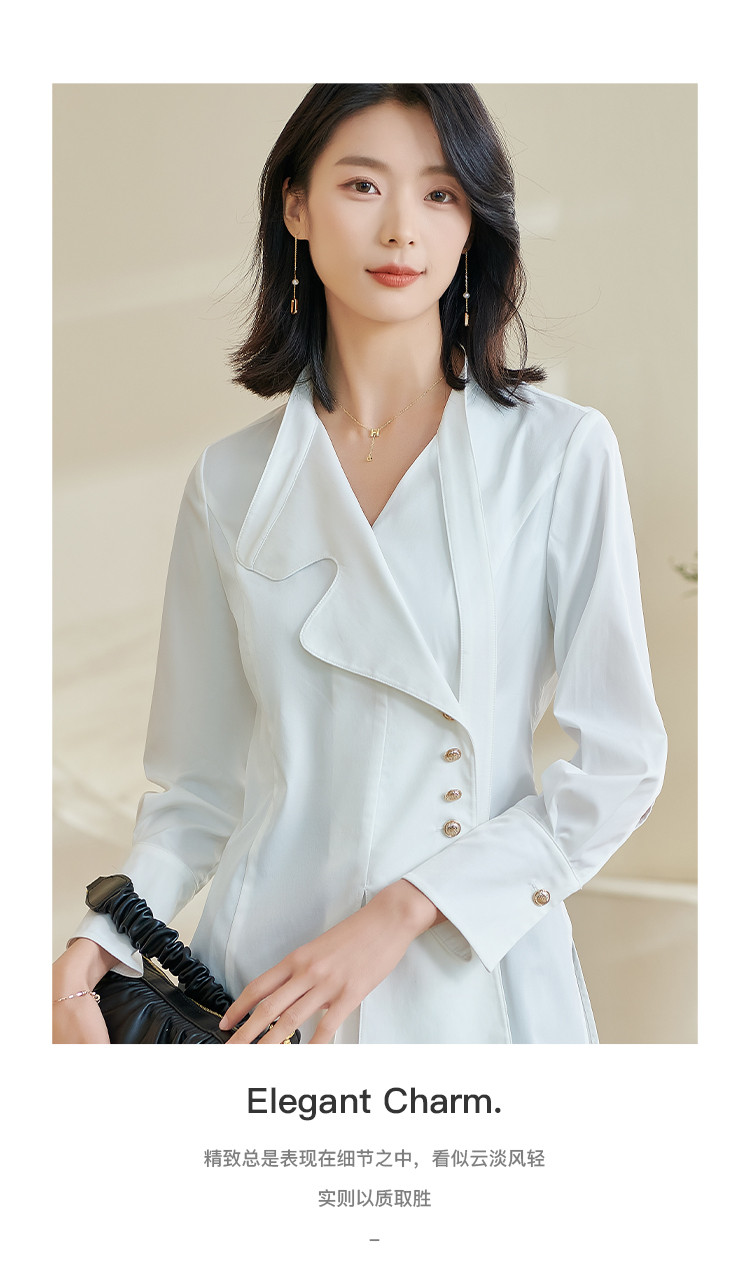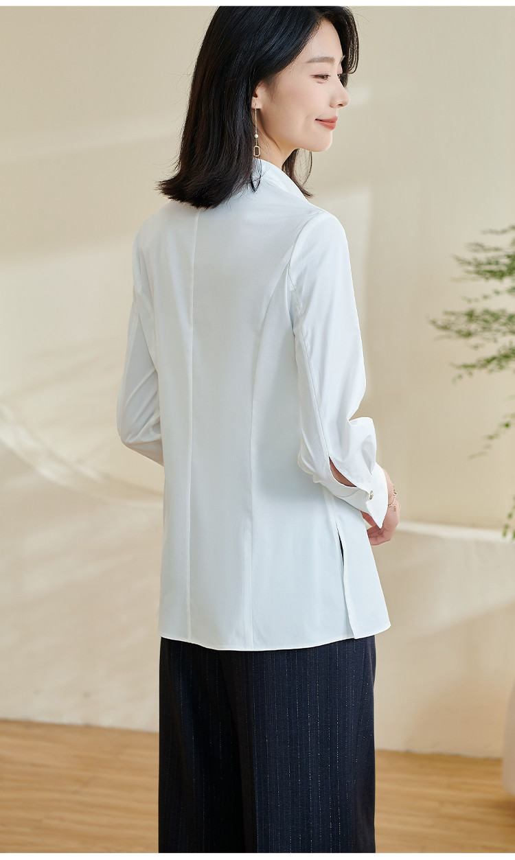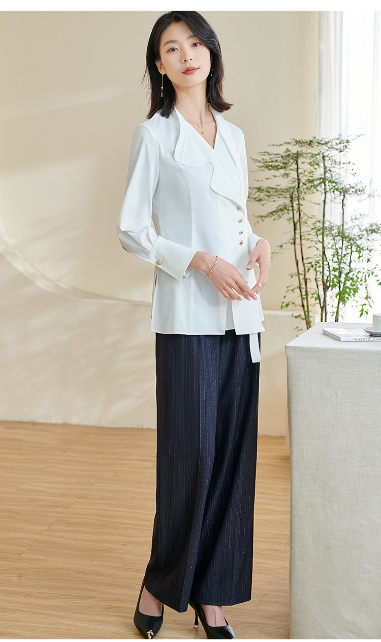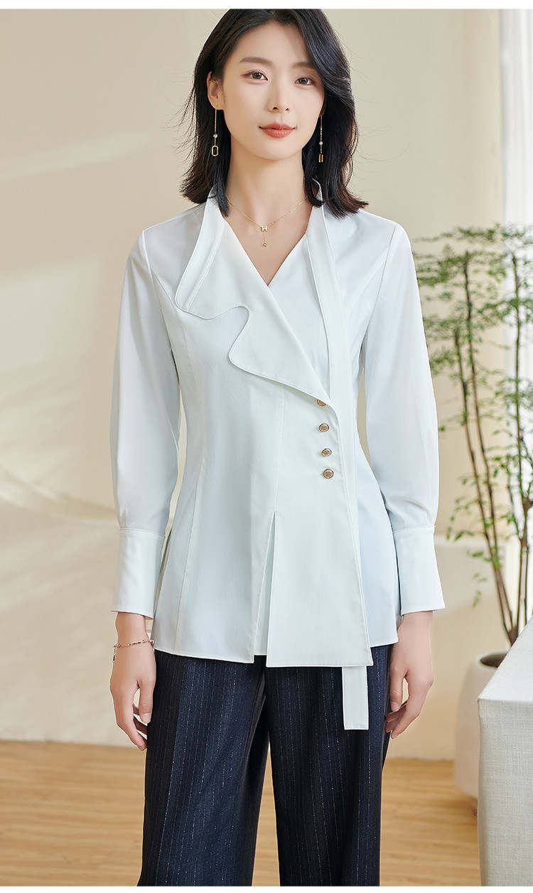 米思阳2024春季新款时尚设计感白色衬衫飘带不规则v领上衣女0240