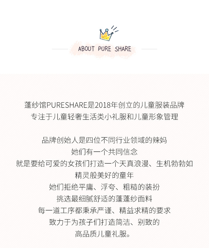PureShare蓬纱馆,2018年创立的儿童服装品牌,专注于儿童轻奢生活类小礼服,主张“让孩子做最独特的自己”的品牌理念,为孩子们提供时尚简洁、优雅而又不失童真的生活类礼服。