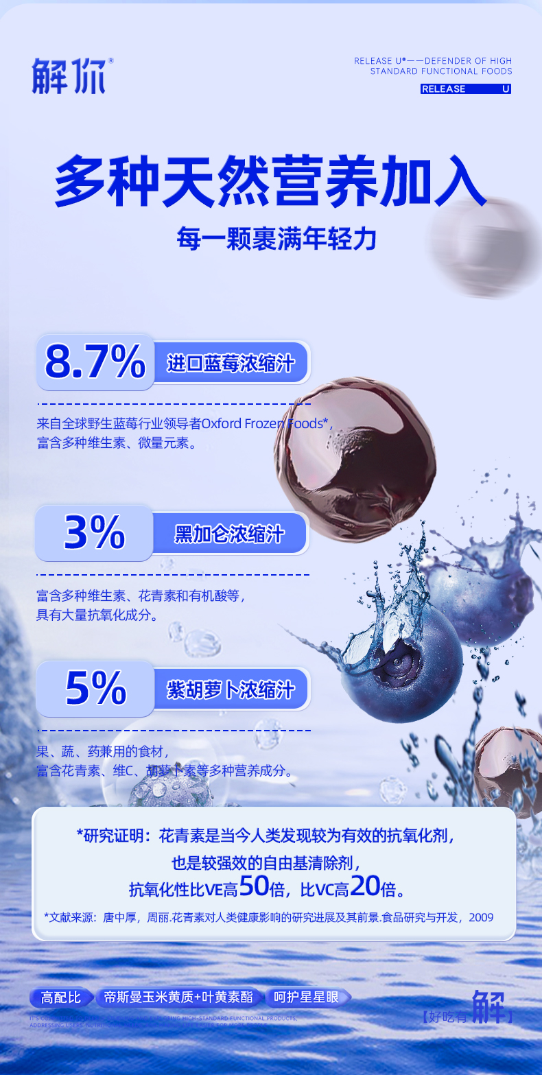👉一颗软糖补足多种果蔬营养:蓝莓浓缩汁、紫胡萝卜浓缩汁、黑加仑浓缩汁