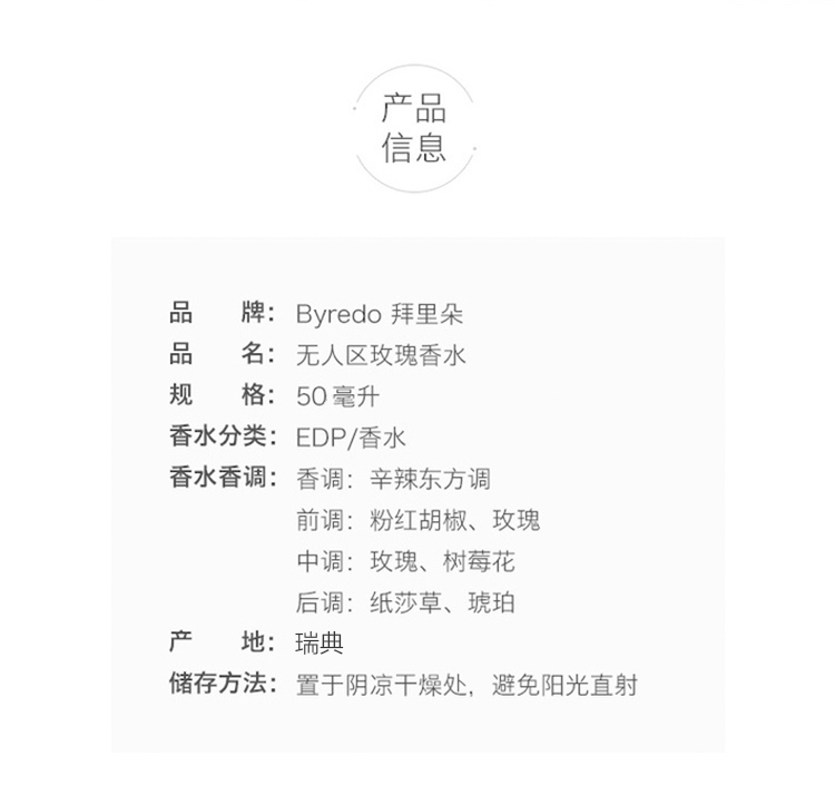 【香港直邮】瑞典BYREDO百瑞德无人区玫瑰女士香水 EDP50ML
