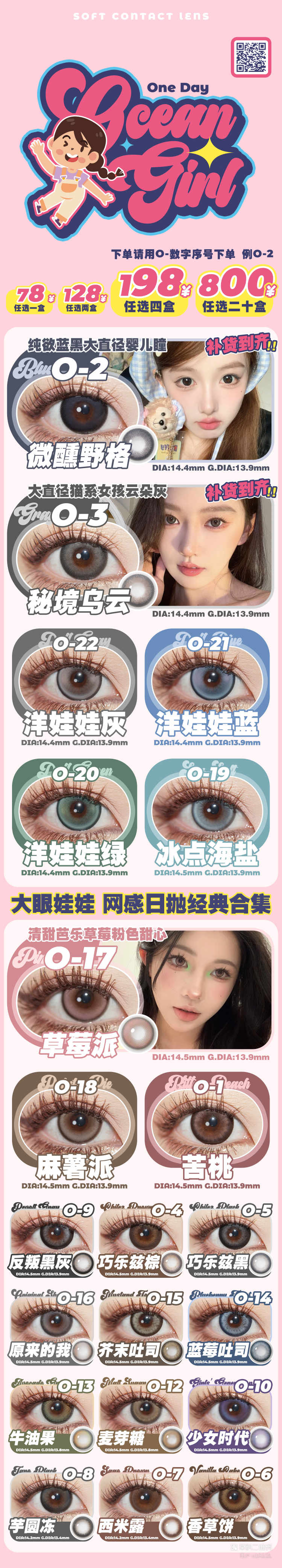 OceanGirl日抛活动·0-800度(无525/575)·微醺野格&秘境乌云&洋娃娃&冰点海盐&草莓派&麻薯派&苦桃&反叛黑灰&巧乐兹&原来的我&芥末吐司&蓝莓吐司&牛油果&麦芽糖&少女时代 等