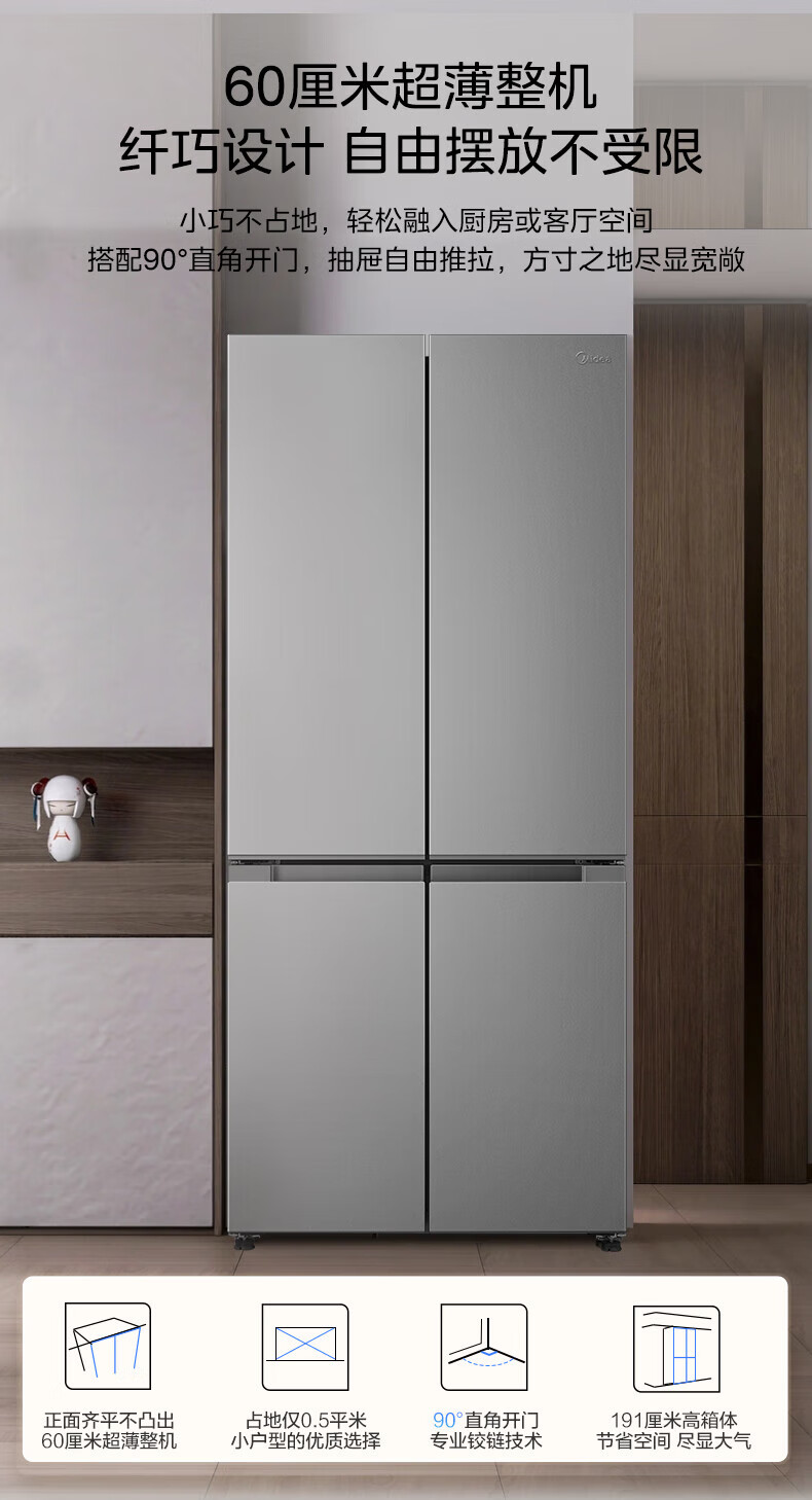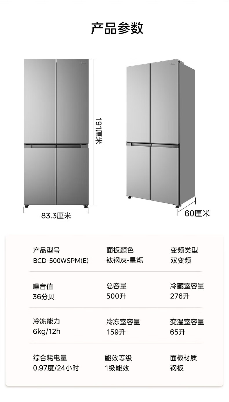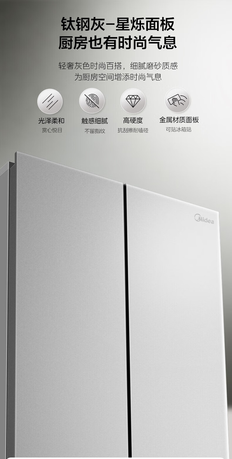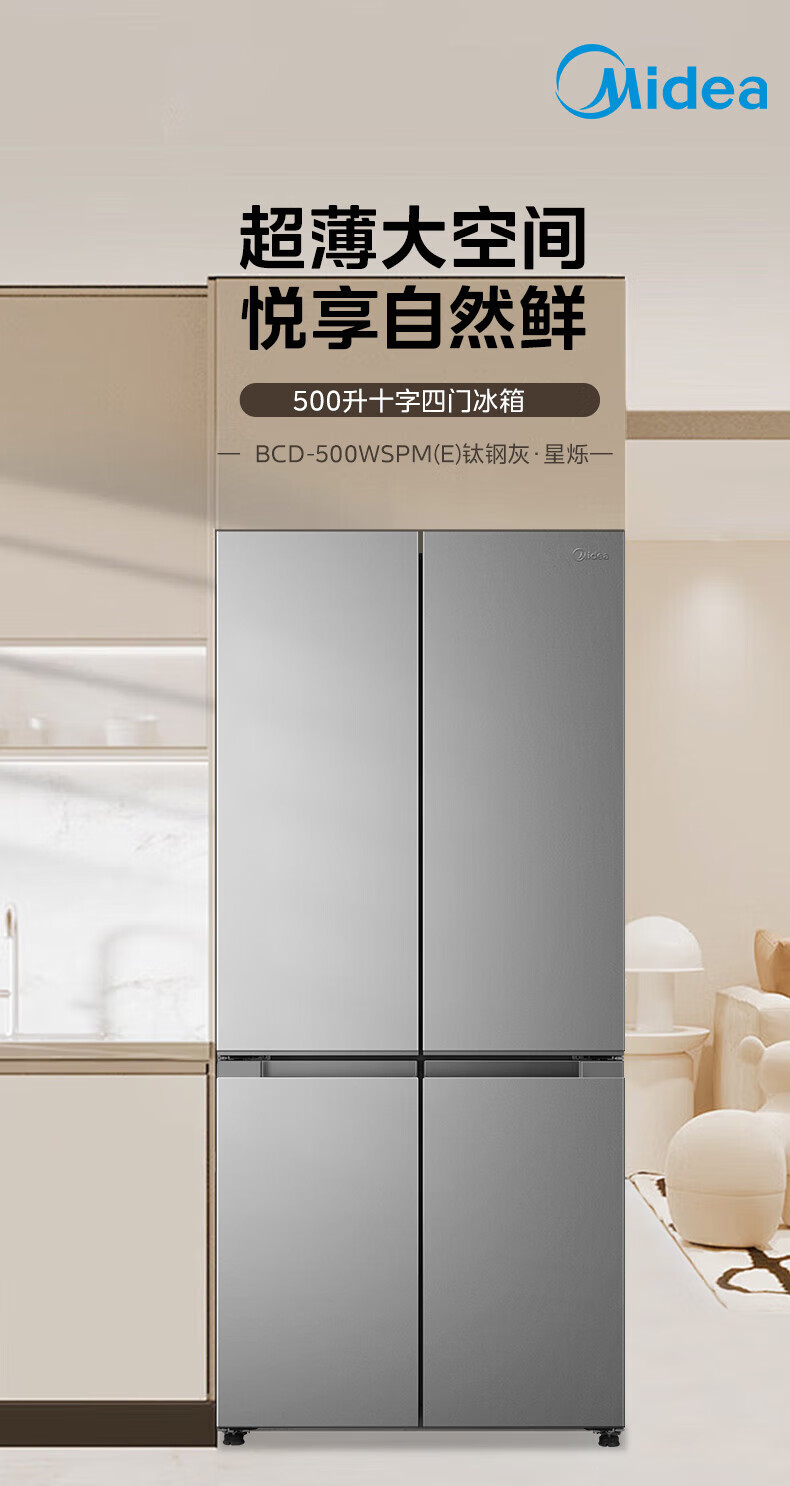 美的冰箱 BCD-500WSPM(E) 500升十字对开门超薄大容量冰箱 一级能效 全空间净味 双变频风冷无霜 钛钢灰