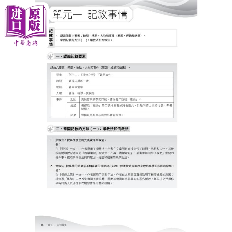 每个单元均设语文知识要点,范围涵盖描写文、记叙文、说明文、文言实词虚词、文言句式等,让学生在进行练习前建立相关的文体概念和写作手法等语文知识储备库。学生可掌握该年级所要学的语文知识,再运用单元所设的精选阅读练习进行实战