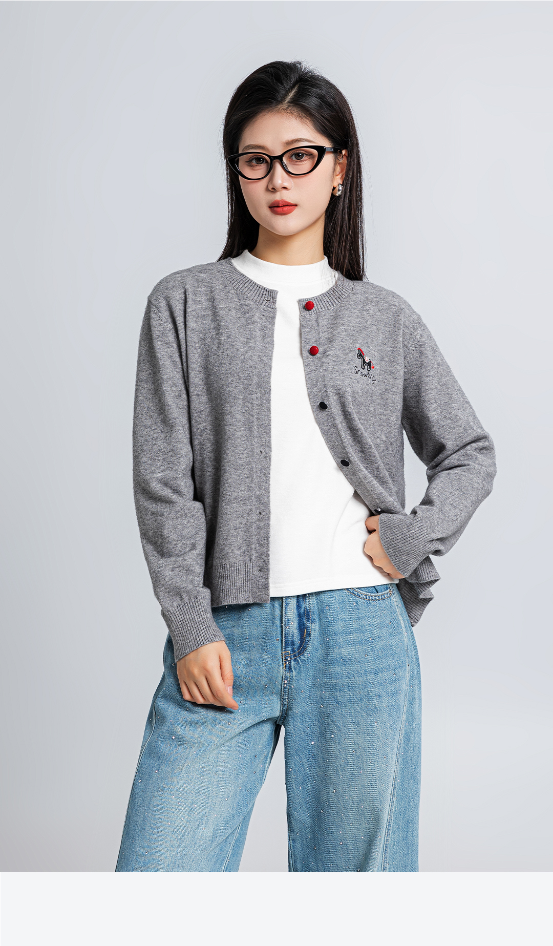 春上新软糯亲肤趣味刺绣撞色纽扣圆领灰色毛衣1261020