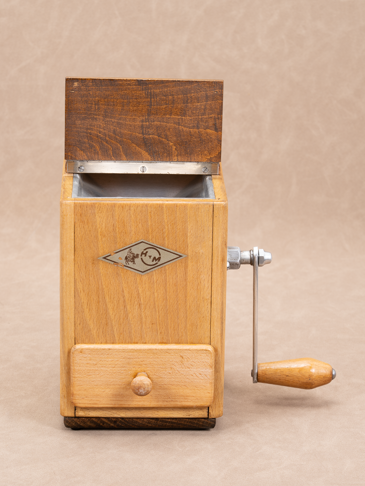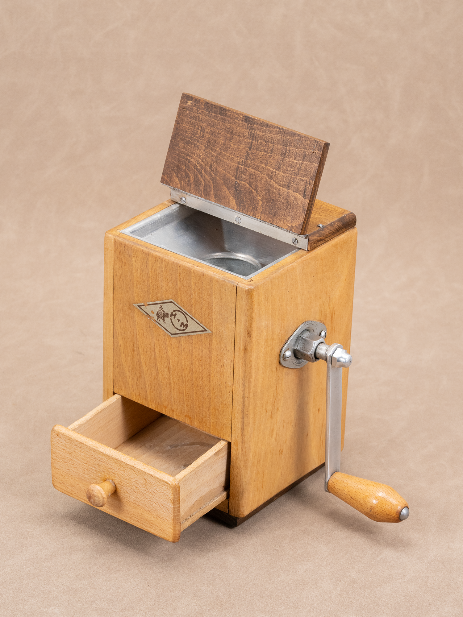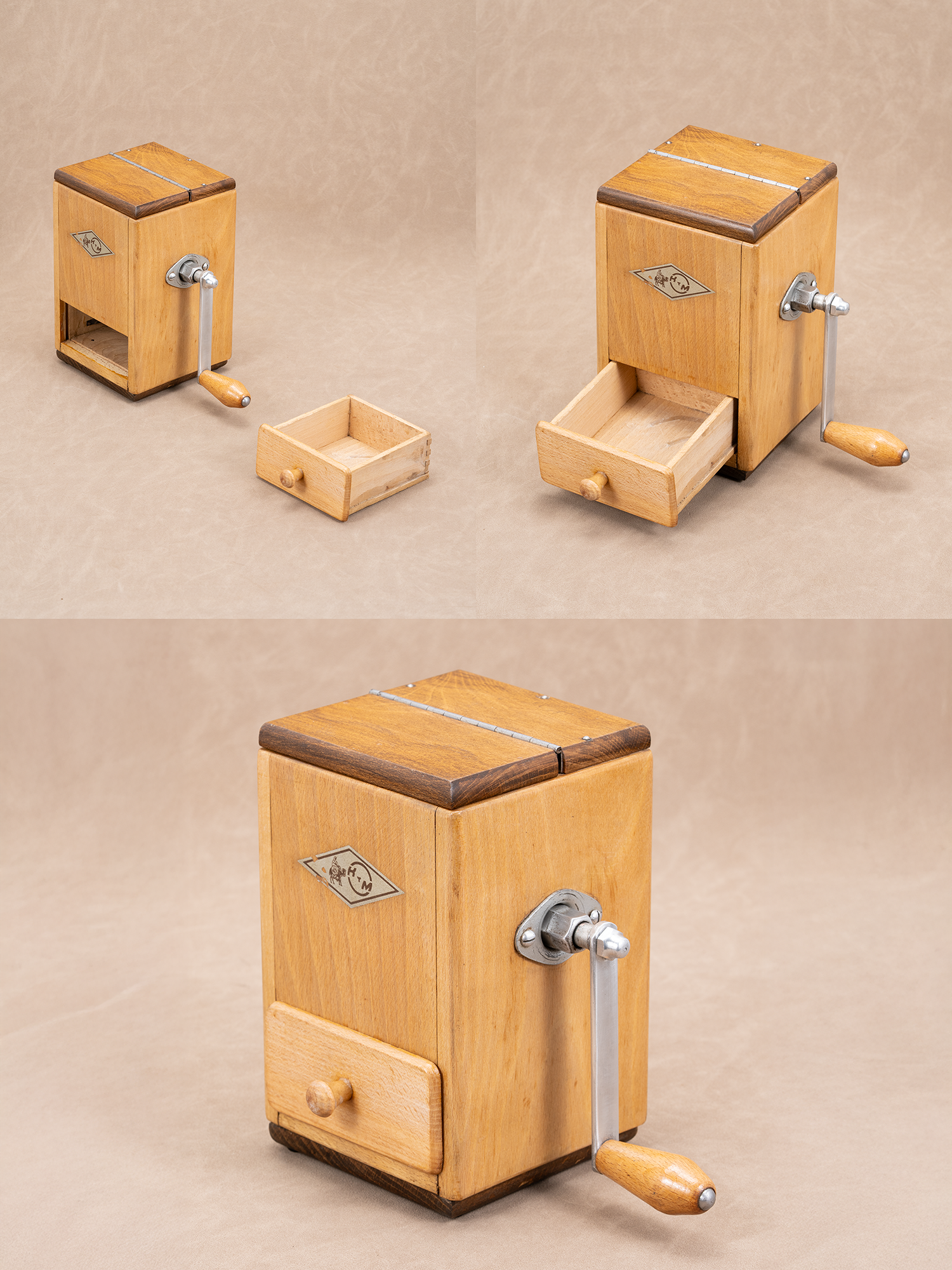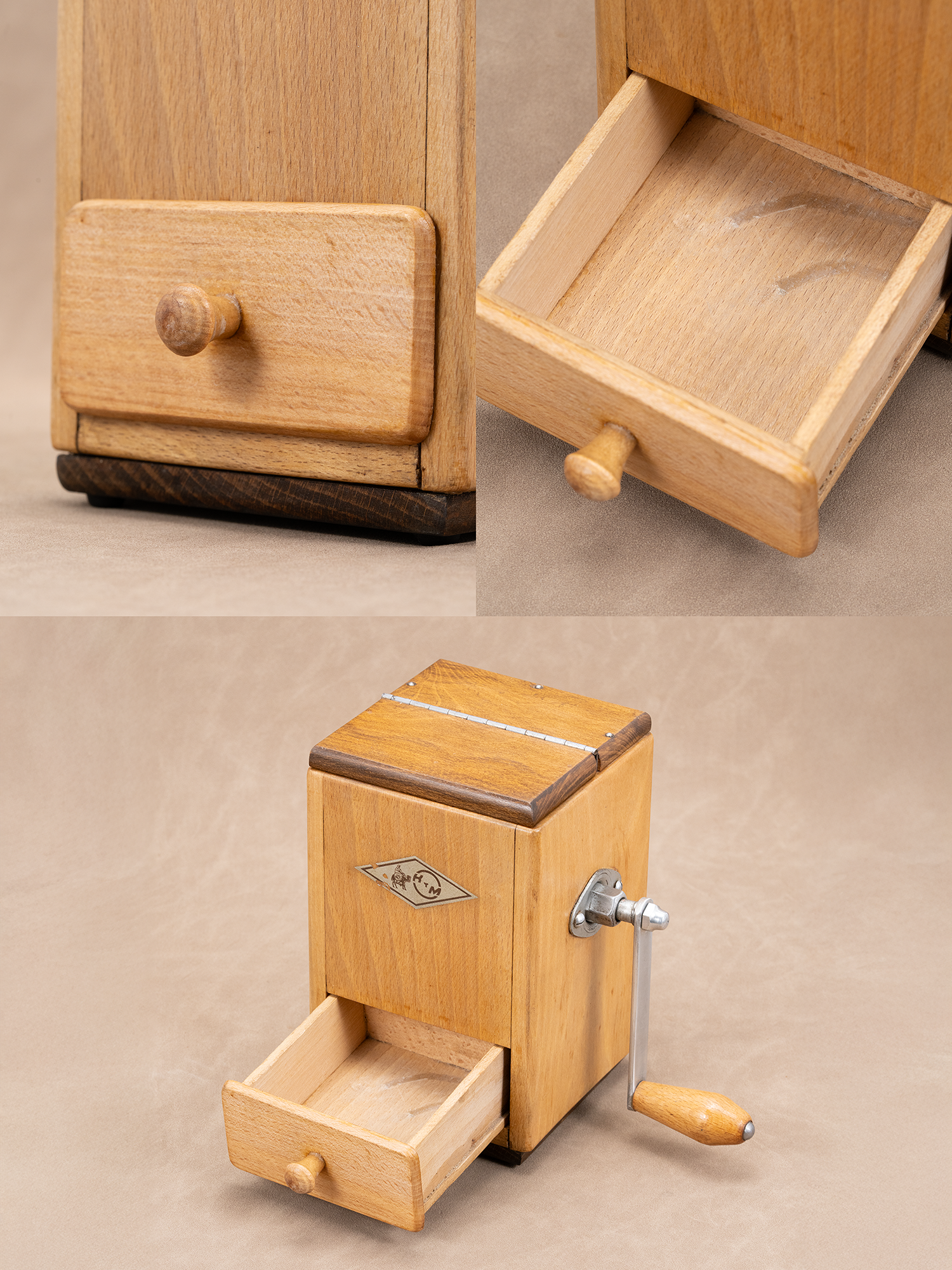 历经80年历史之久,此款 KyM 手摇磨豆机整体品相上乘,有正常使用痕迹。抽屉内部留有胶印痕迹,正面菱形 LOGO 标识有自然脱落现象(符合该有的岁月痕迹),整体保养的非常好。此款手摇磨豆机,适合手冲咖啡。
