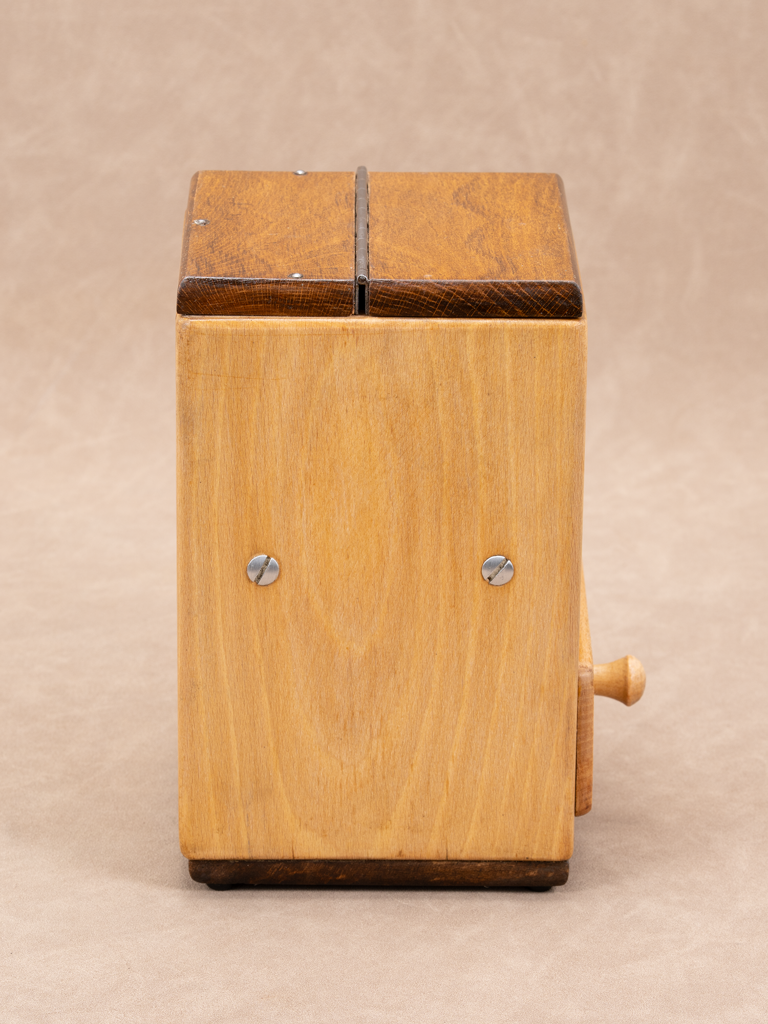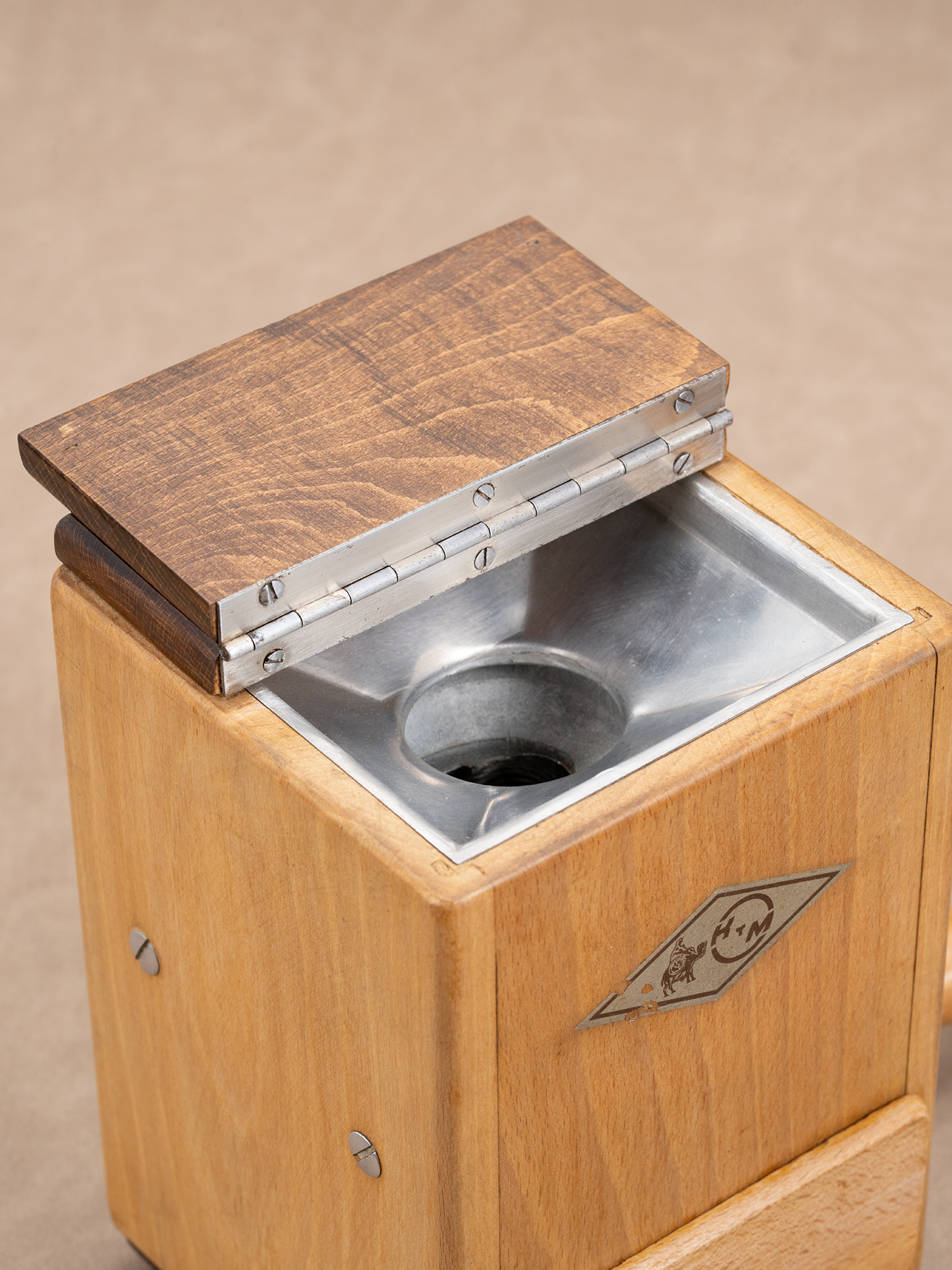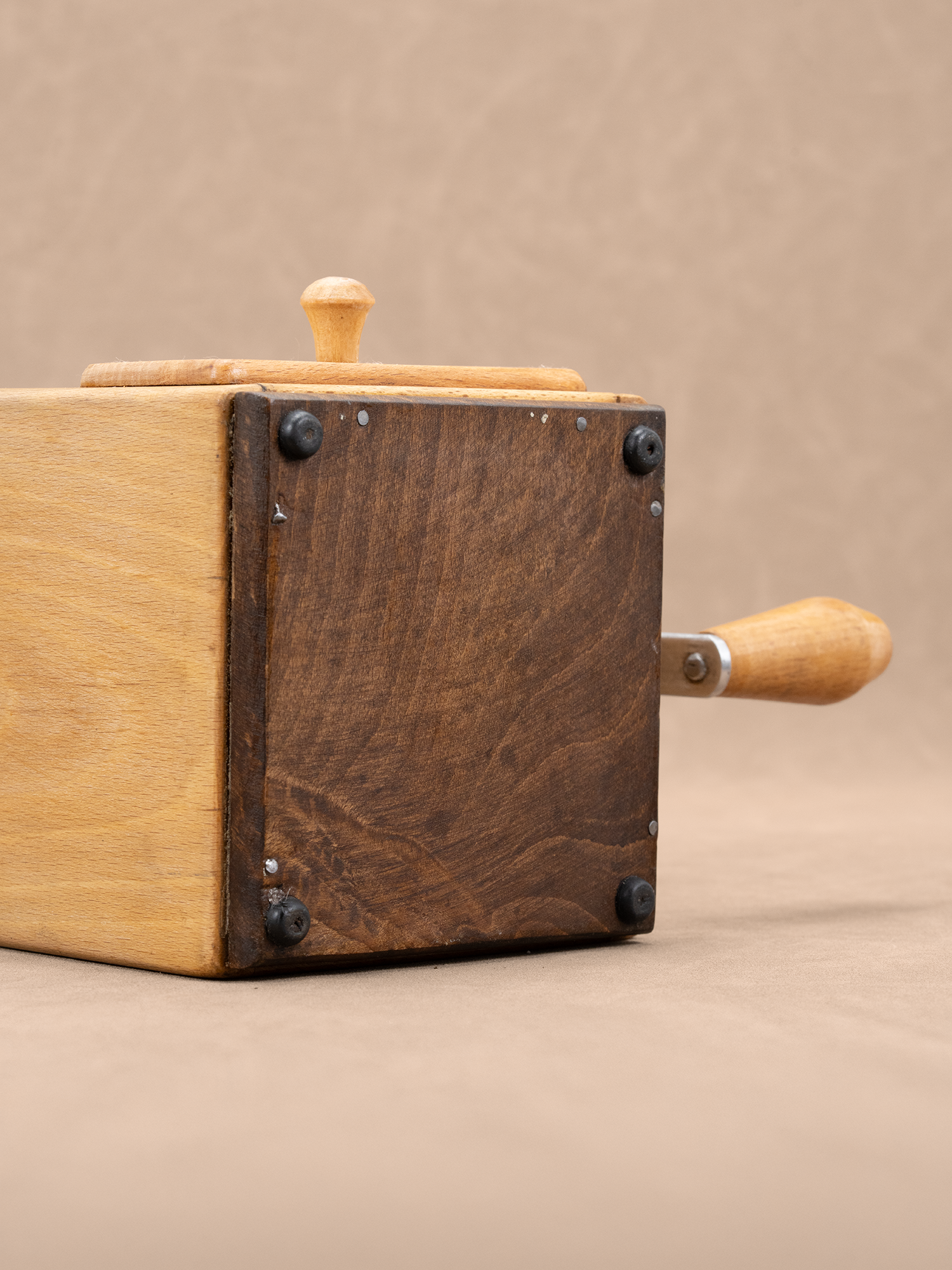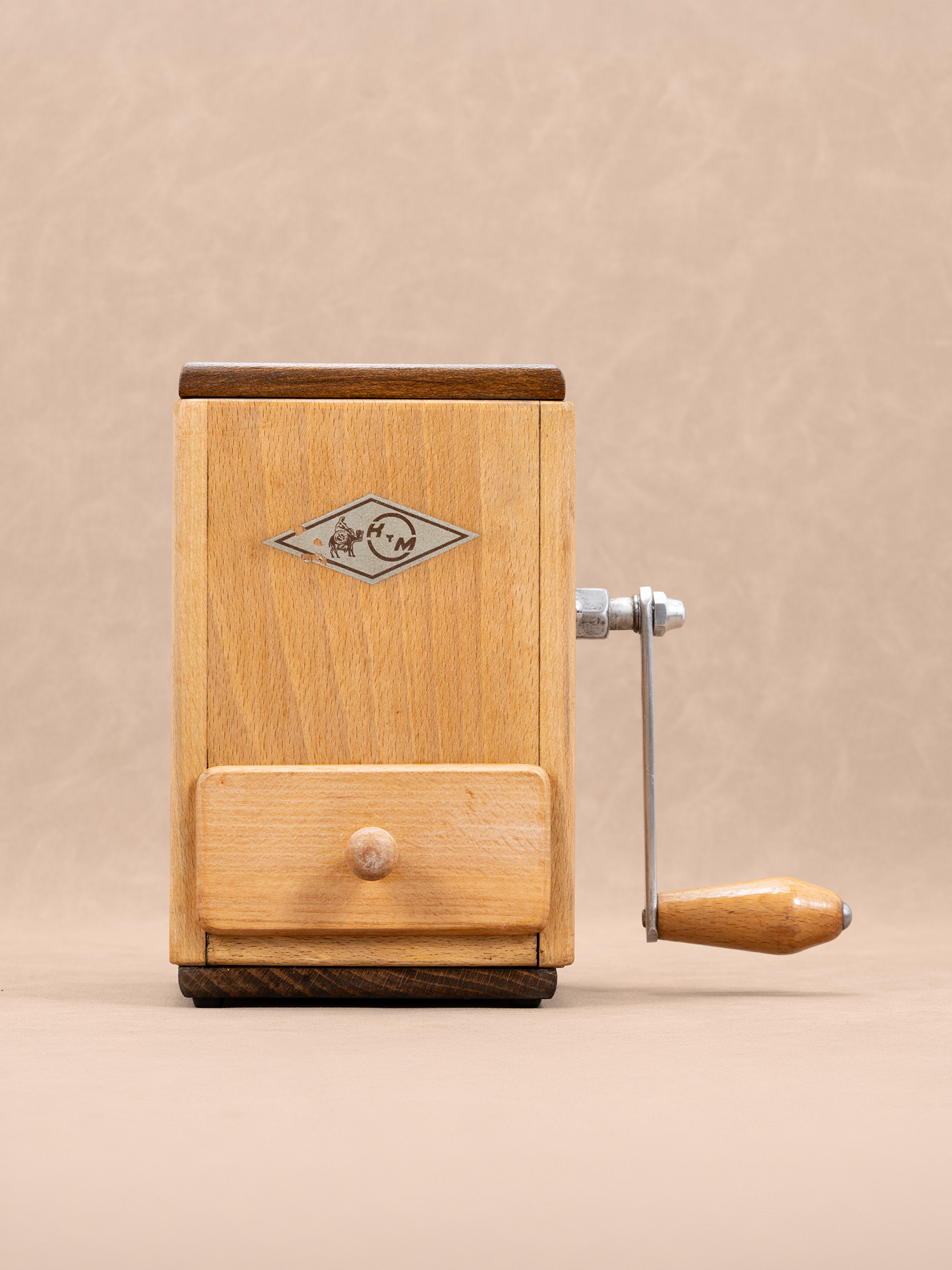 历经80年历史之久,此款 KyM 手摇磨豆机整体品相上乘,有正常使用痕迹。抽屉内部留有胶印痕迹,正面菱形 LOGO 标识有自然脱落现象(符合该有的岁月痕迹),整体保养的非常好。此款手摇磨豆机,适合手冲咖啡。