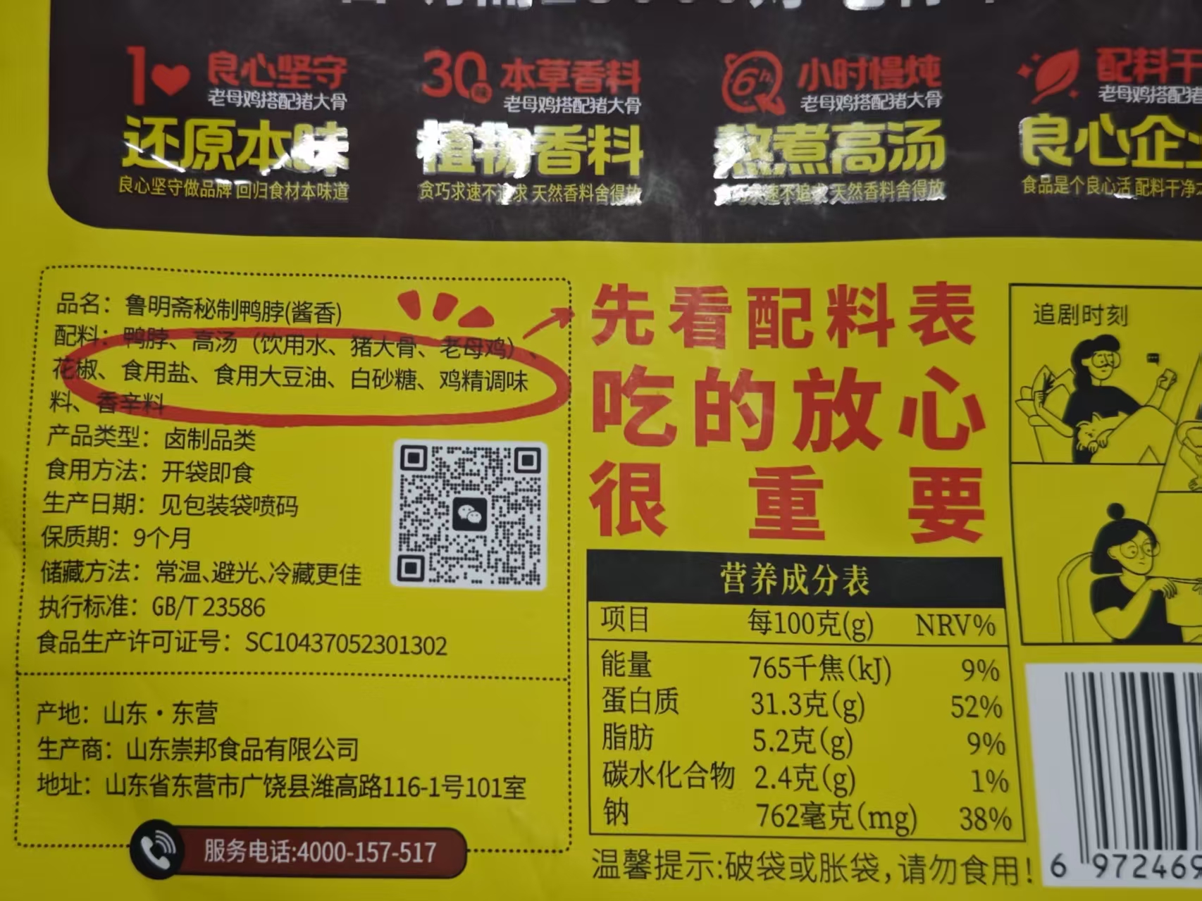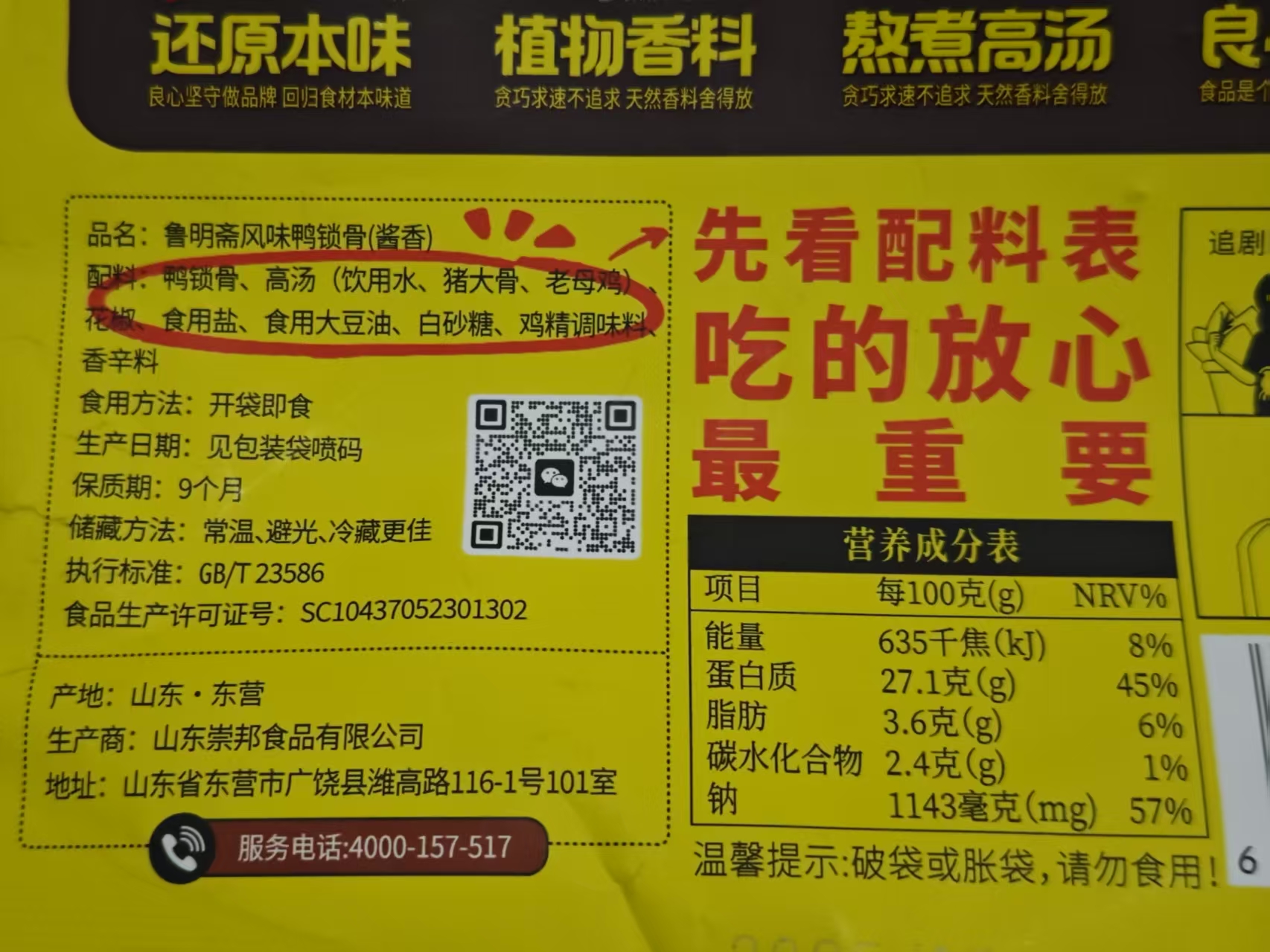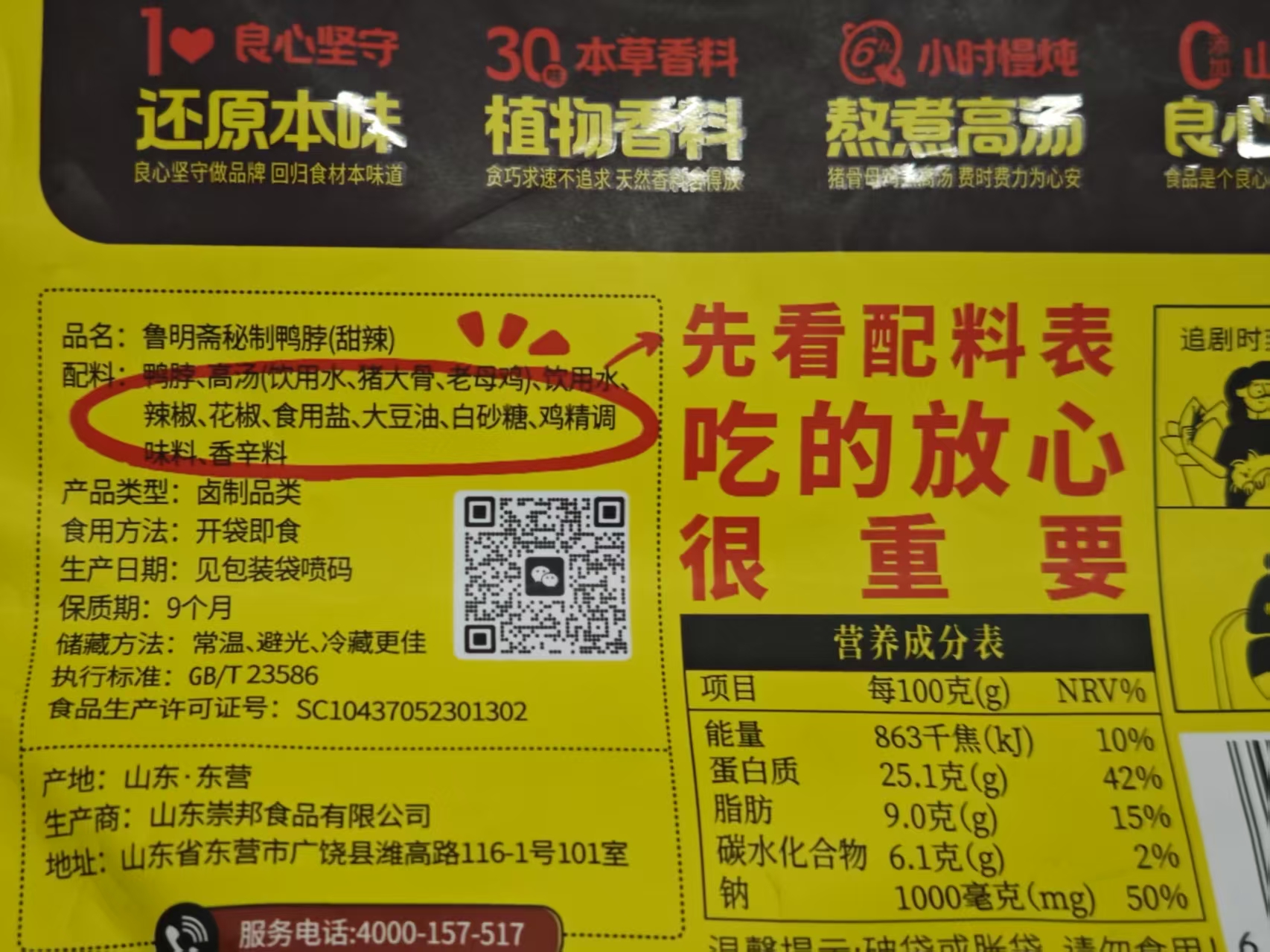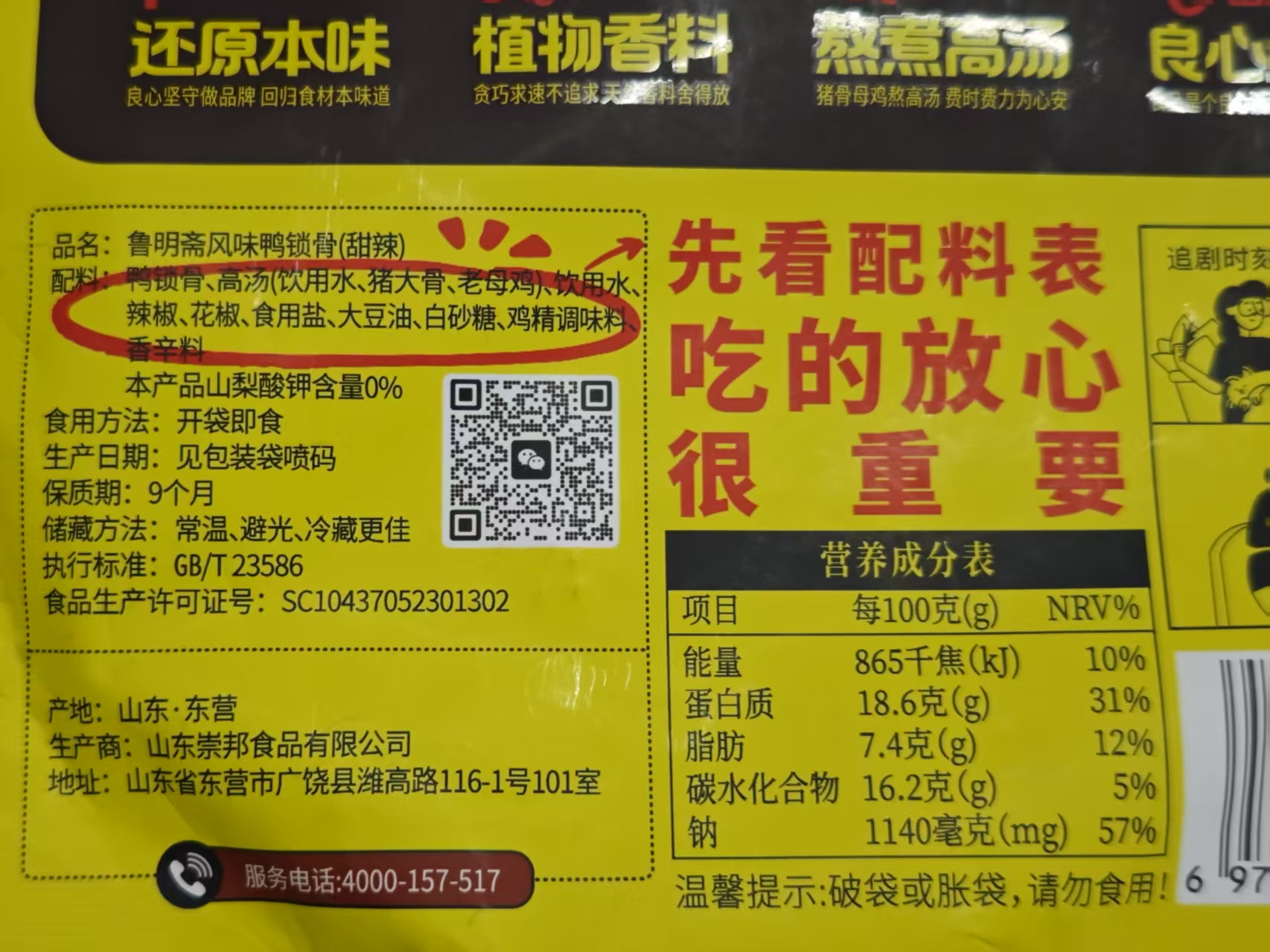 高汤笨猪蹄:猪蹄、高汤(饮用水、猪大骨、老母鸡)、饮用水、食用盐,酿造酱油(含焦糖色)、大豆油、白砂糖、花椒、八角、冰糖、味精、香辛料,本产品山梨酸钾含量0%