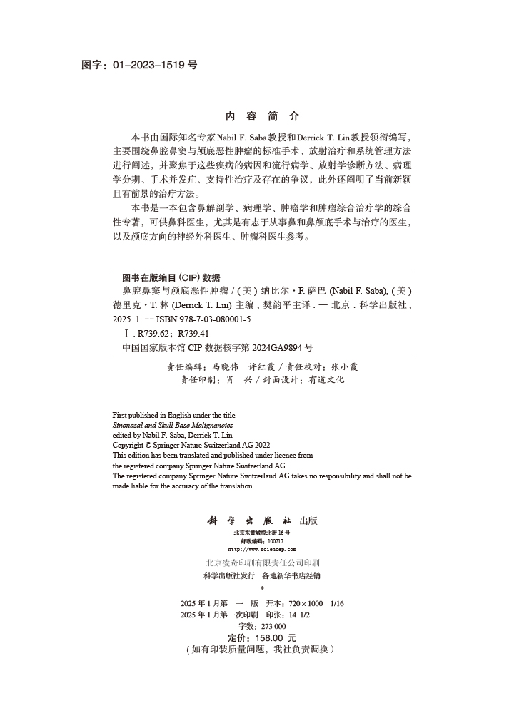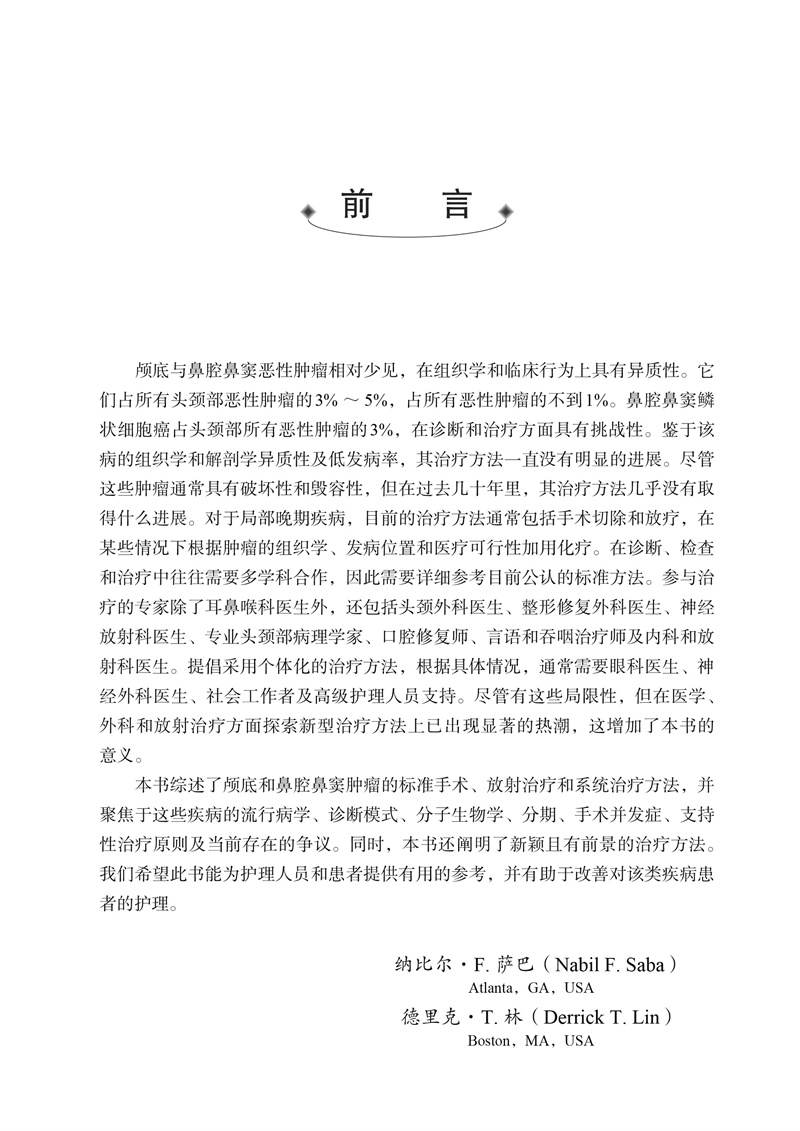 本书由国际知名专家Nabil F.Saba教授和Derrick T.Lin教授领衔编写,主要围绕鼻腔鼻窦与颅底恶性肿瘤的标准手术、放射治疗和系统管理方法进行阐述,并聚焦于这些疾病的病因和流行病学、放射学诊断方法、病理学分期、手术并发症、支持性治疗及存在的争议,此外还阐明了当前新颖且有前景的治疗方法。